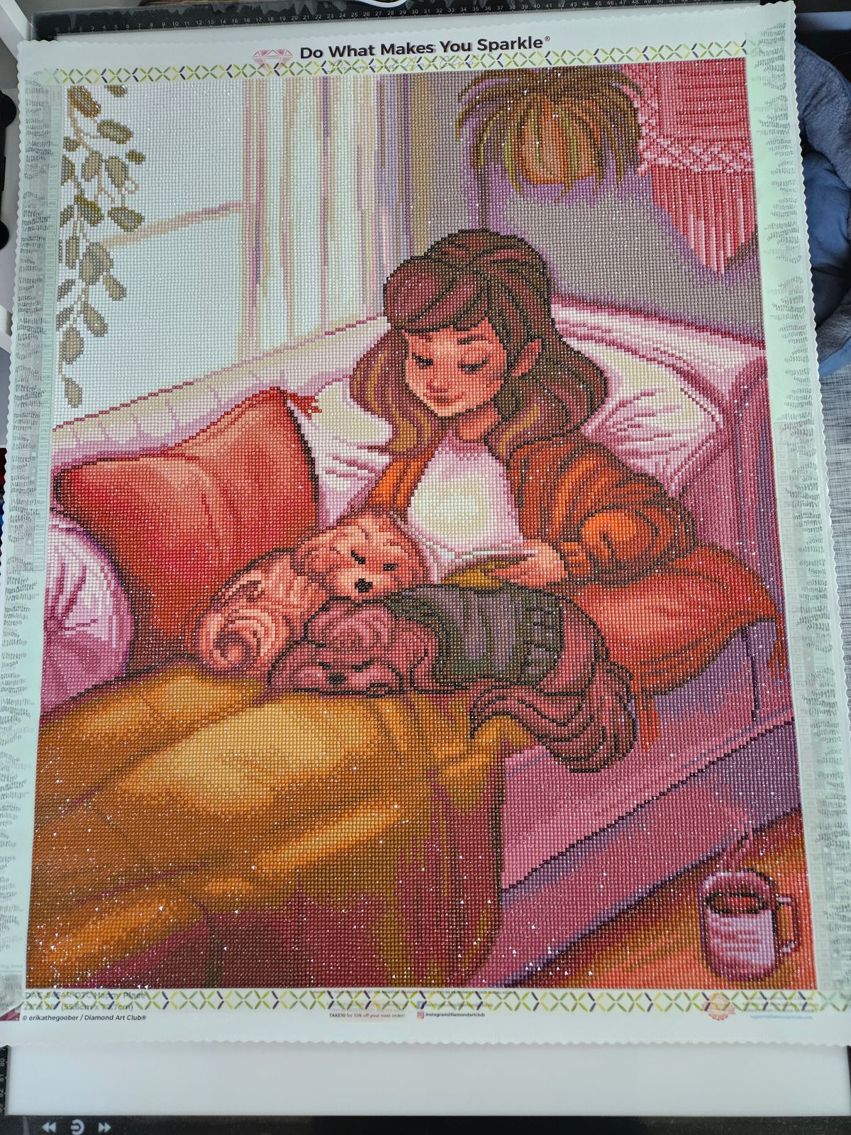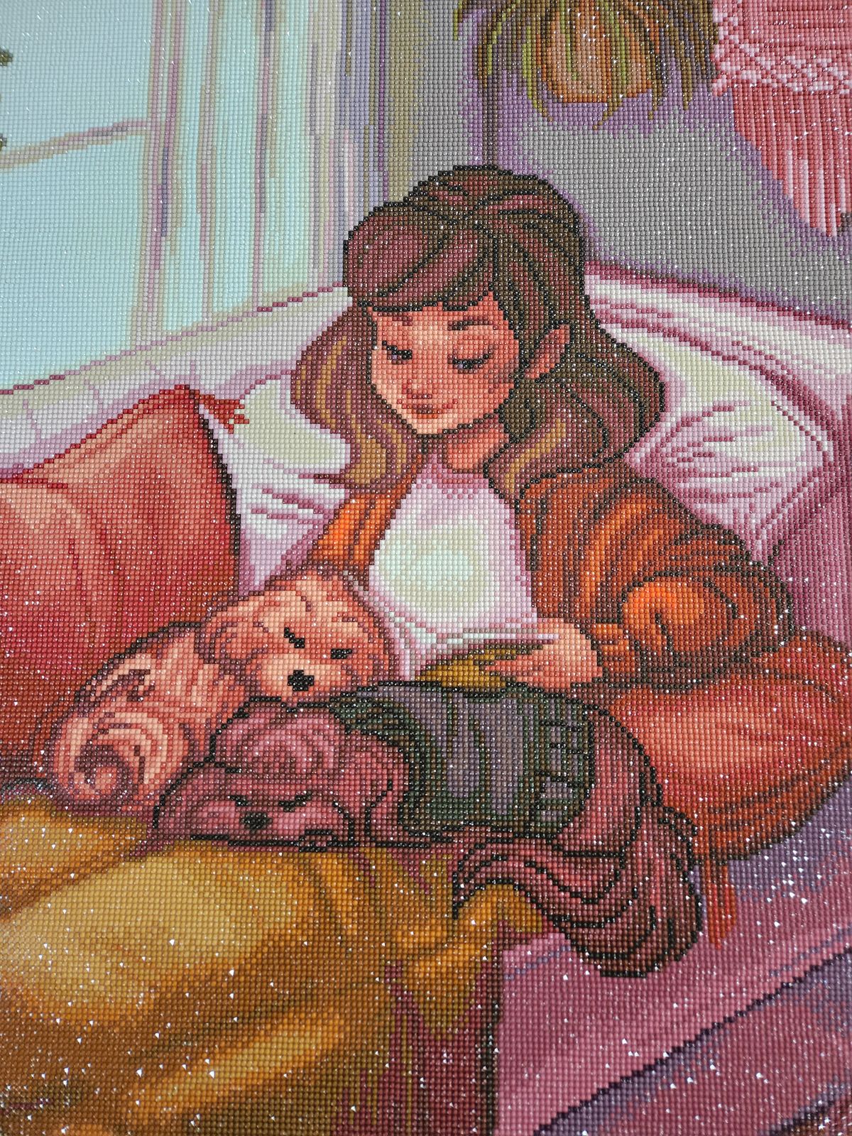 I adore this picture. The round drills were great, with little trash. The rounds also lended themselves to the softness of the picture. This is truly my happy place. Sitting with my fur babies and reading a good book. I did this in about 10 days.