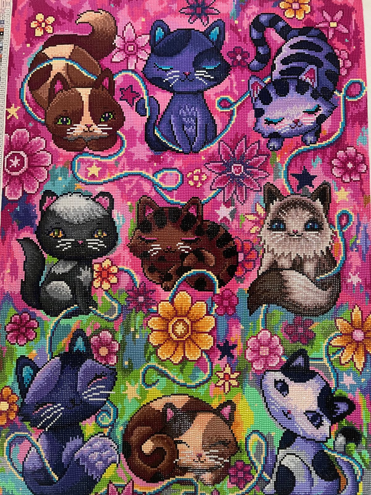 I chose to separate it into 3 sections and work the background first, then the cats. Then the opposite in the second section. For the last, I worked it from right to left and in smaller sections.