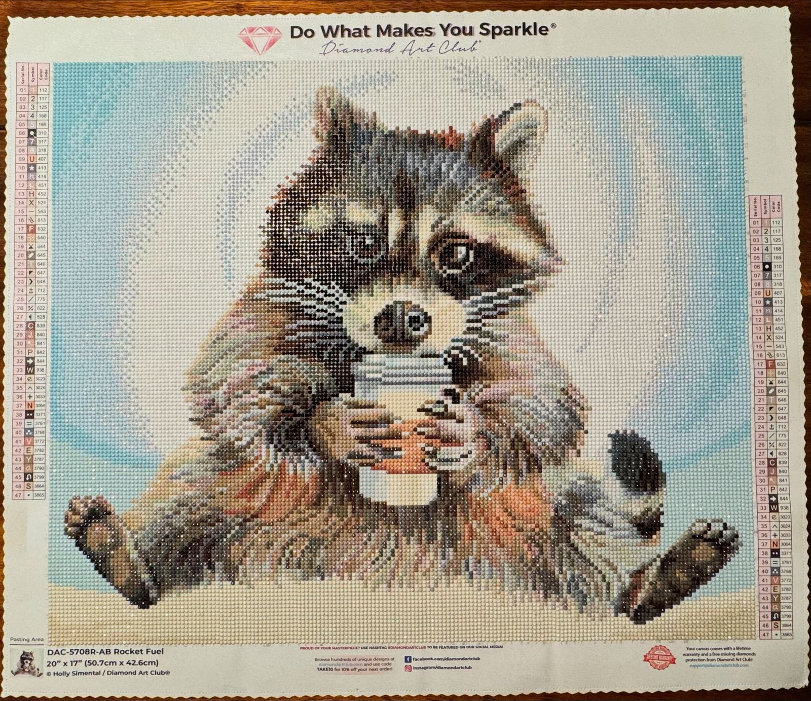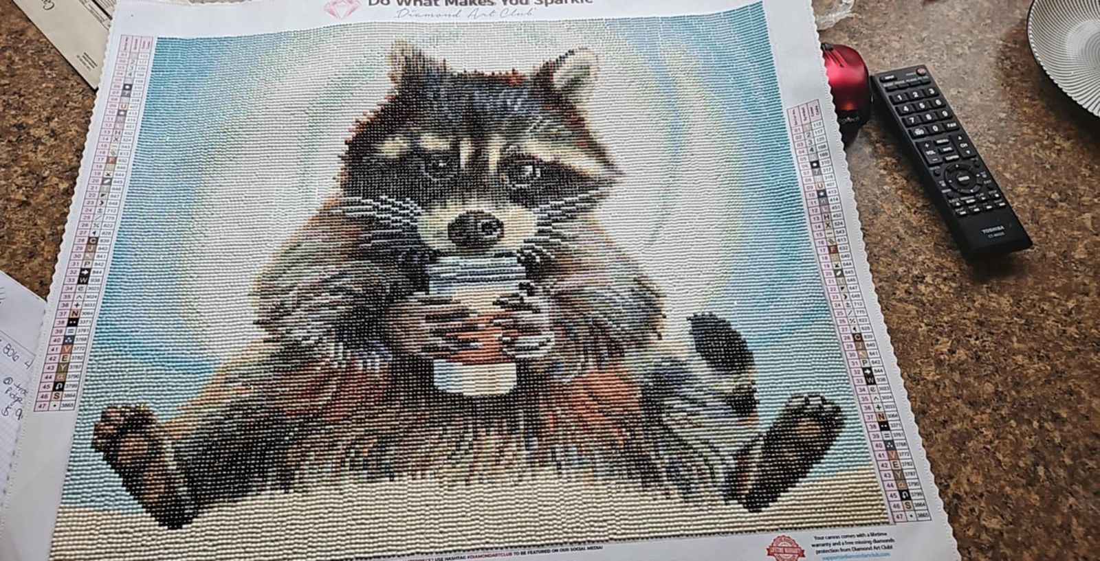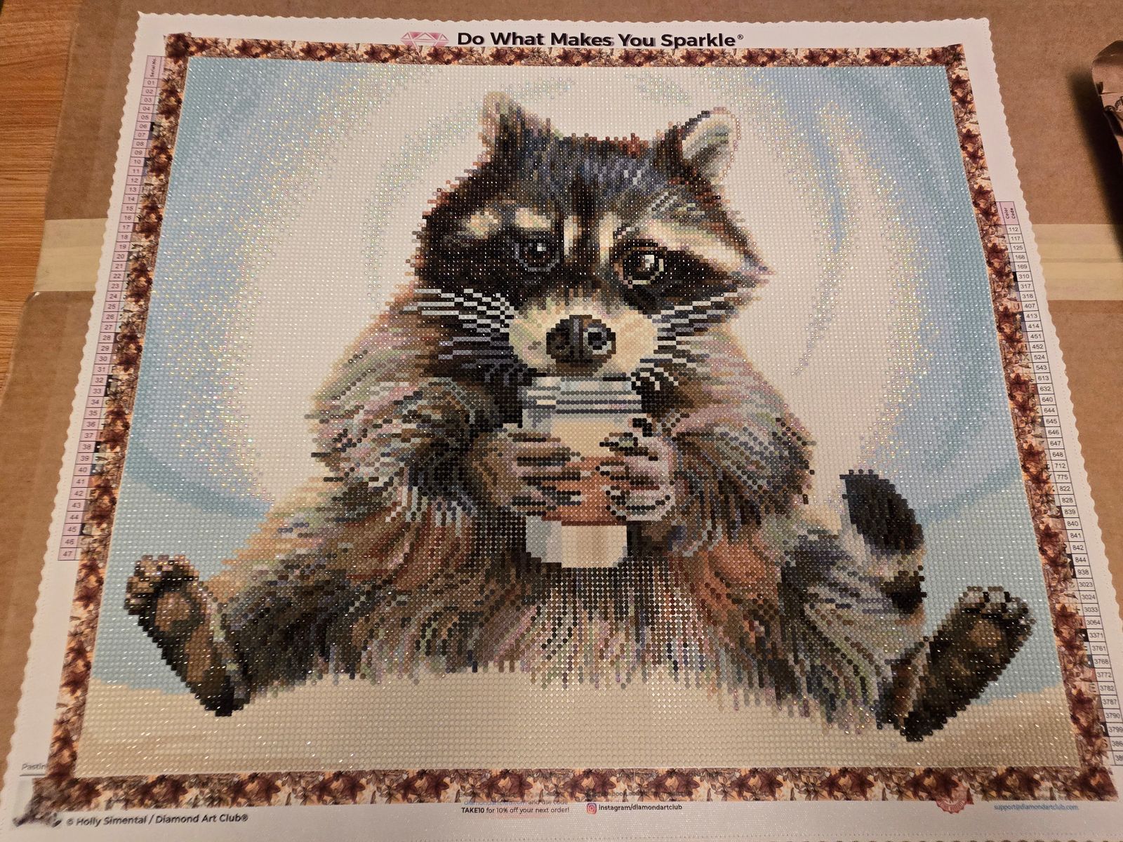 I enjoyed painting this raccoon so much! He is cute and sparkly! He is drinking my favorite morning beverage.