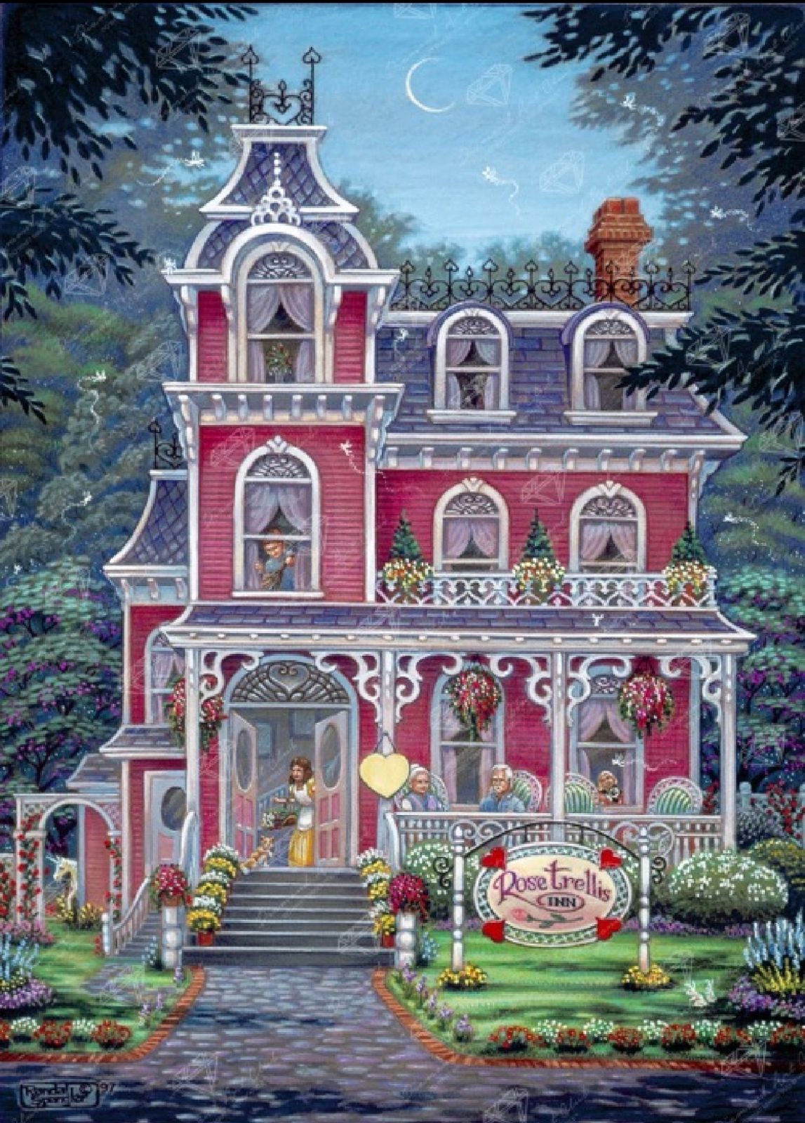 Experience the charm of a moonlit evening at a sweetly restored Victorian haven. In plummy red paint with white gingerbread accents, it attracts fairies and unicorns and all that is good.