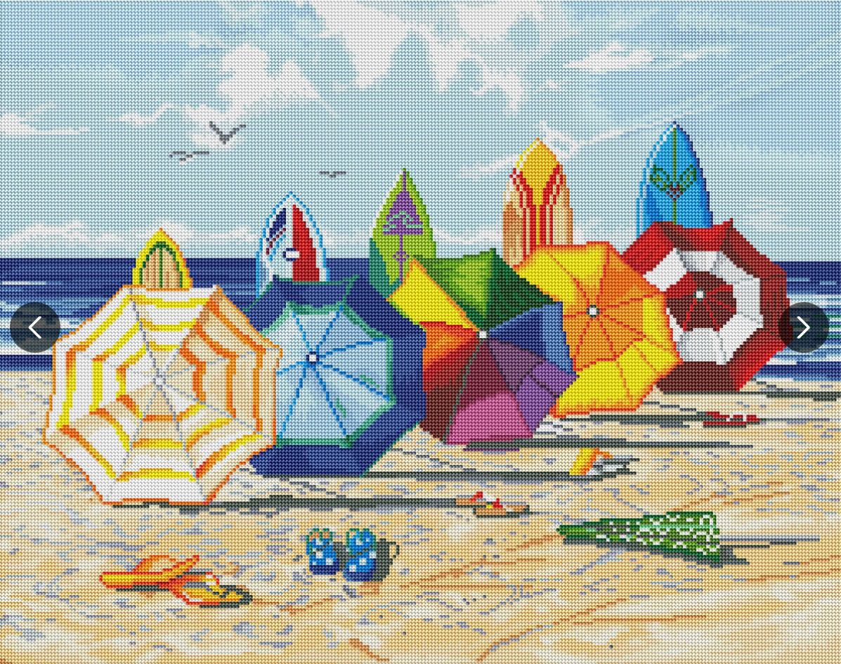 Slip on some flip-flops and wax up your board! The sun’s rays are sparkling off the ocean waves and shimmering on the golden sand , while a rainbow of colorful umbrellas keeps the mood cheerful and bright for a fun filled day at the beach.