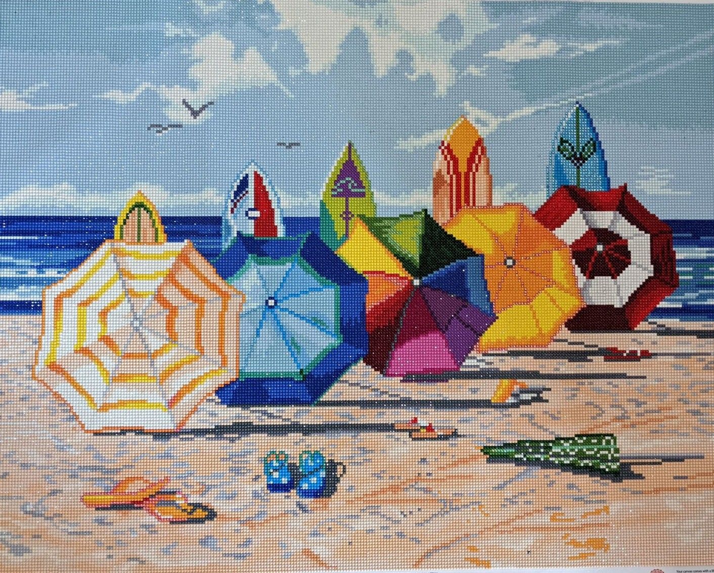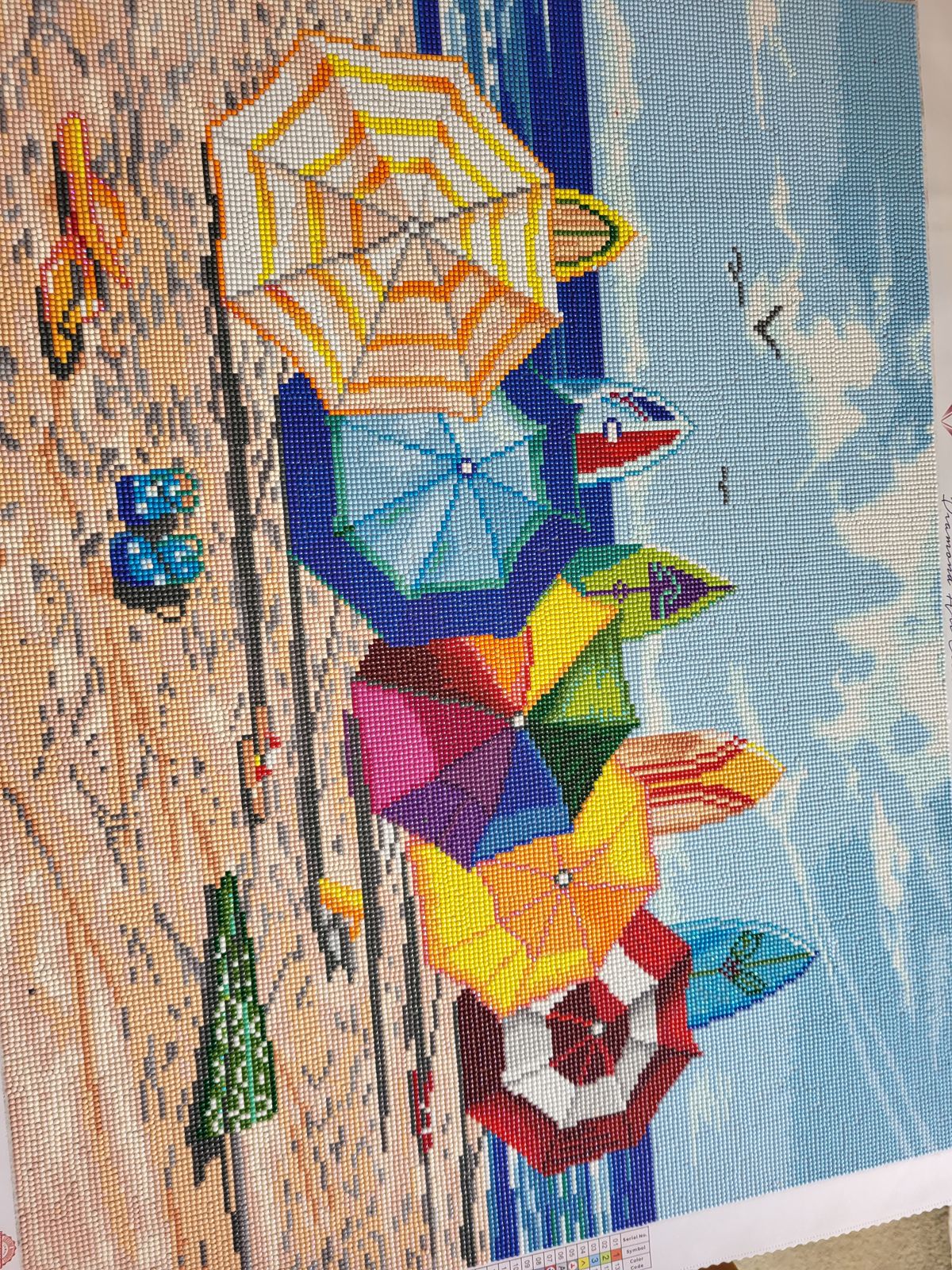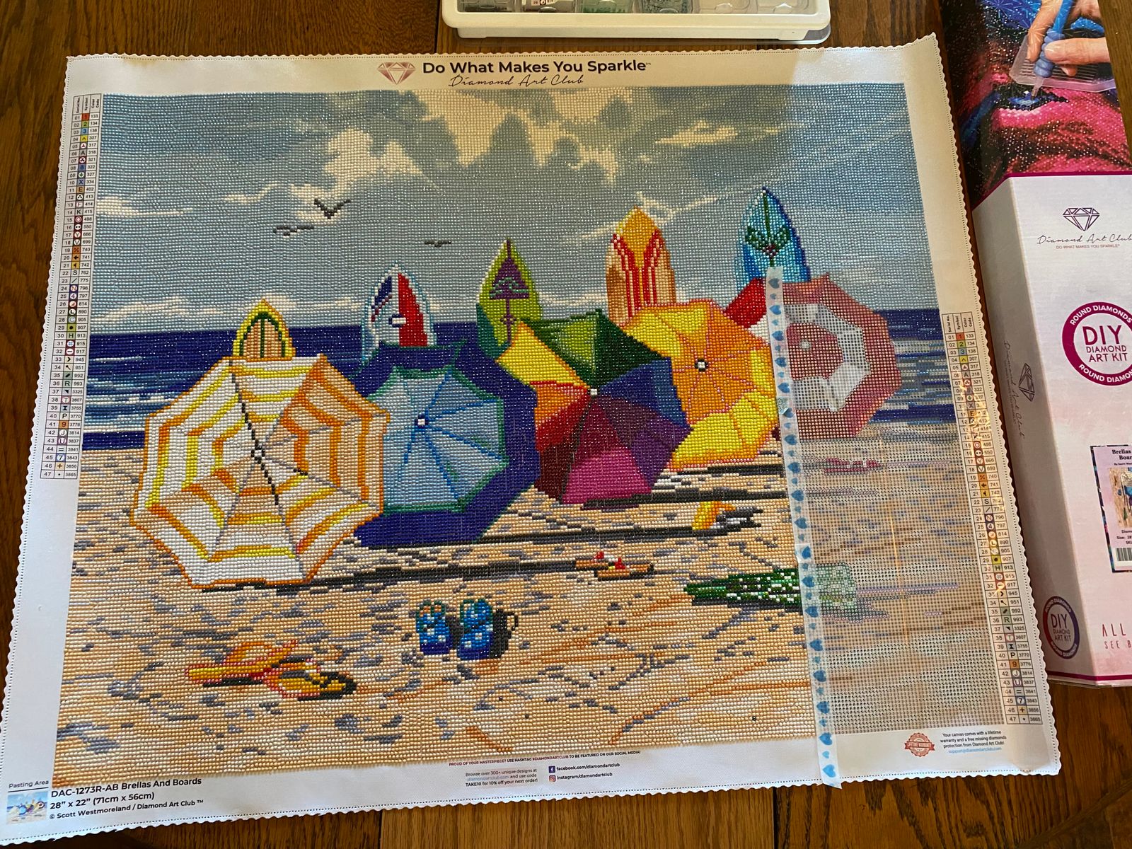 I love this art! DAC has done a wonderful job in making lots of colors with sparkle to make you feel like you are at the beach. The surfboards and umbrellas and flip flops made me long for the sand in my toes! The canvas was so soft, the drills were brilliant and the whole thing came together so great!
