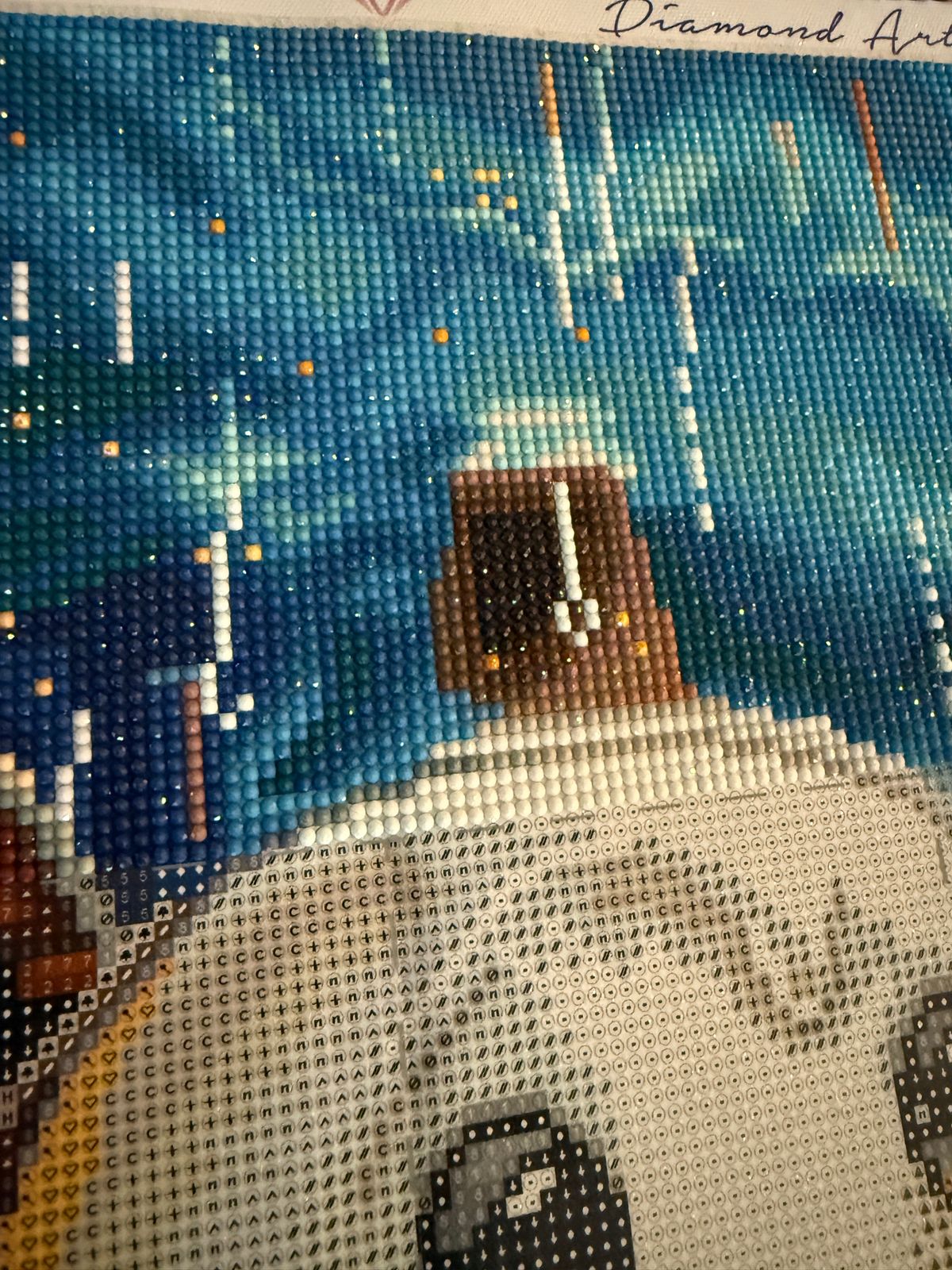 This canvas is so cute, I’m going to pull off a few drills to replace a spot above the ghostie’s head. The blue makes the smoke stack appear to be more of a hat. This looks to be a slight coloring error which doesn’t appear on the original artwork. But I love it, and I don’t mind making small tweaks to make it perfect for me!