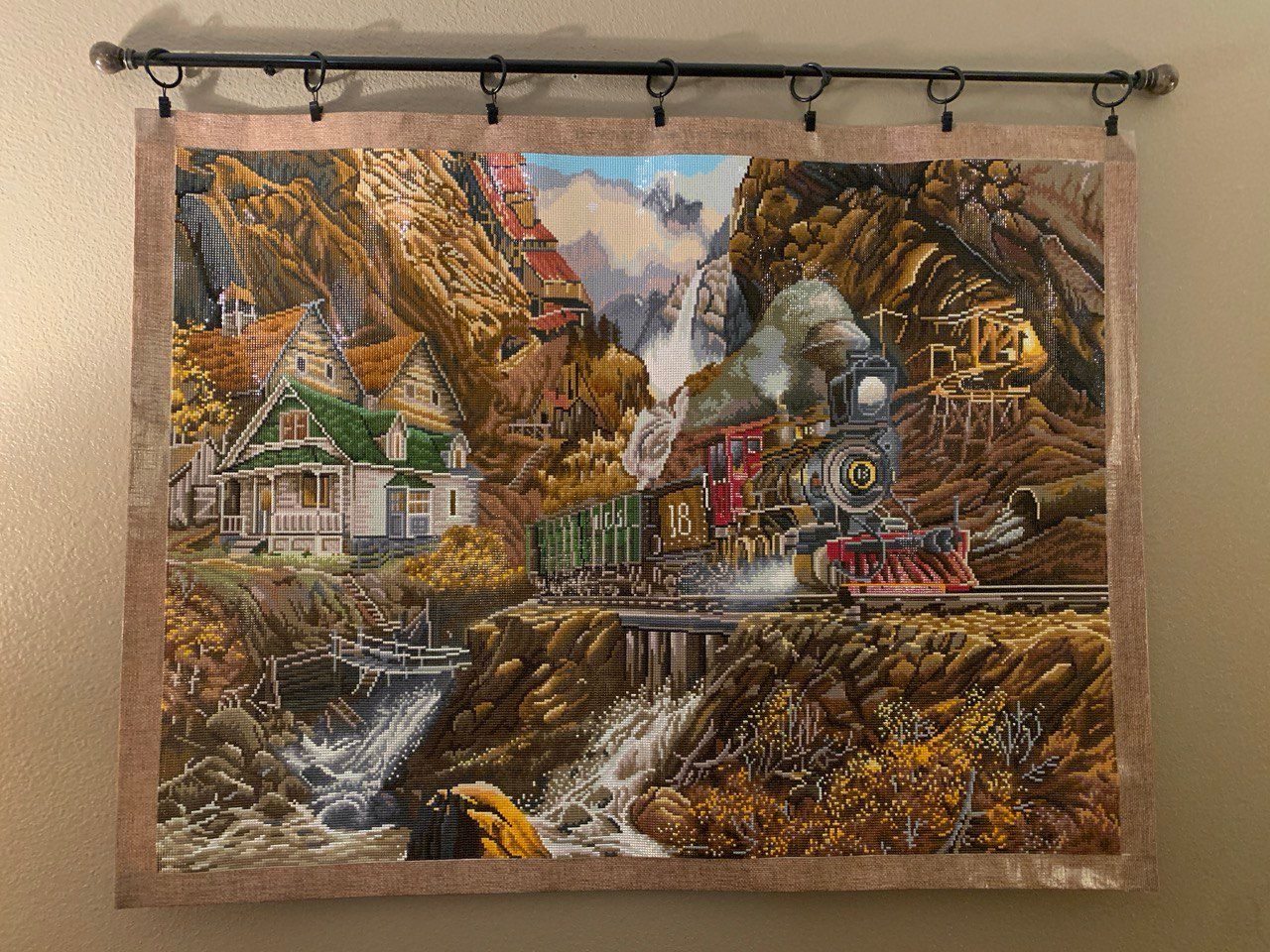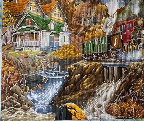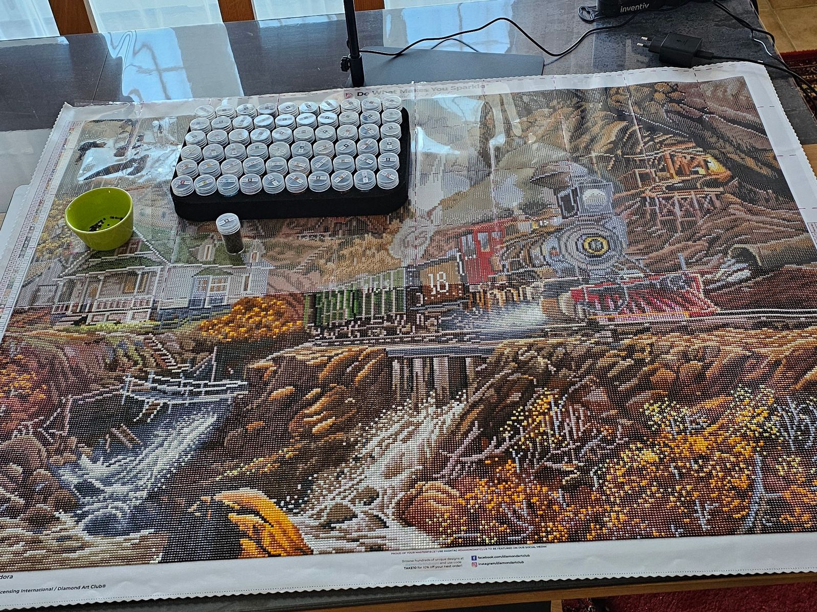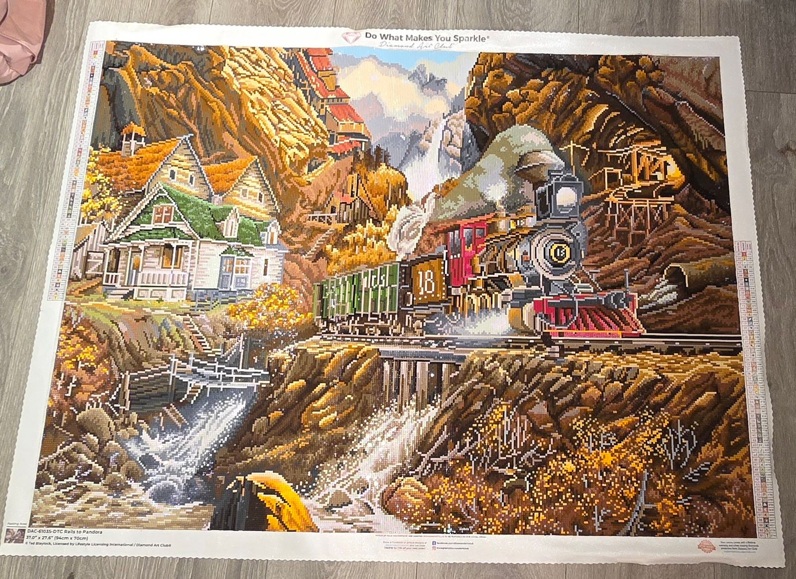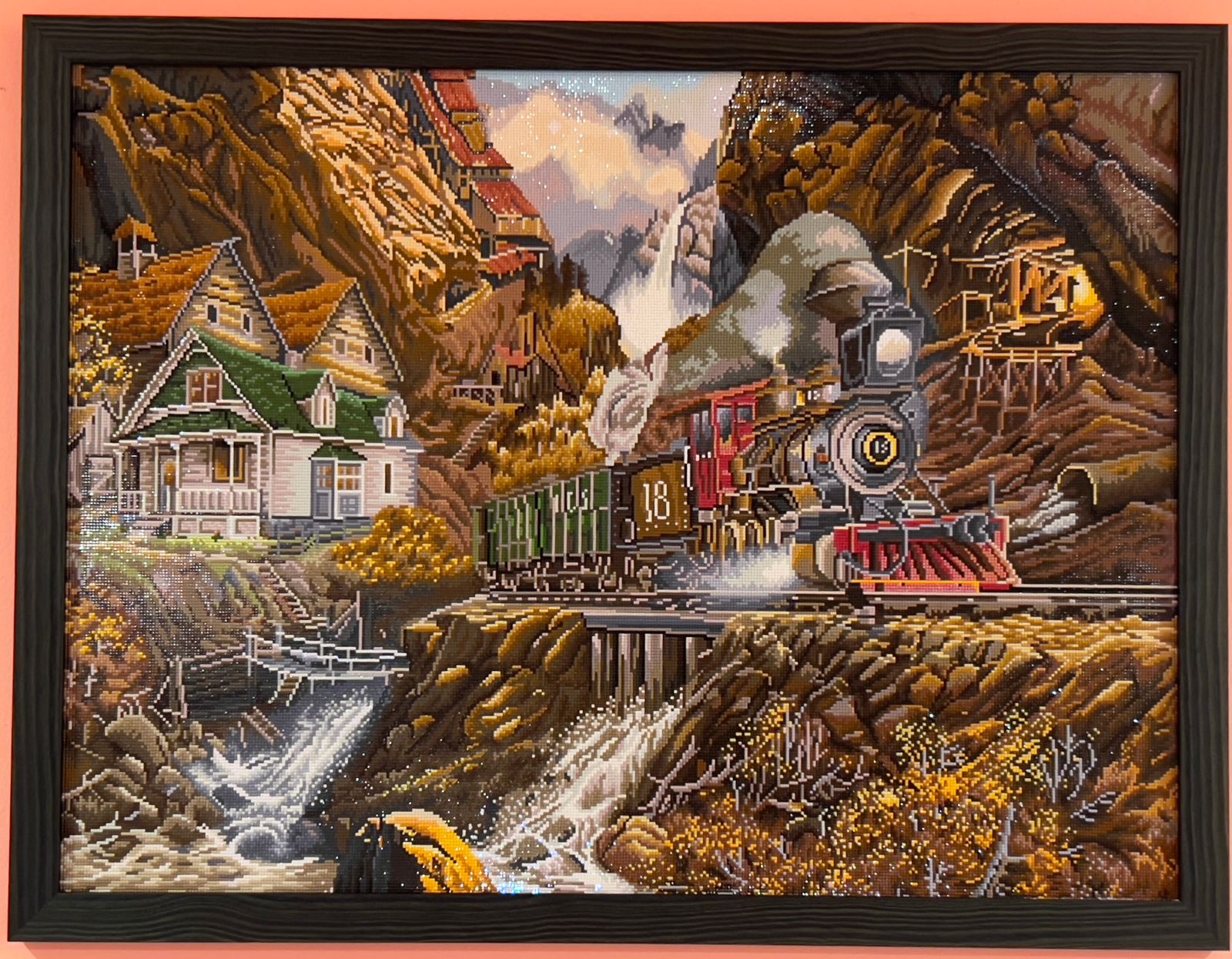 I got this dimomd painting to do for my husband because he loves trains , he Absolutely loved it when I finished it he now wants to frame it and put it up in the house .