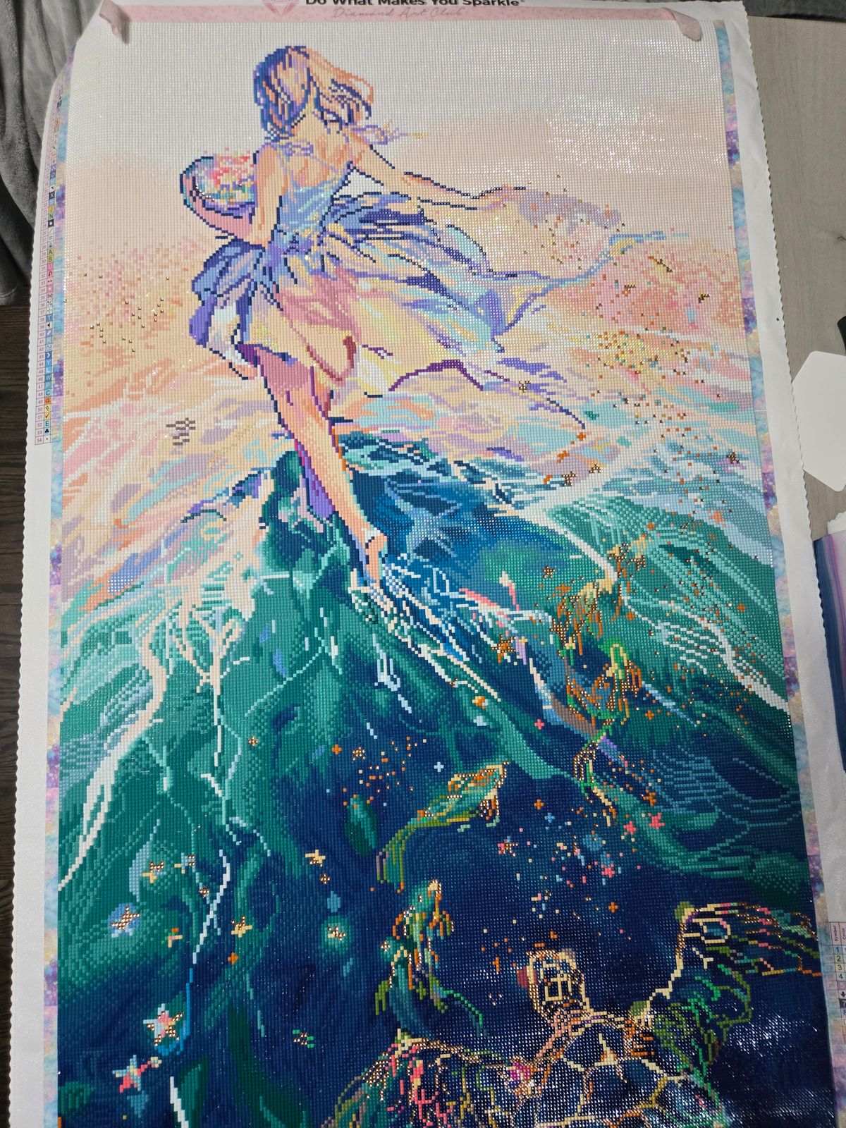 This is the largest diamond art canvas that I have done yet. It is just stunning. This one is going in my bedroom. The color palate is both exciting and soothing to work. The glimmering gold drills are classy instead of Vegas like I first thought that they would be. It is a tasteful glimmer to the palate that mimics the way that things of the water can sparkle.
