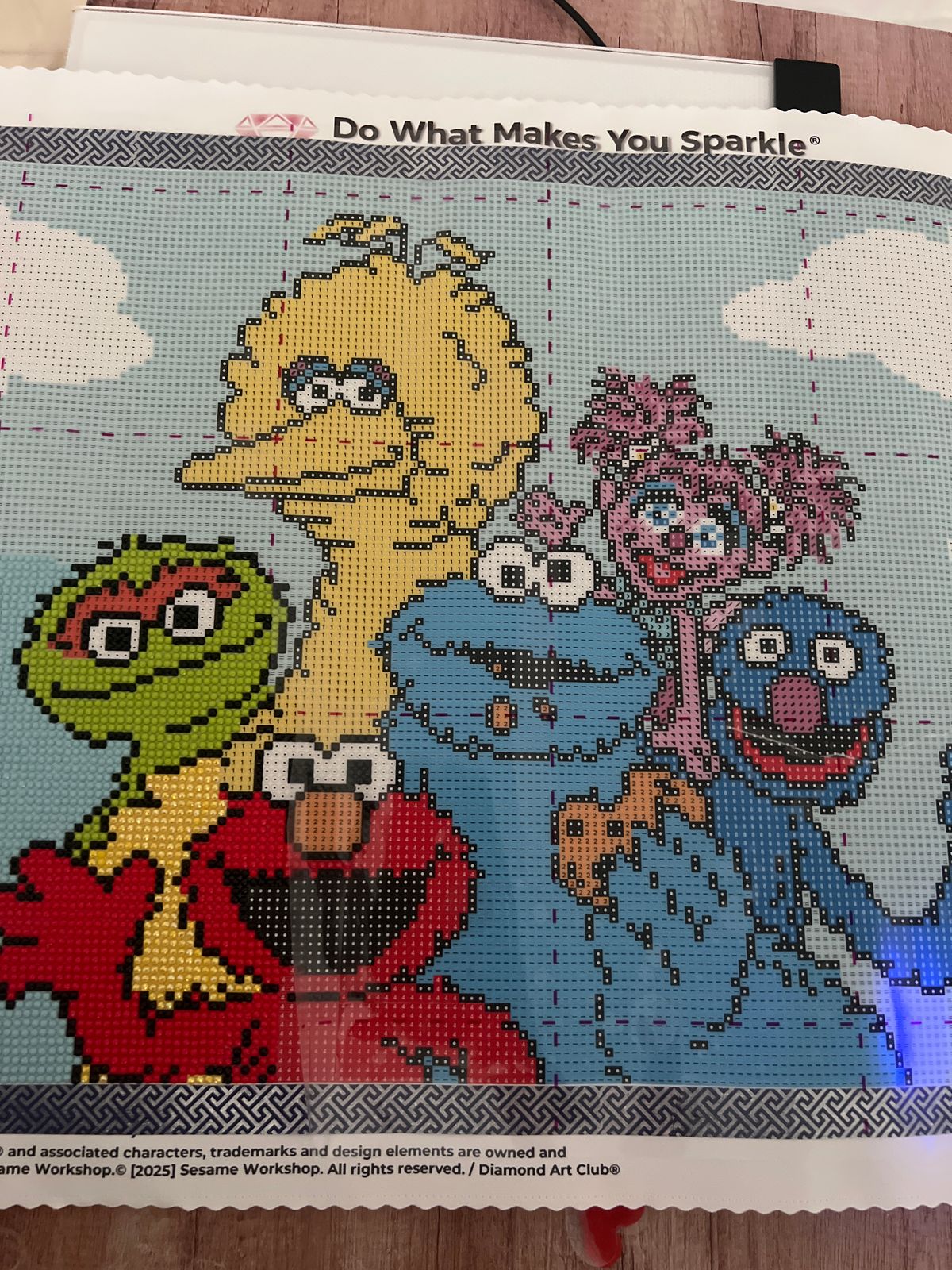 It’s DONE! 7 days, 28 sparkly hours, 15 colors, and so much joy later… my “Sesame Street and Friends” canvas is officially COMPLETE! 🧡💛💙