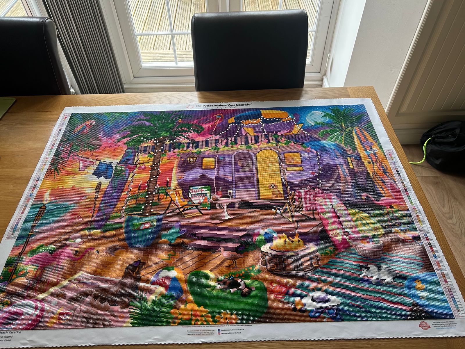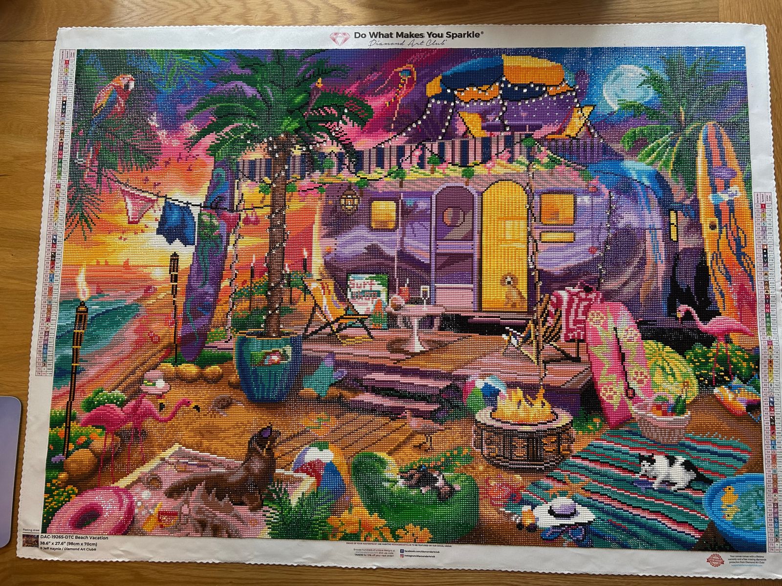 This canvas is amazing to do, the colours are so bright, and so many hidden things within the picture. Which makes you look properly at the canvas to see what else may be In there. The sparkle is mesmerising. Nice equal amount of Color blocking and confetti . This had been on my wish list for so long and so happy finally got to complete it. Now to frame it.
