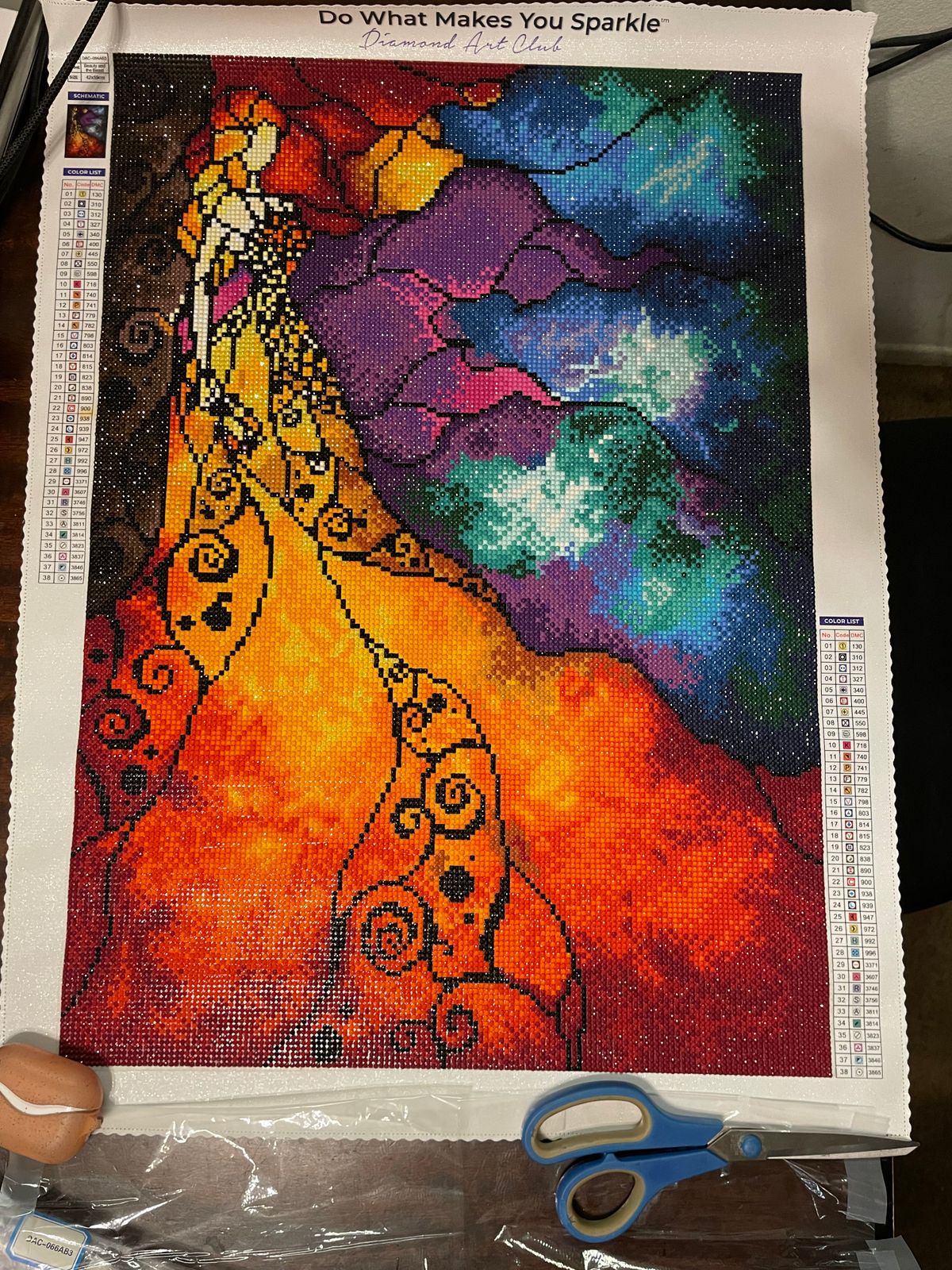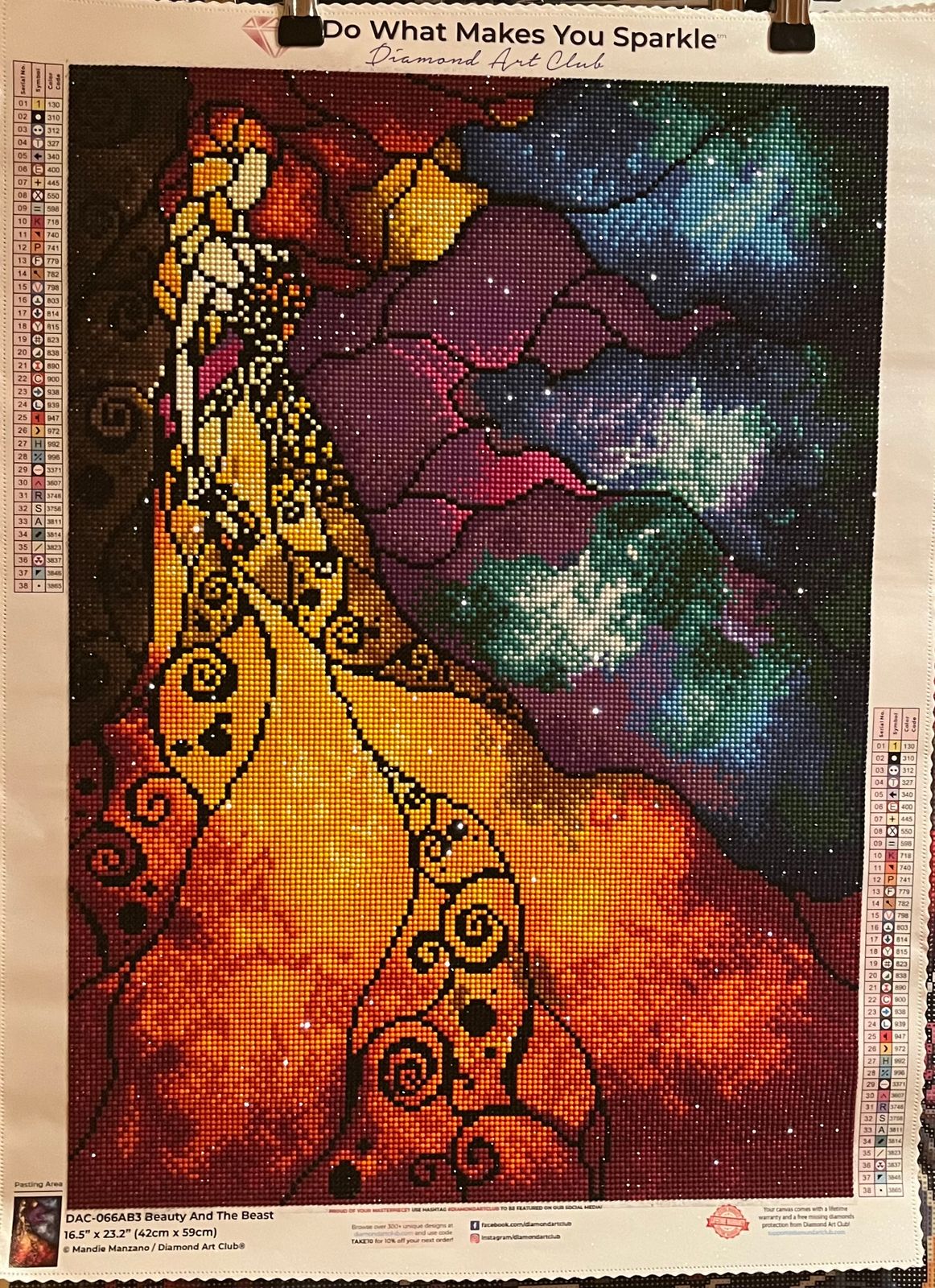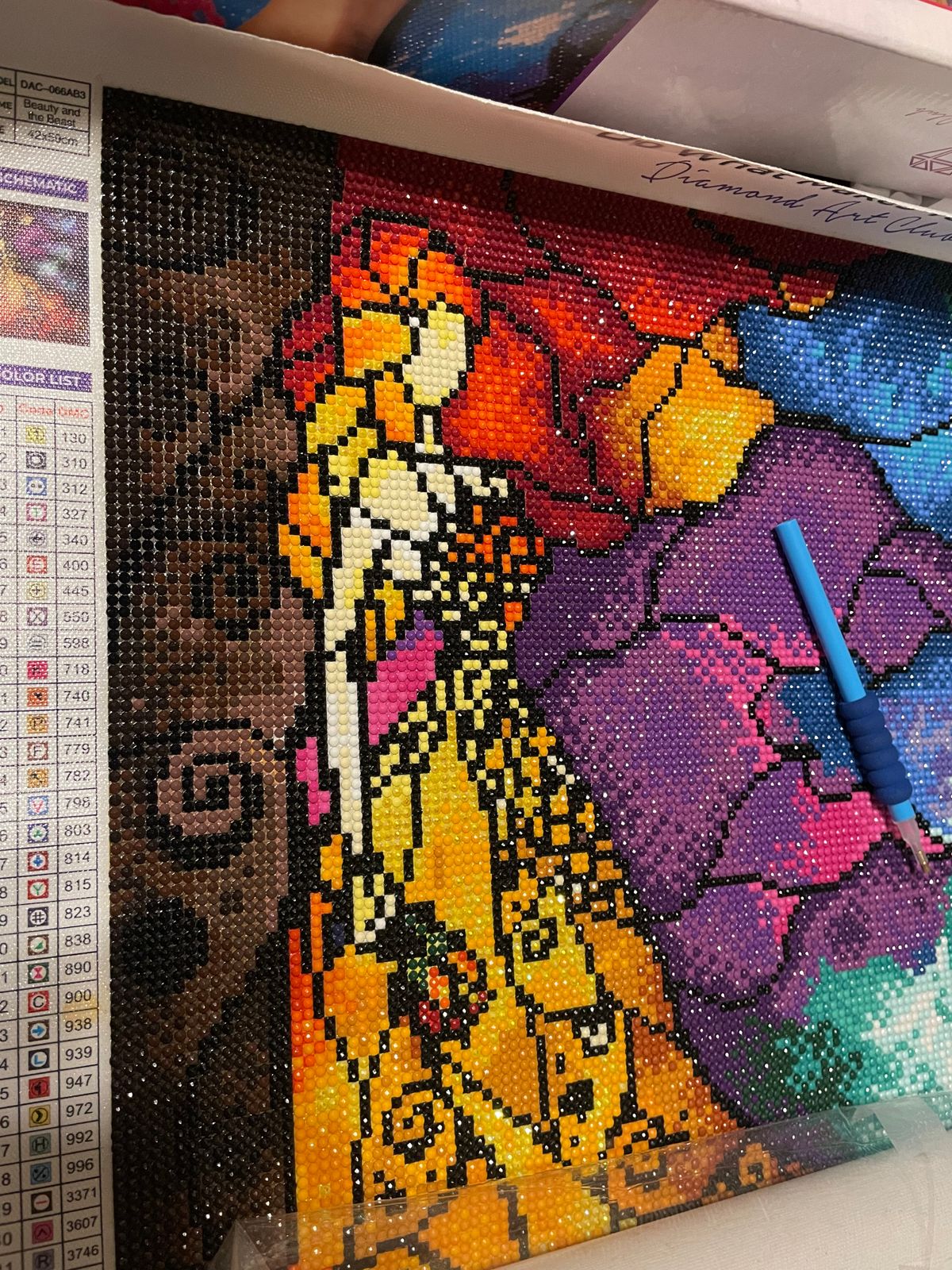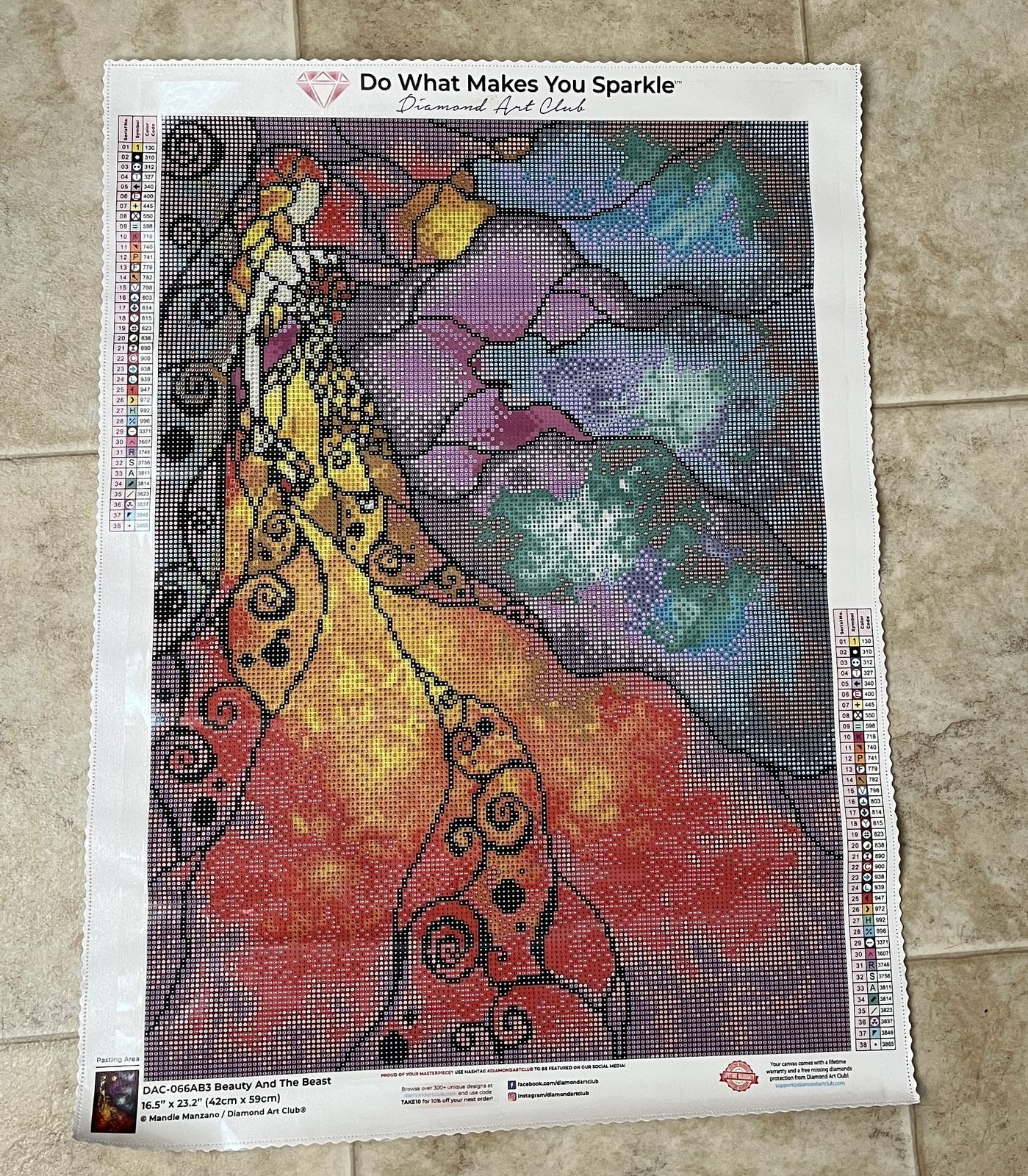 One of my favorite Mandy Manzano diamond paintings! I have a number of her princess-inspired paintings on my wall, and I absolutely love how beautiful Belle’s dress is, and how the shadow of the beast is in the background. I added more sparkle to her dress with switching out some diamonds drills with some extra AB drills I got online, and I adore the way it sparkles in the sun! The colors used in this rendering are gorgeous, and this was a relatively quick painting to do with a lot of small color blocks and the medium canvas size. Had very little trash drills and DAC canvases and supplies are always of the highest quality! I’ve been a long-time customer for good reason.