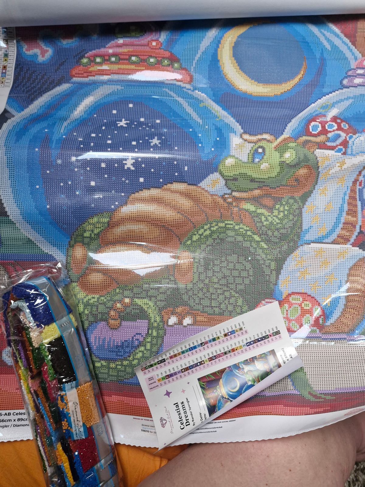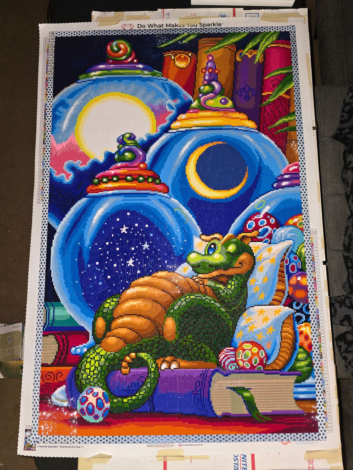 The greens in this little Dragling REALLY stand out and the amount of blue colors are amazing! This diamond painting is almost finished FINALLY (it's taken me forever to finish it due to Adult ADD and depression) but there's a place of Honor waiting in my grandson's bedroom soon with lights behind the frame to enhance the beautiful colors in this painting!