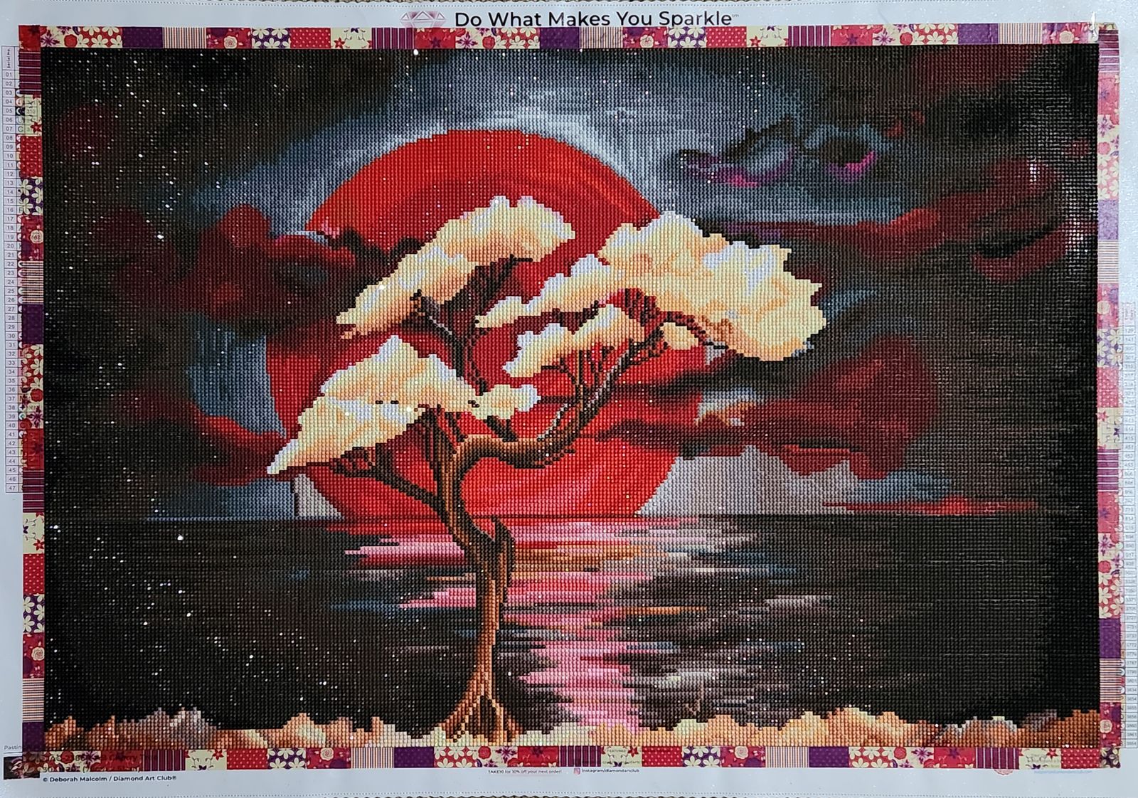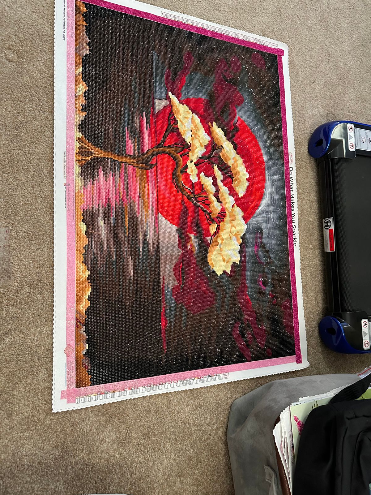 The canvas turned out beautifully and I loved working on it. The pink ink from the plastic cover got on the canvas but it didn’t show once I placed the drills. The colors are lovely and I can’t wait to hang it up!