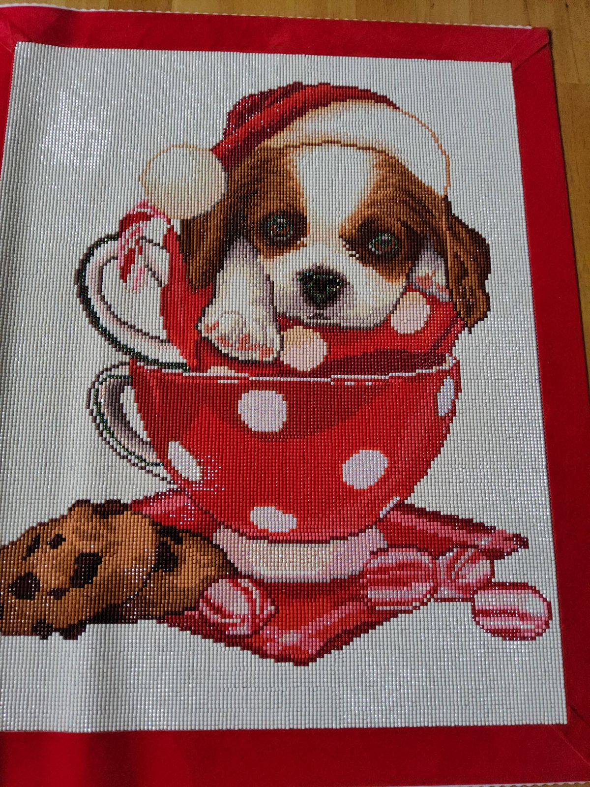 I loved this picture. The puppy turned out so cute. I used Chris red felt ribbon to frame it so I can hang it with a rod and clips.