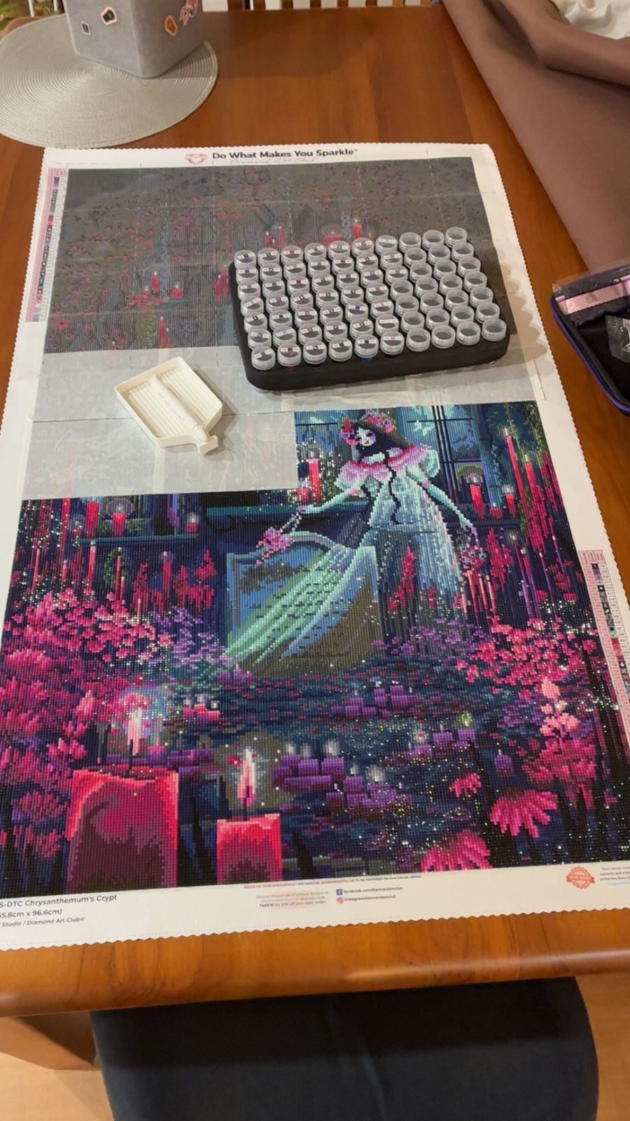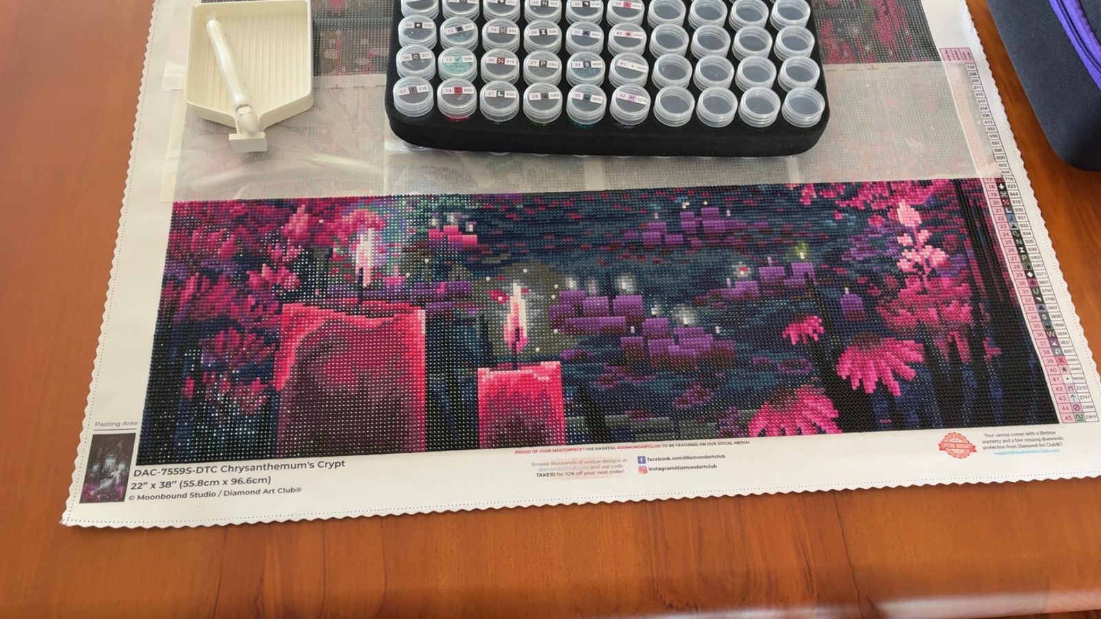 This is by far my favourite diamond painting ever. The colours are wonderful; dark blues that make the rich purples and pinks pop and the shimmer of the fairy dust drills really ties it all together. It’s whimsy, it’s dark, it’s fantastical. Moonbound Studio has become one of my favourite artists. The whole canvas is confetti which I loved. I had so much fun working on this I didn’t want it to end. 10/10
