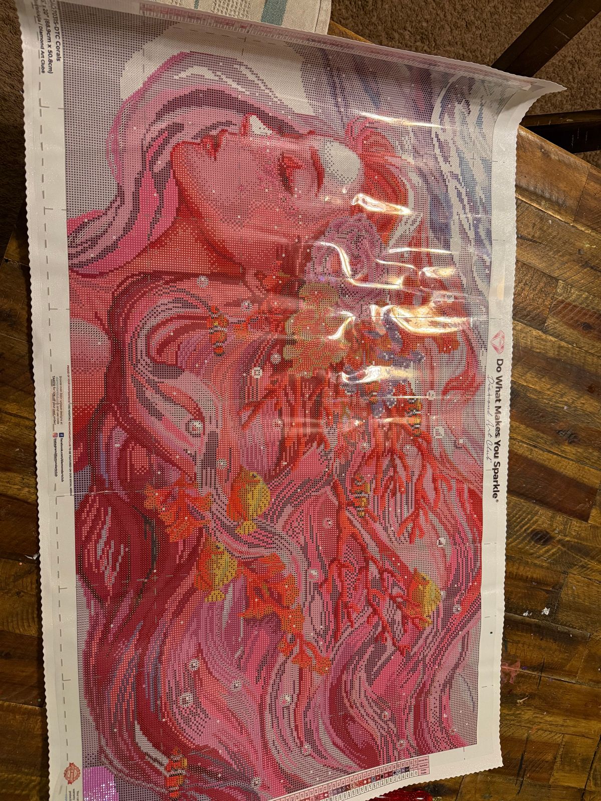 She’s lovely! This is a large canvas at around 88cm x 50cm, but it’s amazing. Love all of the little clownfish and yellow tangs swimming around her.