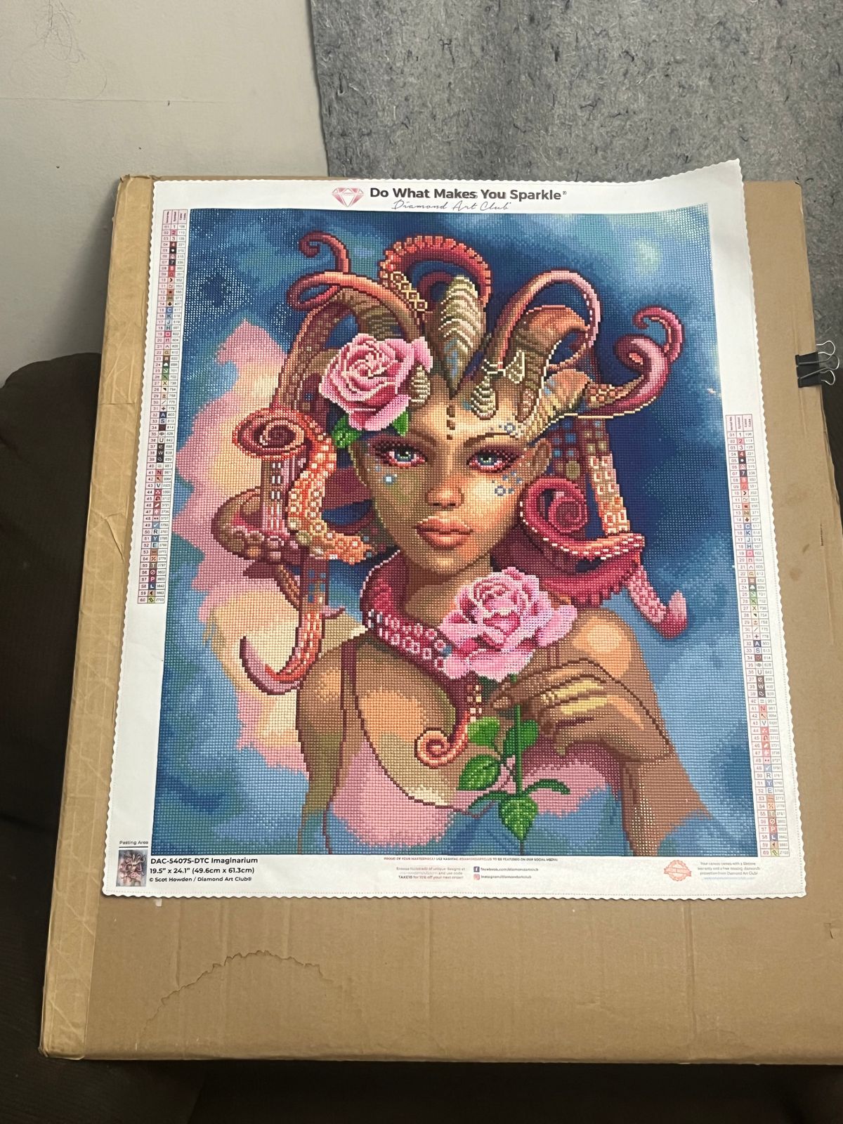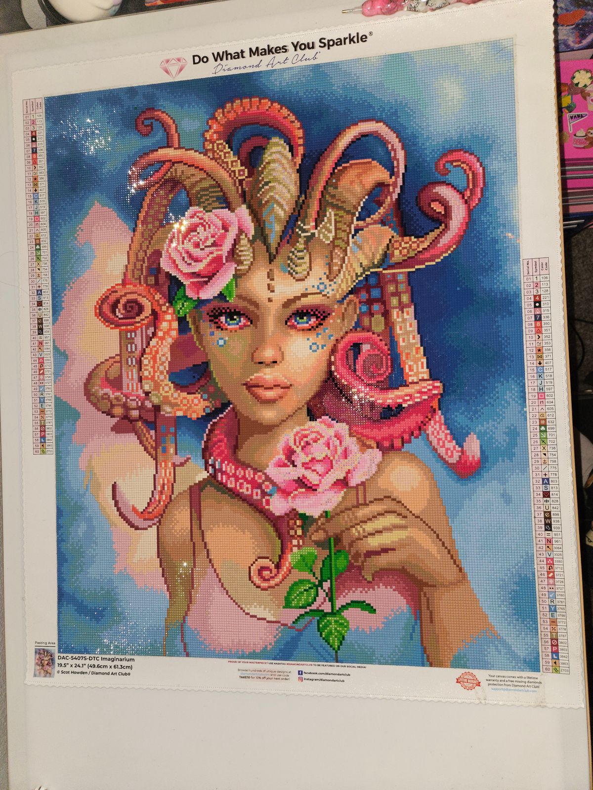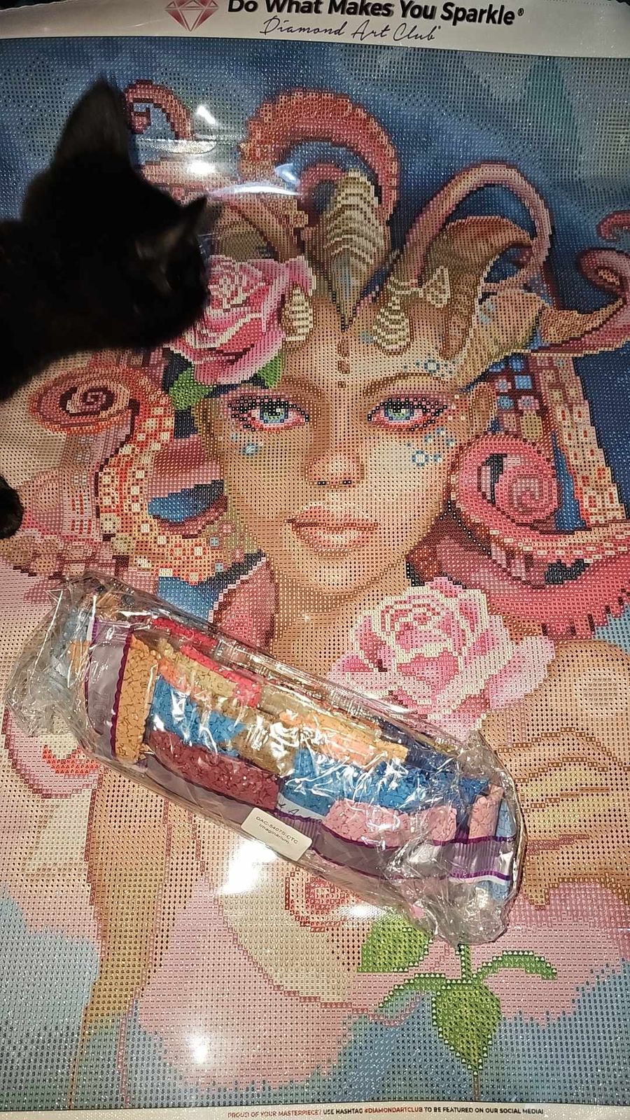 I truly enjoyed this painting. The colors are vivid. Just a touch of Fairy Dust drills. 3 different AB's for the roses. I personally added a touch of glow in the dark drills to the bubbles around her eyes.