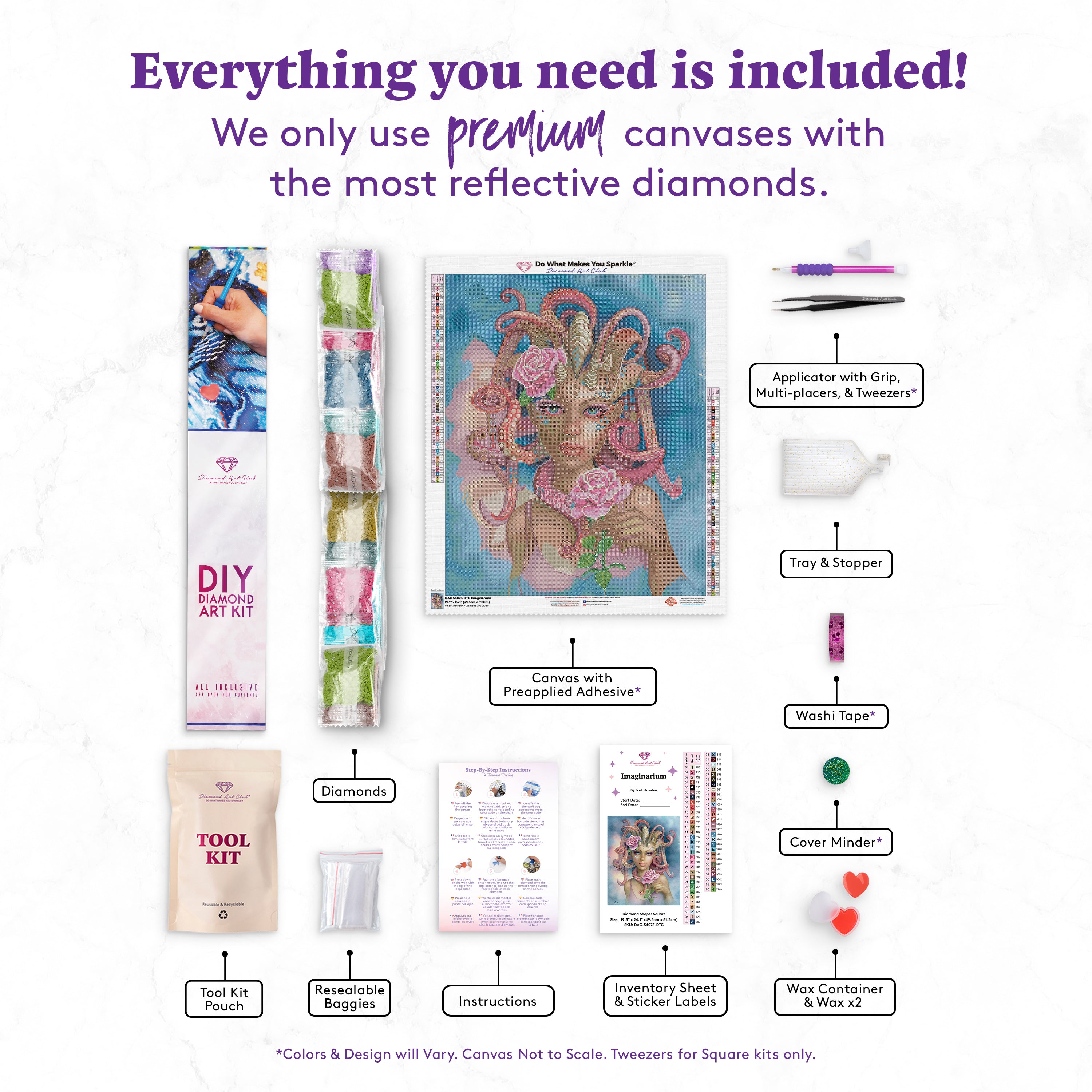 Canvas x 1, Diamonds, Tray x 1, Applicator + Grip x 1, Wax x 2, Tweezers x 1