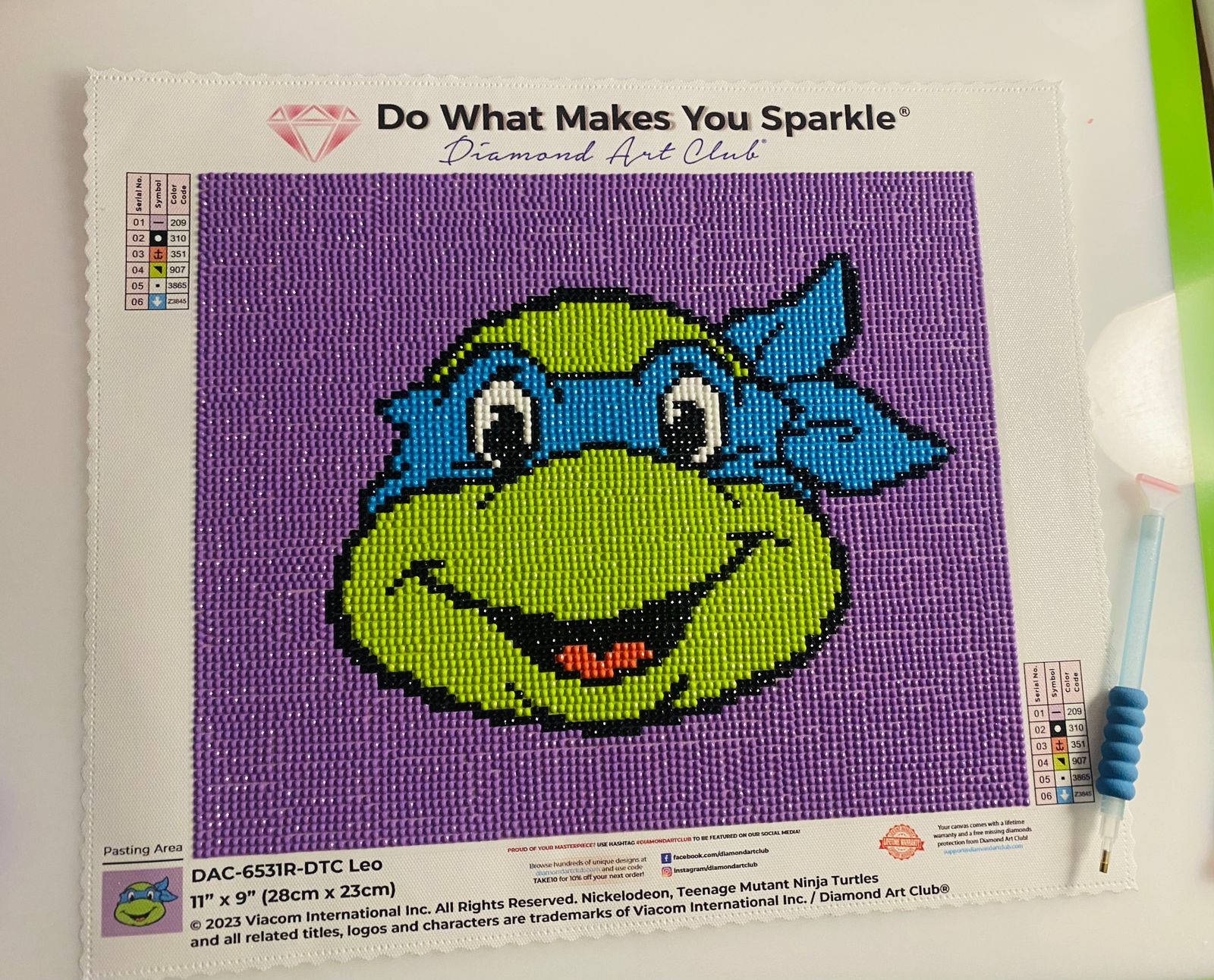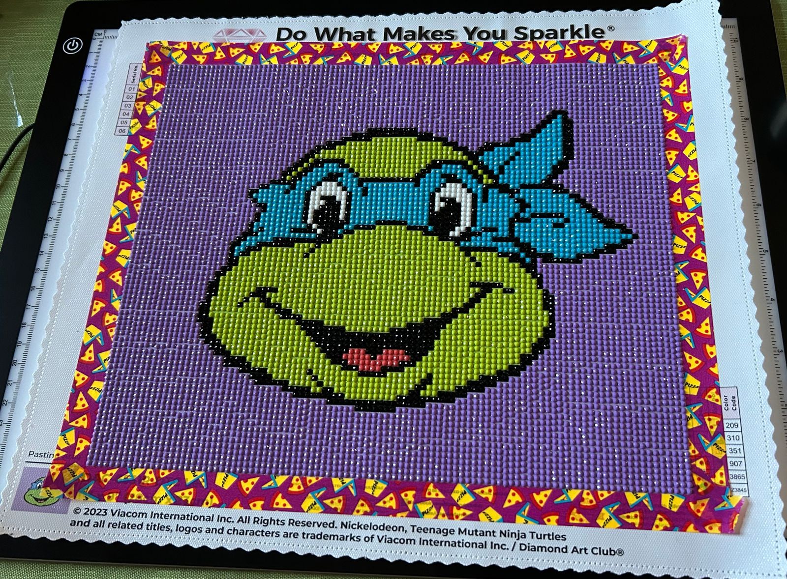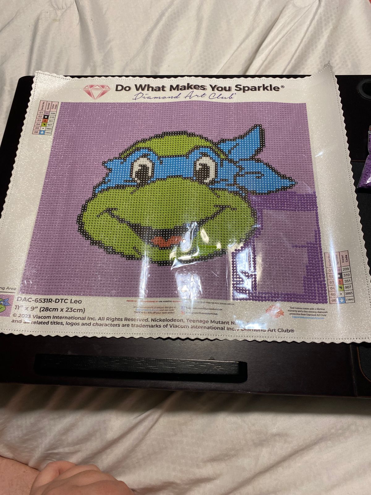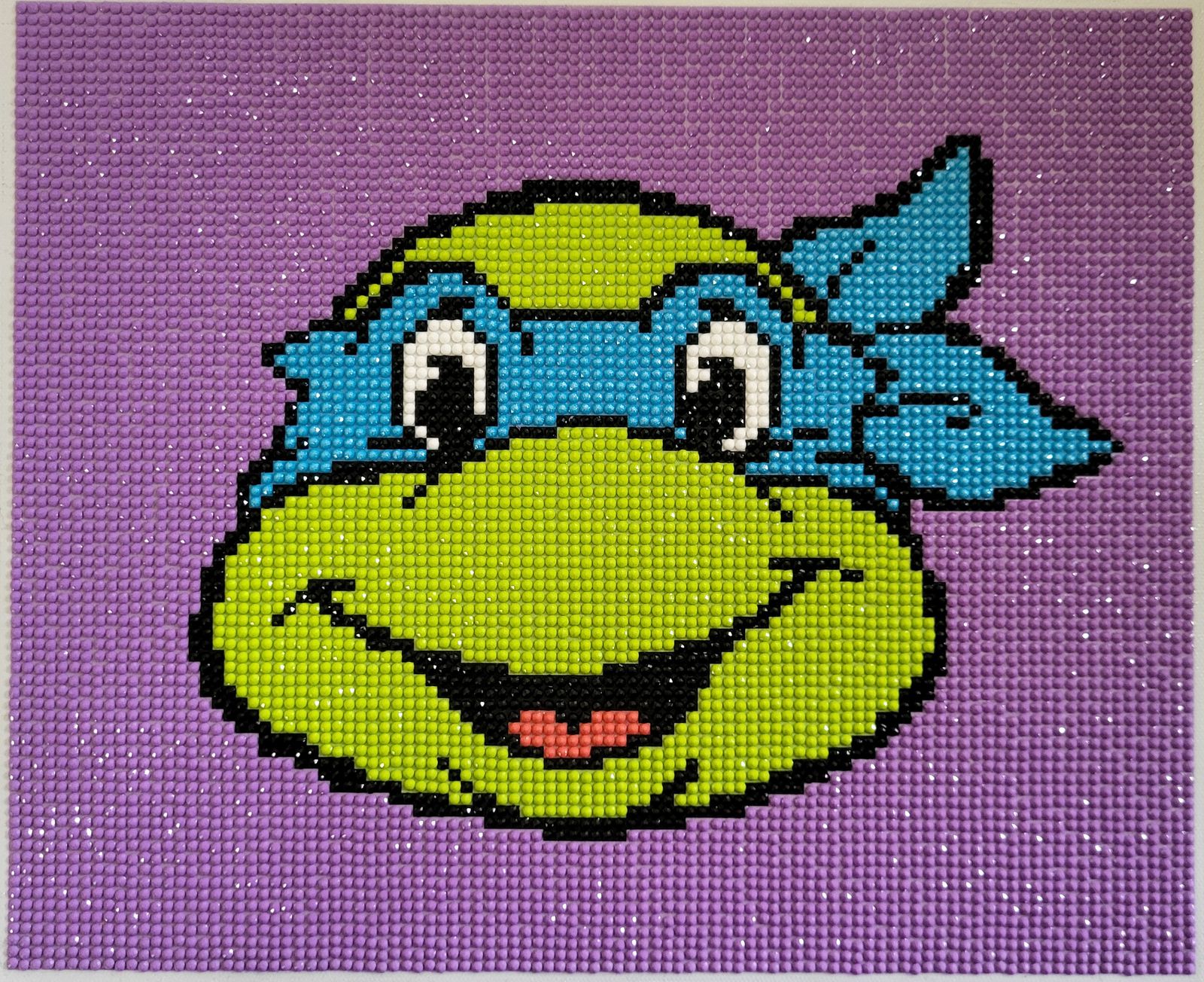 I got all the TMNTs for my little boy. This was a quick project. It only took me 5 days, and I don’t have a lot of time to diamond paint. Lots of multiplacing. I do wish the grid was tighter. That is my only complaint. Leo has fairy dust in his mask. Two of the TMNTs have fairy dust and two have ABs. To me, the fairy dust are far easier to work with. On these TMNT kits, I do think the ABs look better though. (I have also completed Donnie and Raph.) I framed this in a kids art frame. It’s the perfect size and it makes it easy to switch between the different TMNTs depending on who’s the current favorite. I purchased this kit in May 2024 and completed it in August 2024. In summary, I’d recommend this kit for any TMNT lovers!