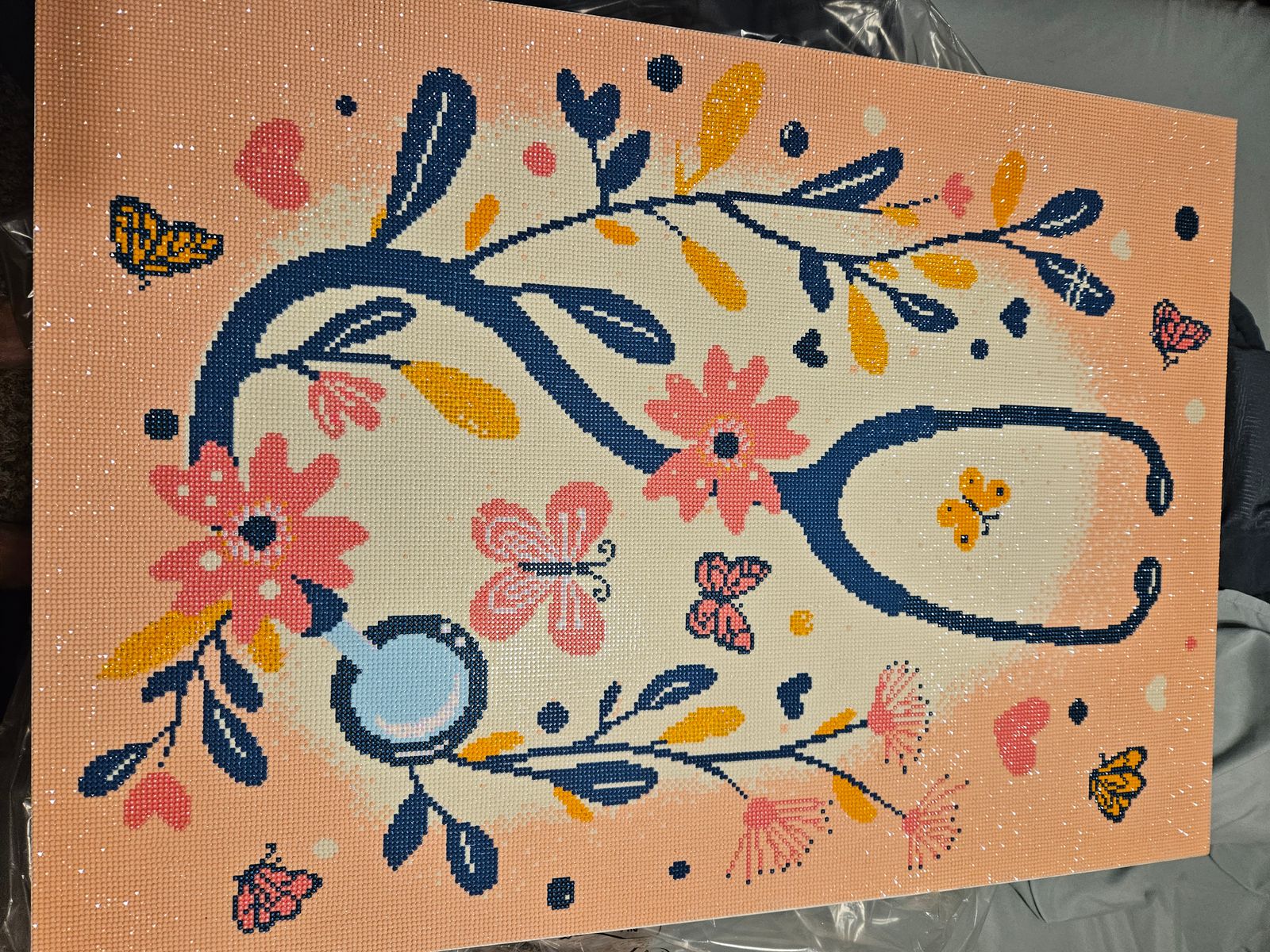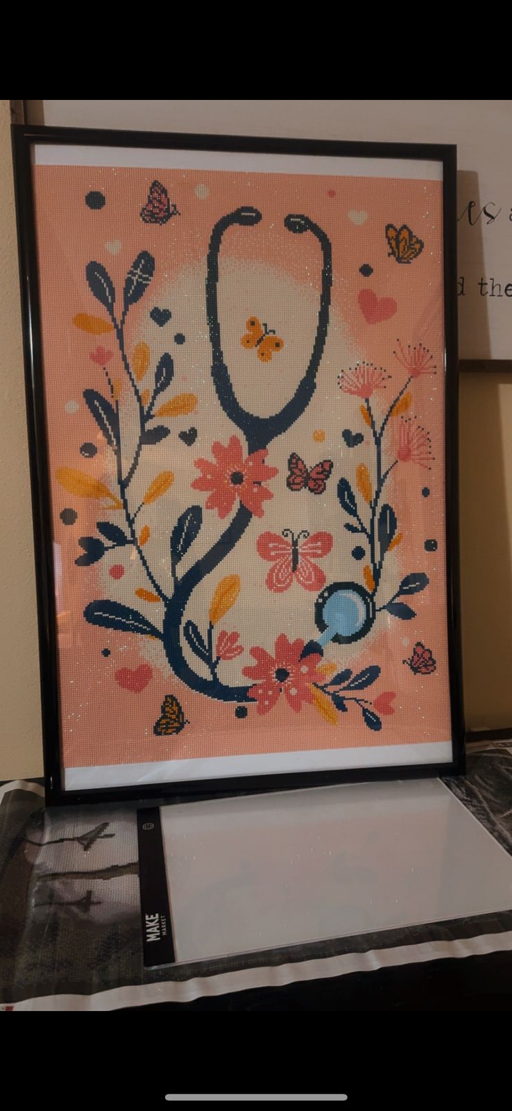 This was a wonderful picture to do. Loved doing it. The color bocking really didn't bother me that much. This only had a handful of colors which is a big change. The one thing I did enjoy was no 310s. I needed a break from those dark colors. Made this for my daughter who just got accepted into Nursing School. Now to frame and hang.
