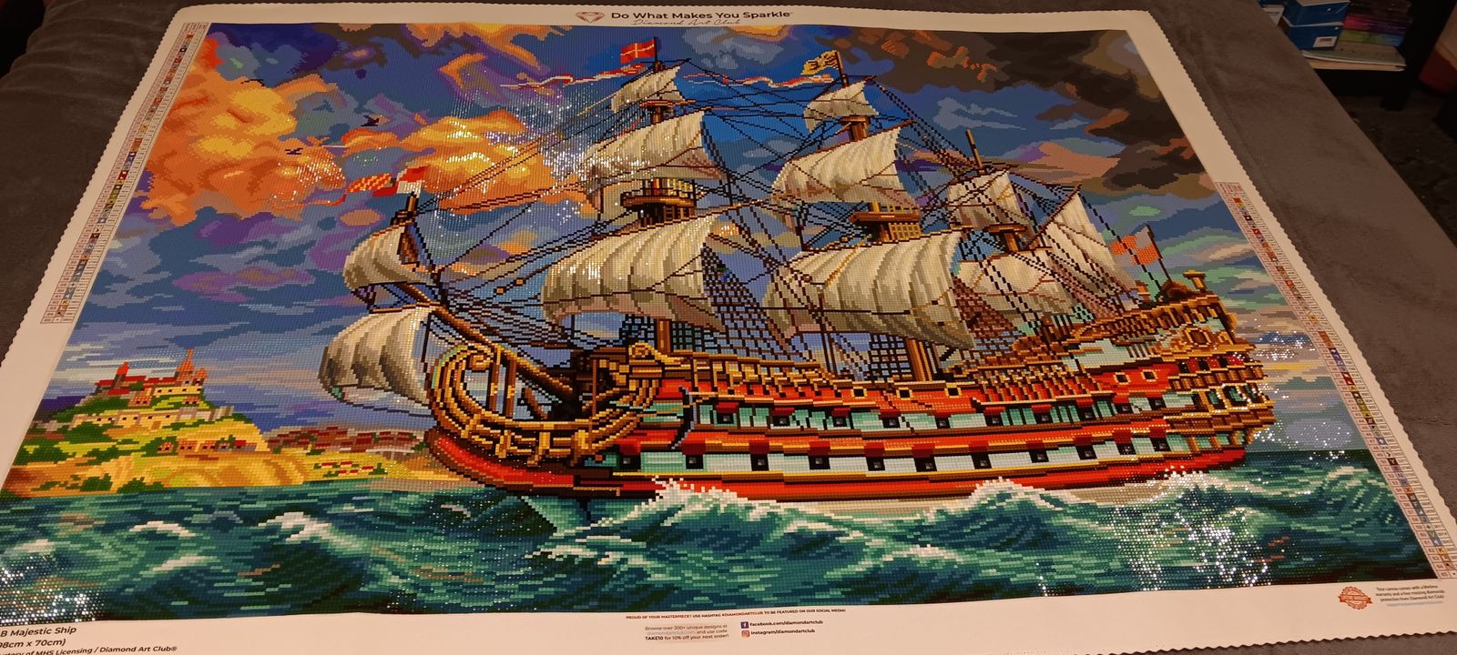As someone who’s completed dozens of kits, Majestic Ship easily sails into my top tier of Diamond Art Club canvases. The moment I unrolled the canvas, I was struck by the depth and drama in the artwork—you can almost feel the wind and smell the salt in the air. The ship cuts a bold silhouette against the ominous sky, and those storm clouds? Deliciously moody.