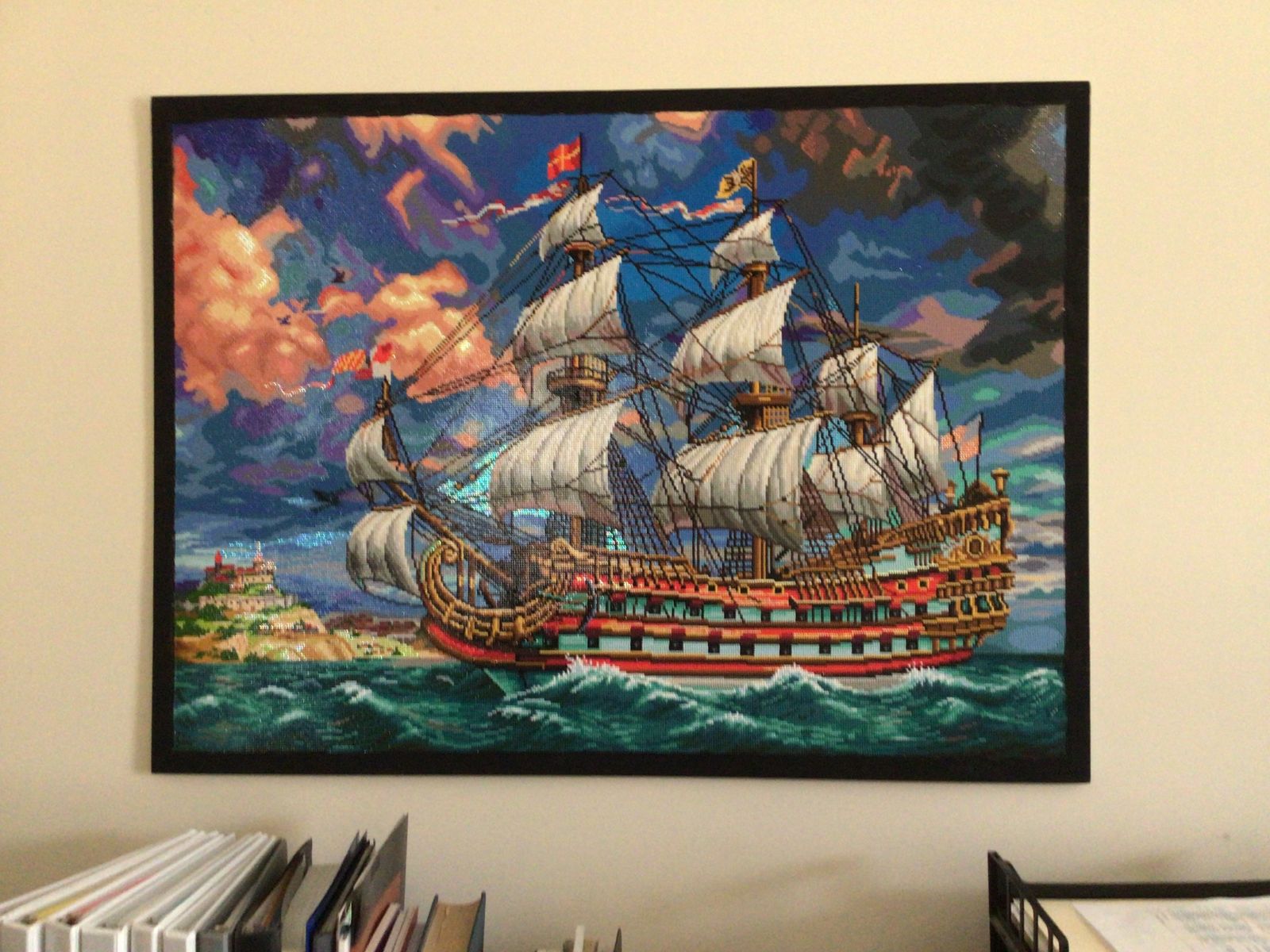 The details of the ocean and the ship are stunning! The ship looks so beautiful , sails puffed out,and on its journey 💕 this will look amazing on any ship lovers wall!