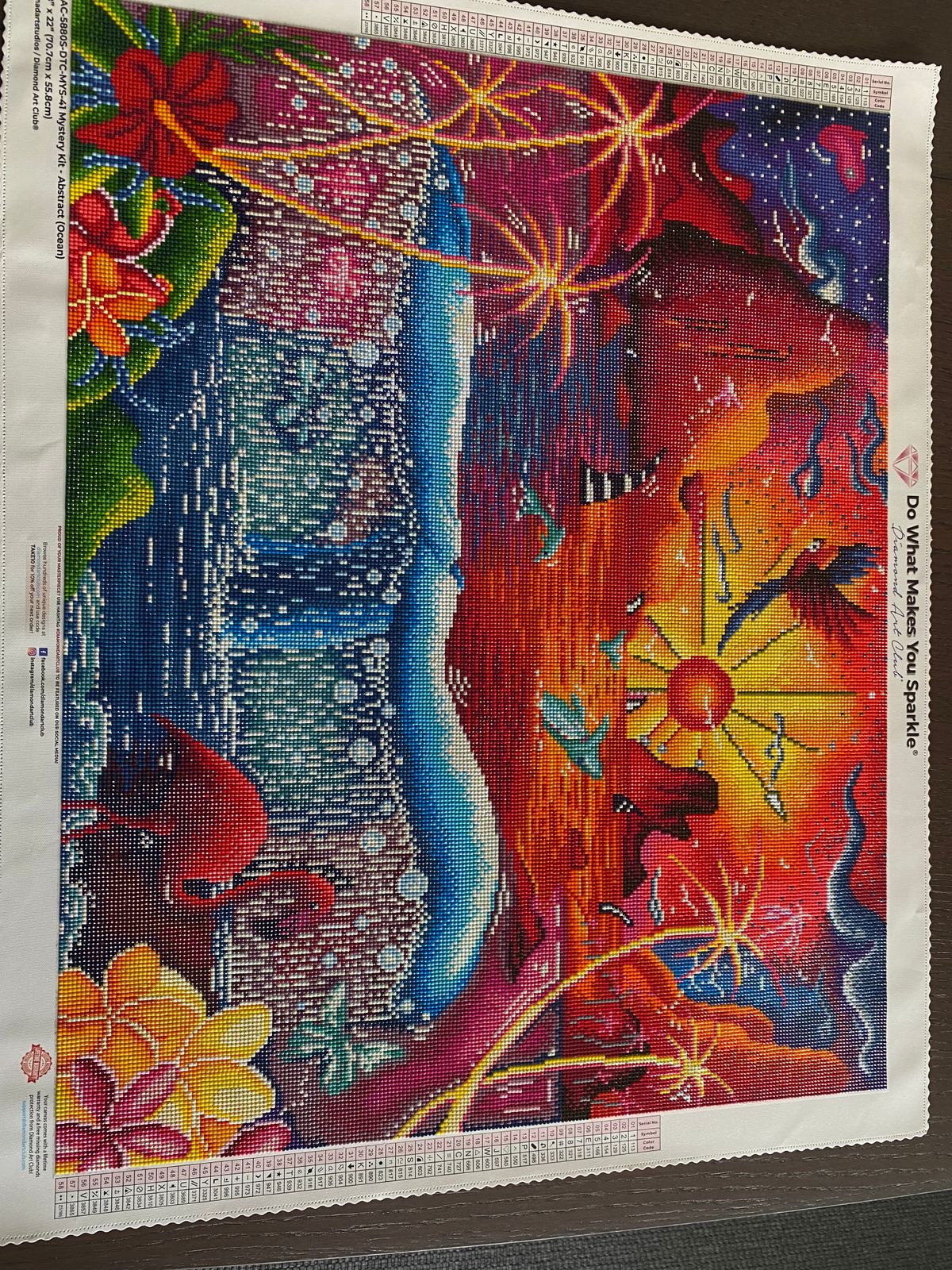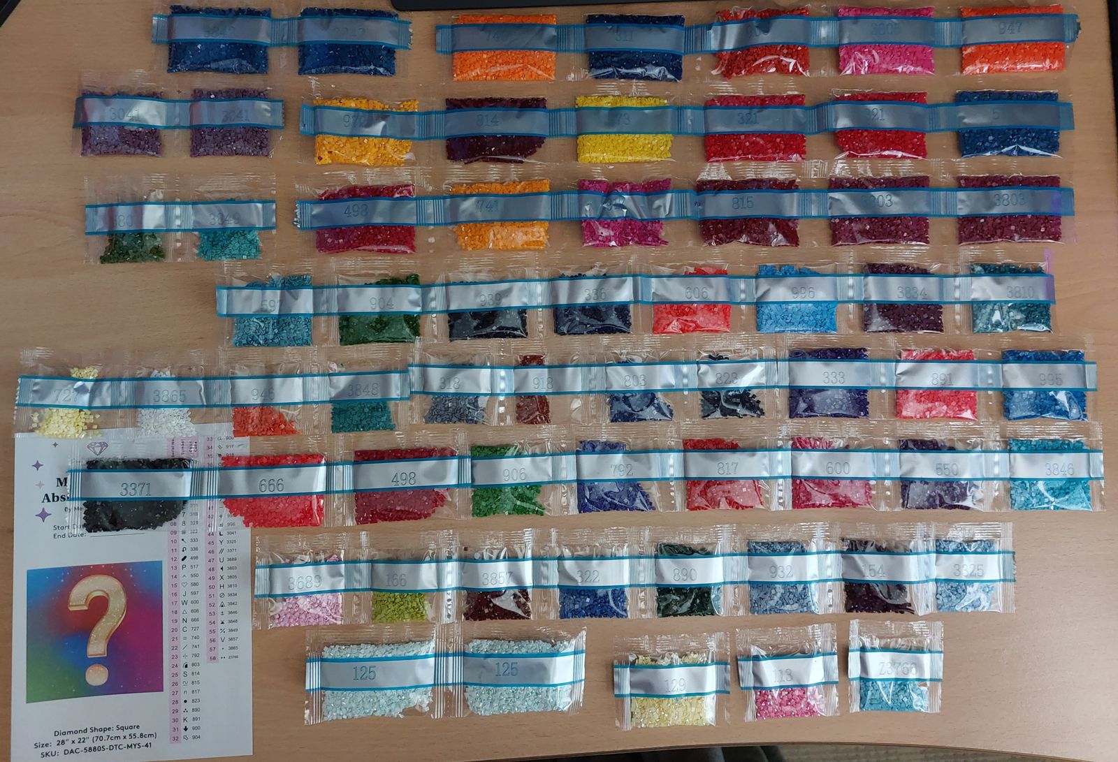 This was my first Mystery Kit and I cannot wait to do another one! I was a bit worried about the symbols on the canvas being largely black and white, but once I got used to them it was absolutely fine. The abstract nature of this painting kept me guessing throughout and I love the vibrancy of the finished image. This kit also has a lot of AB so its super colourful and sparkly, just delightful :D