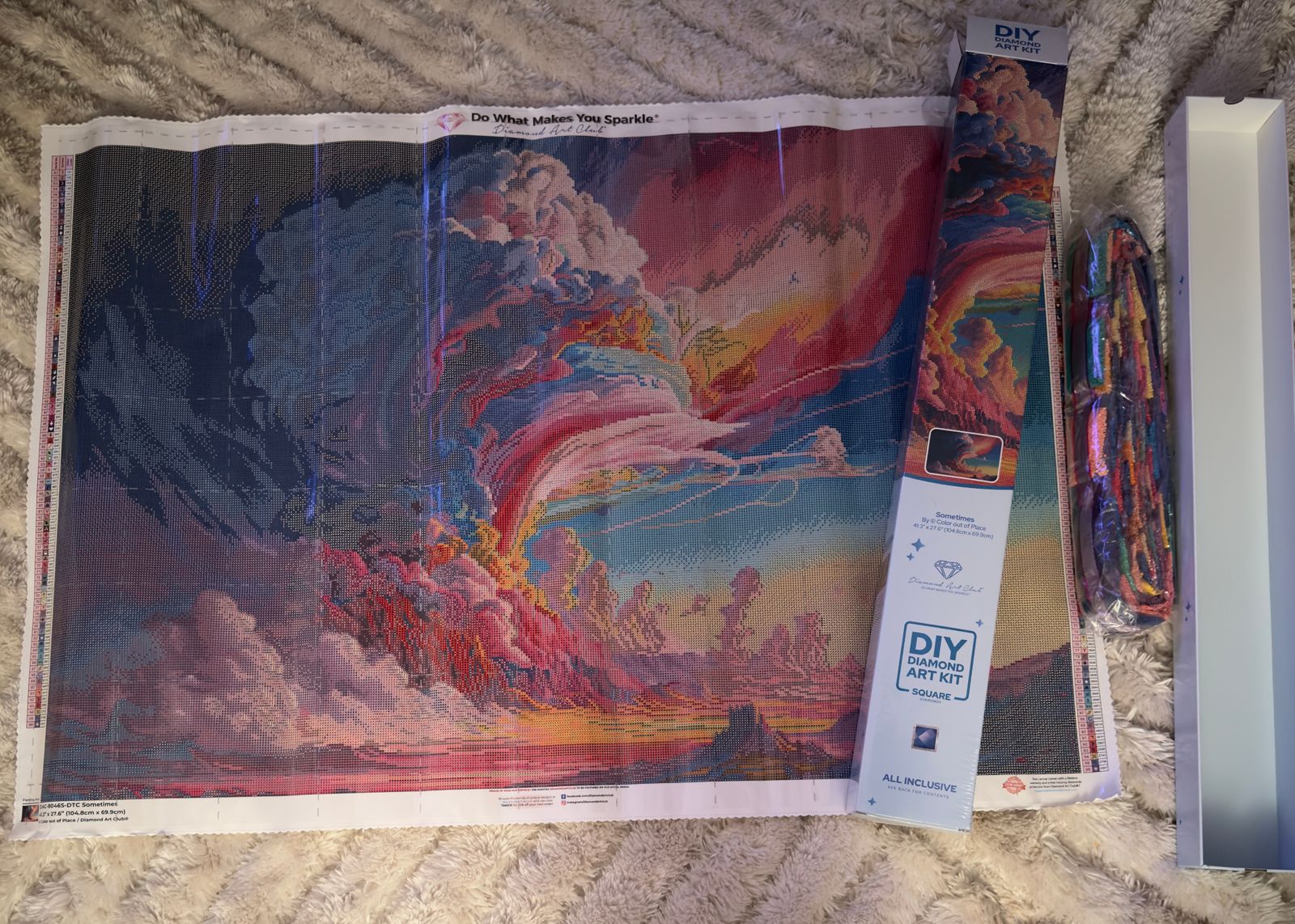 This was the largest diamond painting I’ve ever completed. As someone who works full time and is a caregiver, it took me 4 months to complete. There are several sections that have lots of color blocking that help you make progress quickly if you multi place. Would do painting again adding more AB drills. I love the bling!!