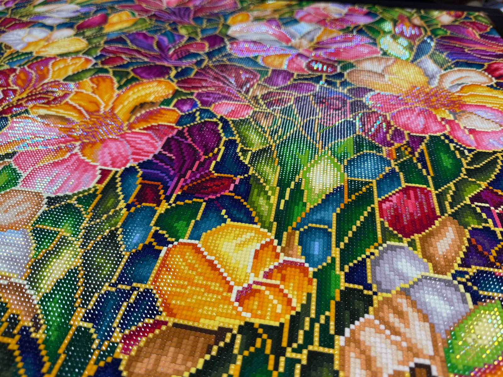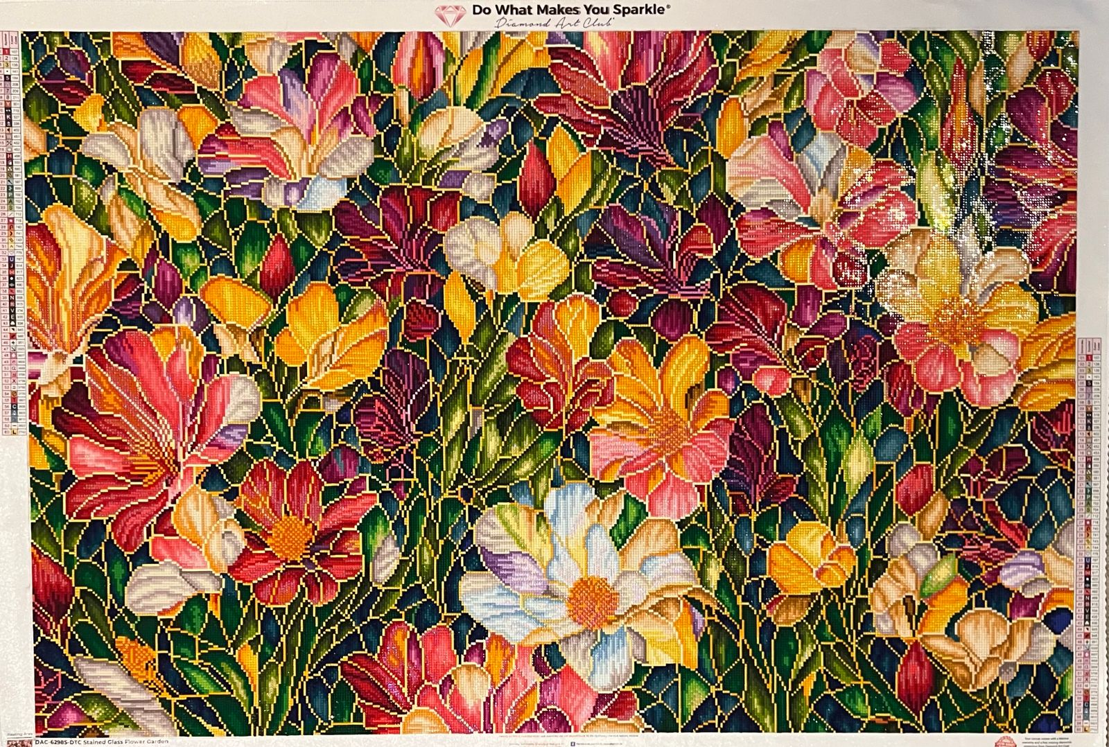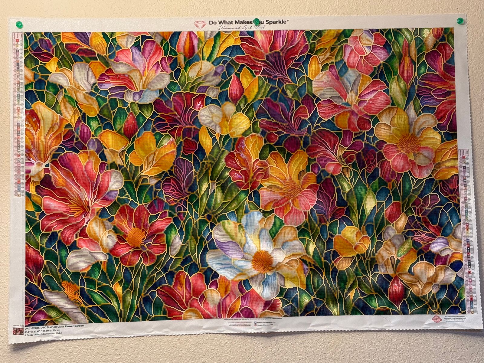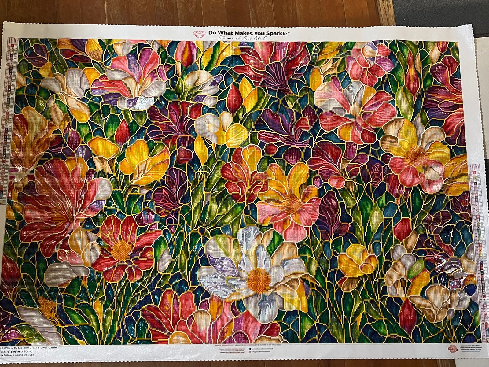 This extra large diamond painting is stunning and surprisingly easy to work being it was confetti heavy. In my approach, I used cover numbered sheets and used a random number generator to select the next square. There were more than enough high quality drills. The canvas was sticky. The final product is sparkly and ready to hang up for Spring display. Really enjoyed working this painting.