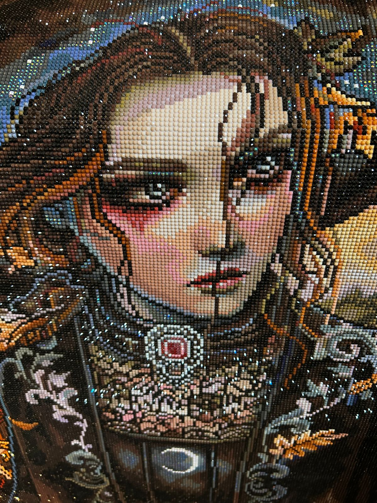 A perfect pick for fall and spooky season! A lot of dark tones but the color blocking made it a quick and satisfying project. The pastel background adds a lovely contrast, and the dark grey AB drills give it a subtle shimmer. I wish the red jewel on her neck had more special diamonds for extra sparkle, but overall, it’s a stunning and moody piece.
