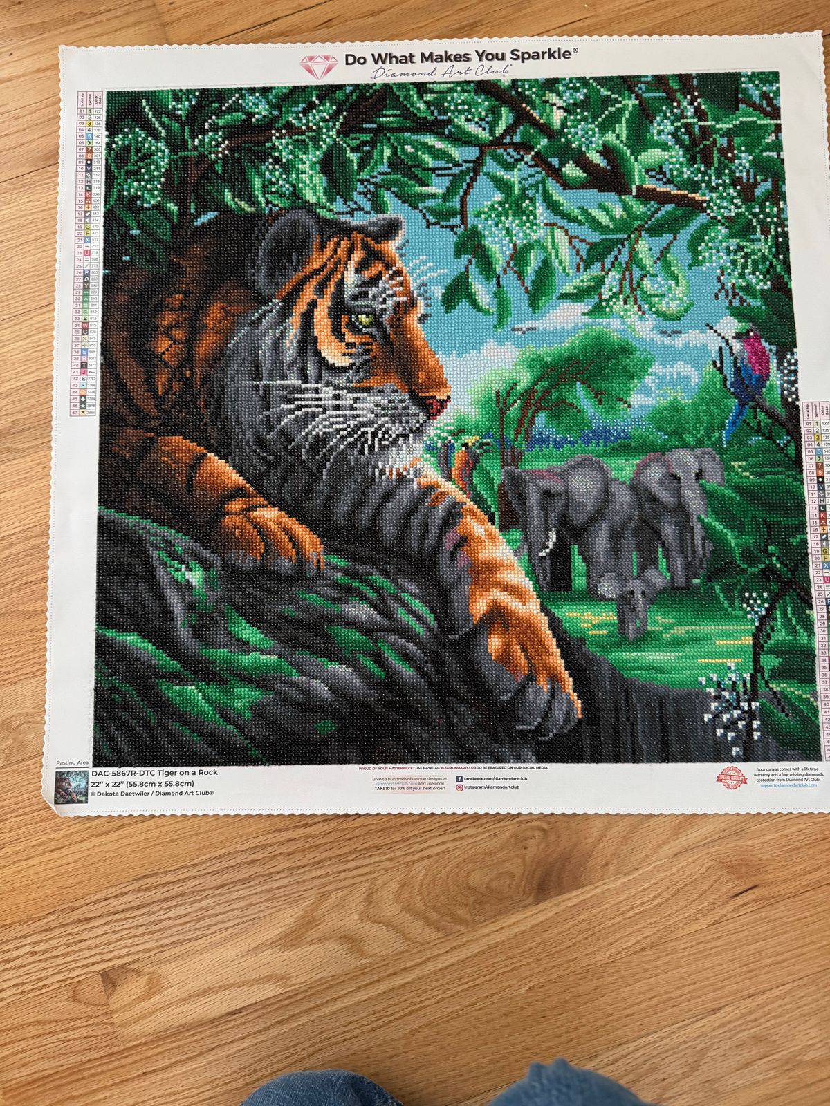 The handsome tiger was truly a joy to watch unfold on canvas. The AB drills added just enough bling to make the whole piece “pop”. Colors were perfectly blended to make the background scene very realistic. Very proud of this one!