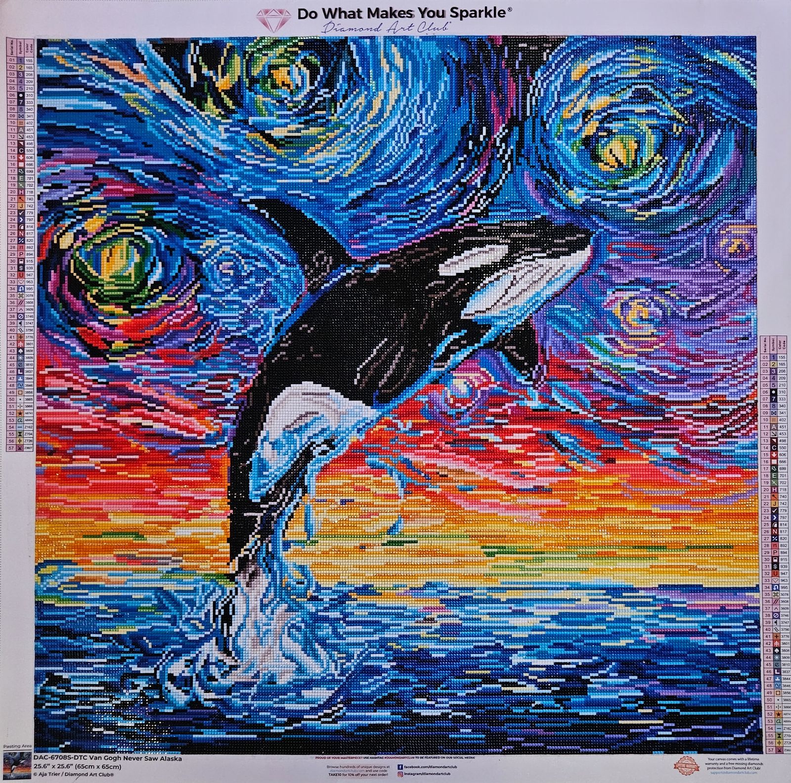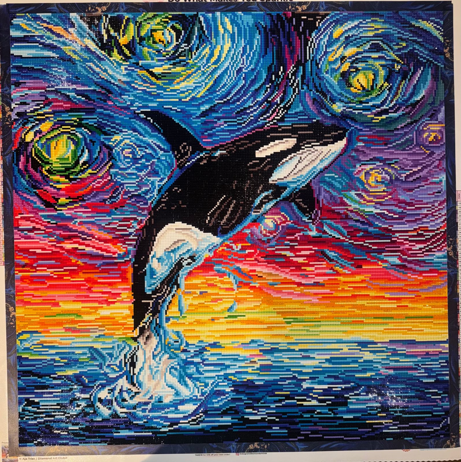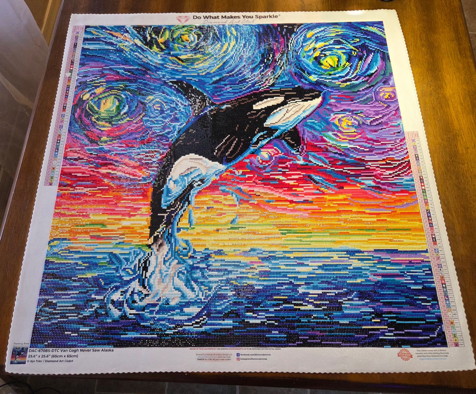 I bought this canvas to work on for my best friend as a gift. I kept it a surprise, she loves orcas and colors so this was perfect. This was my first dac complete, first squares painting completed, and absolutely stunning. I almost cried admiring it when I finished. Very challenging for a somewhat beginner but I loved that. Can't wait to start my next project.