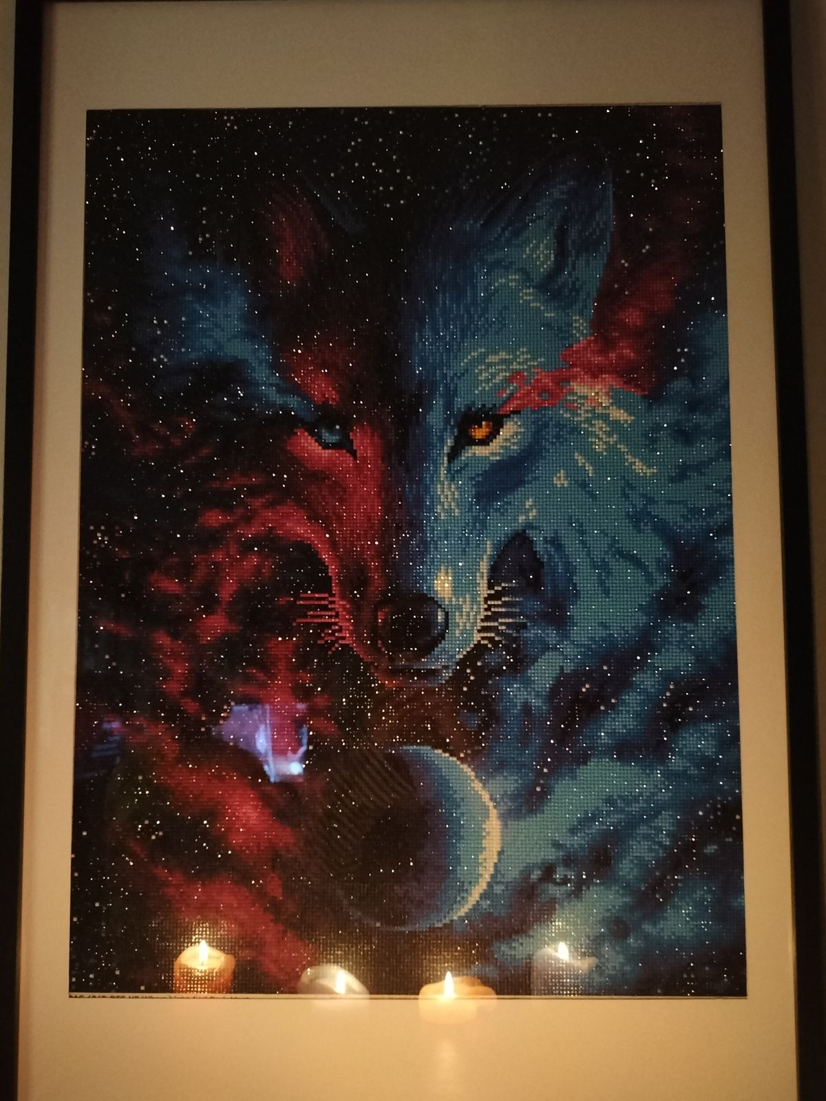 This was my first real project I did and what made fully fall in love the craft. I like wolves and the light/dark concept in all form so I loved this. Going on the wall for sure