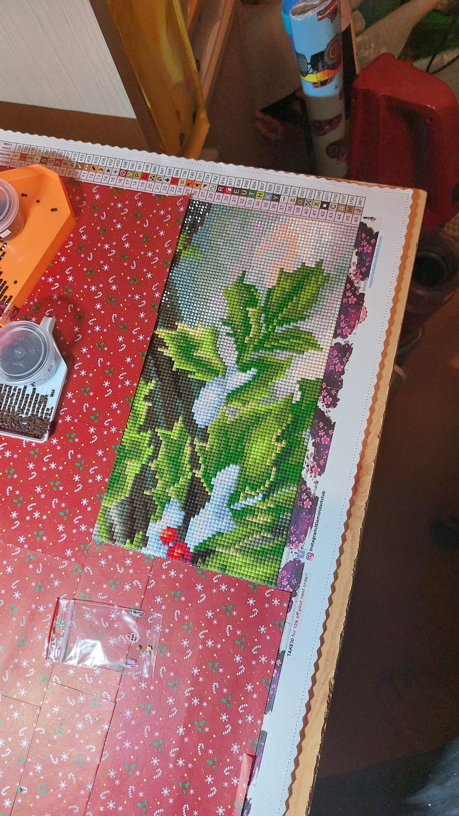 I only have the bottom sections and the next 2 done. So really very little, but the colors are magnificent. The berries look so real. I can't wait to get to the male Cardinal. Let's not lie I can't wait to see this framed and hanging on my wall. Goal is to hang it before Thanksgiving. Wish me luck.