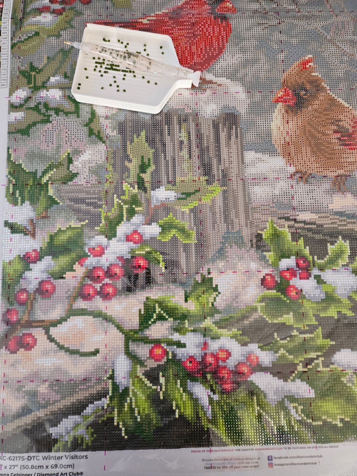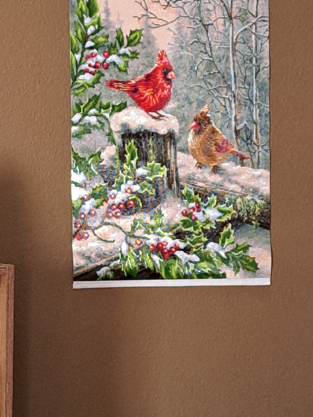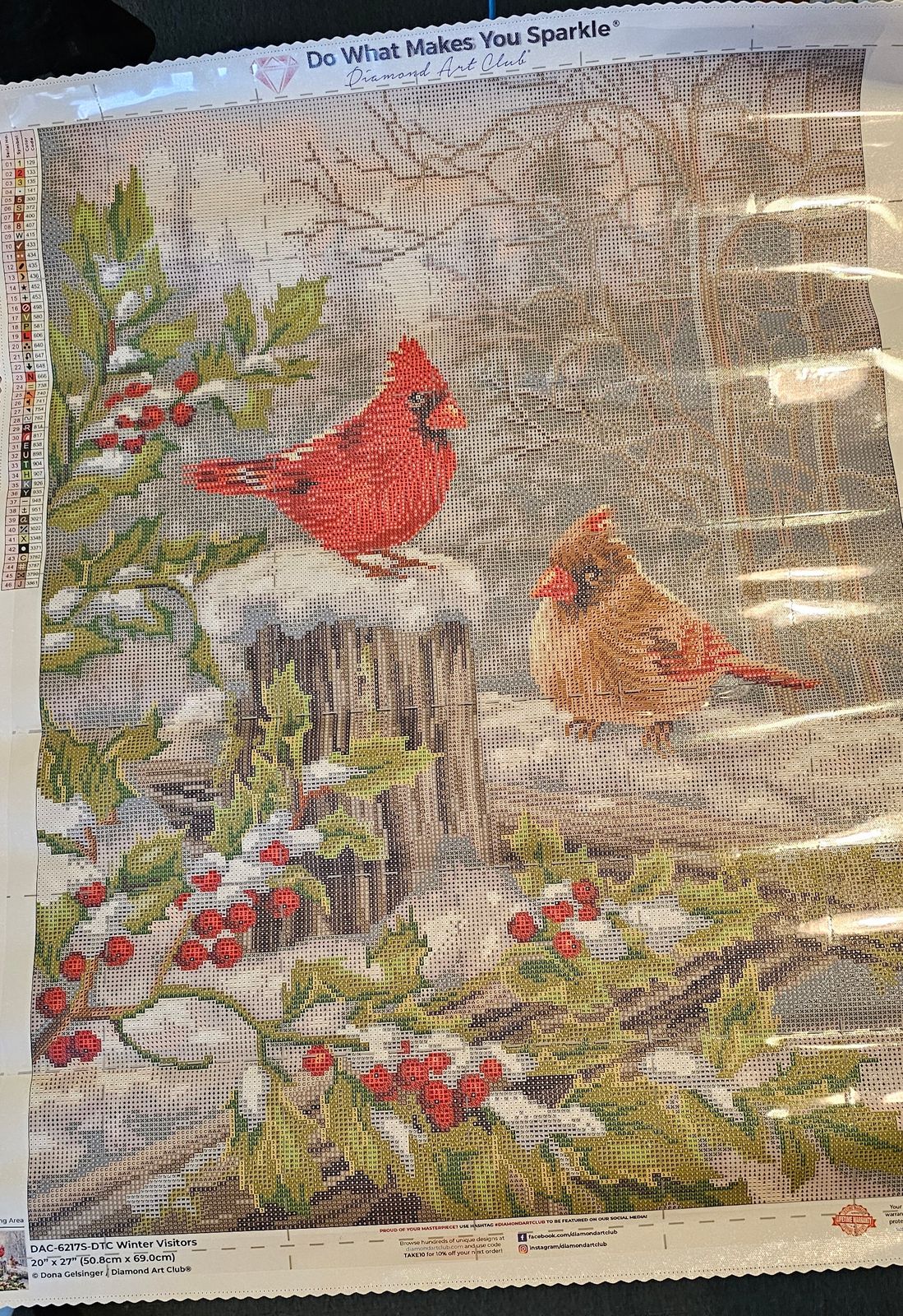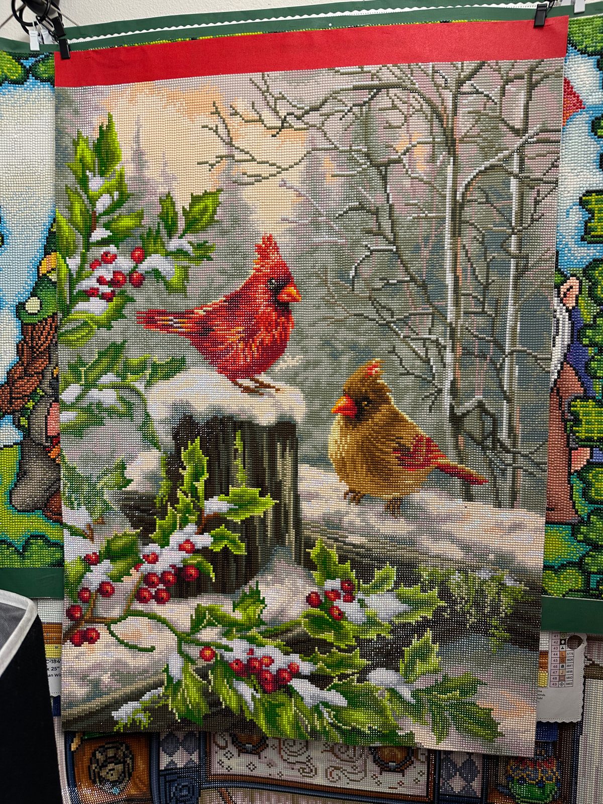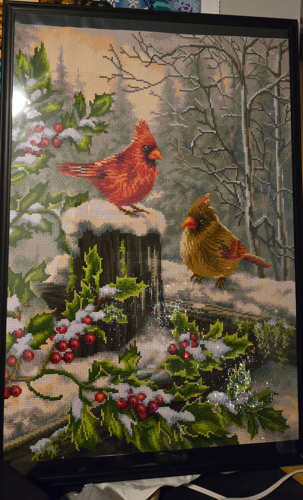 Just completed this canvas and enjoyed working on it. Very sparkly and wintery. Love the cardinals. The colors were very bright.
