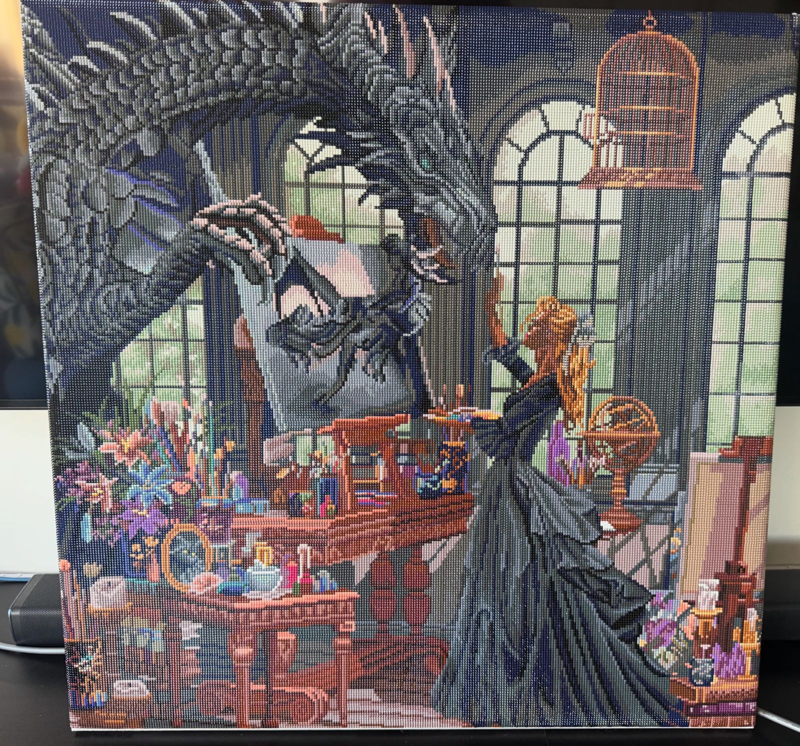 The artwork has a really cool vibe — a dragon in a bright, sunlit space, with those sharp scales and glowing blue eyes stealing the show. The colors pop, and it’s fun watching all the little details come together as you work. It’s a striking, fantasy-filled canvas that looks amazing finished.