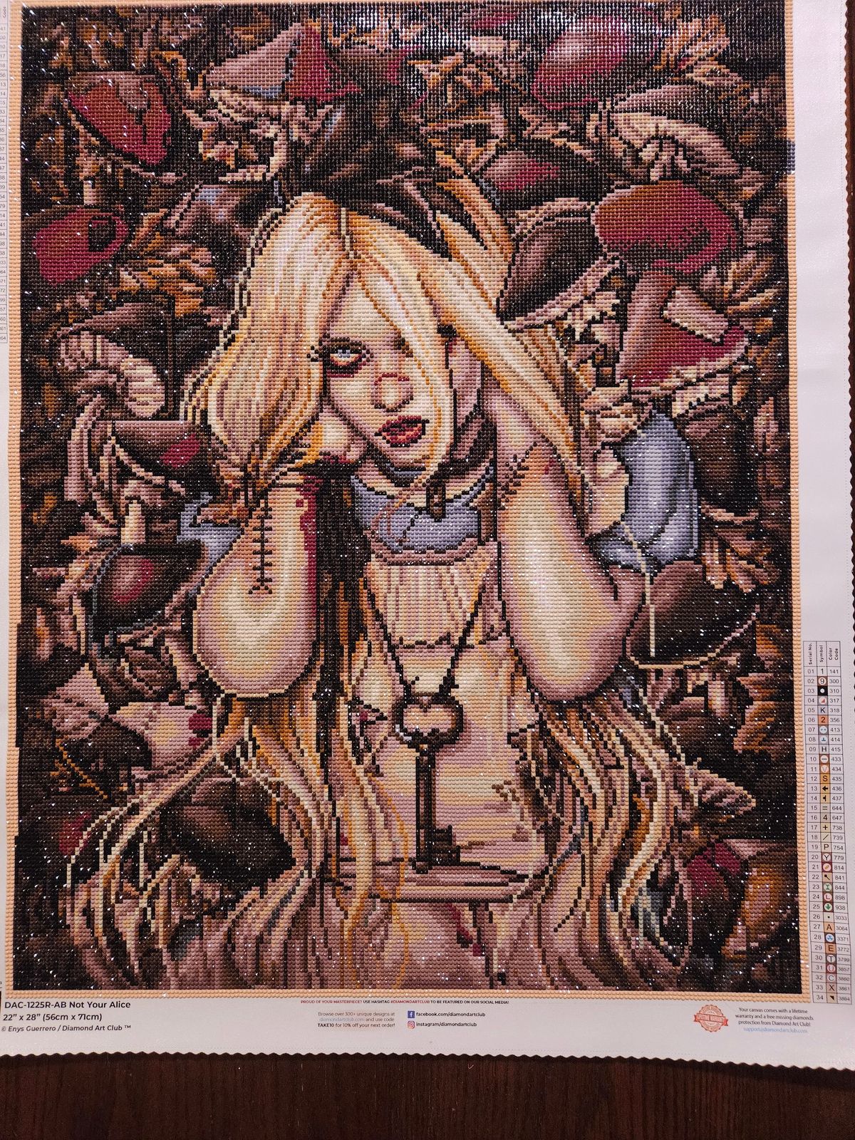 I like the dark side of things and this one was great in fulfilling that need. I was a little disappointed that the picture shows more redness on the arms than the actual diamond painting and the blood on Alice's apron was not as noticeable in the actual finished picture. But having said that, it still is an impressive diamond painting. It did not take long at all, less than a month, working on it for a couple hours a day. The round diamonds make fast work of the painting.