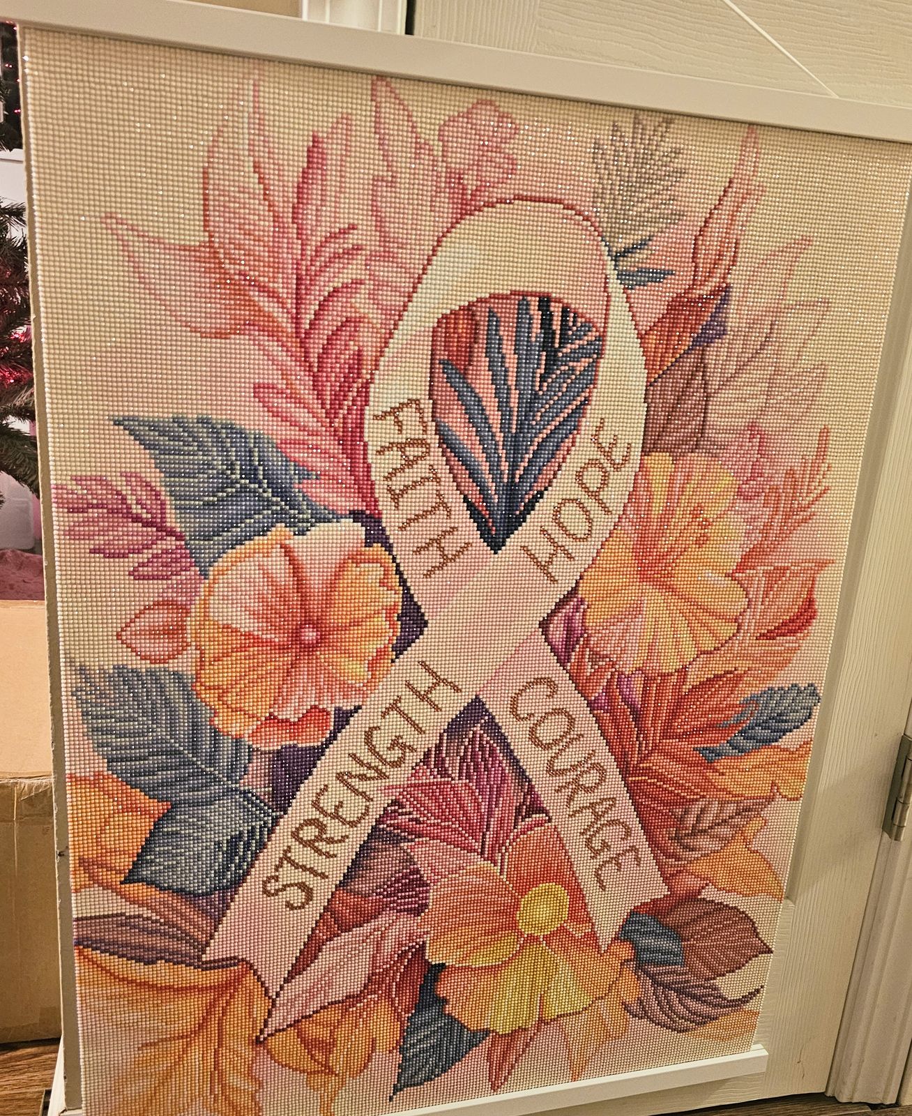 I completed this for my mom, a breast cancer survivor. I used a magnetic frame from Amazon and cut the edges so that she could easily hang it up. I think it turned out great.