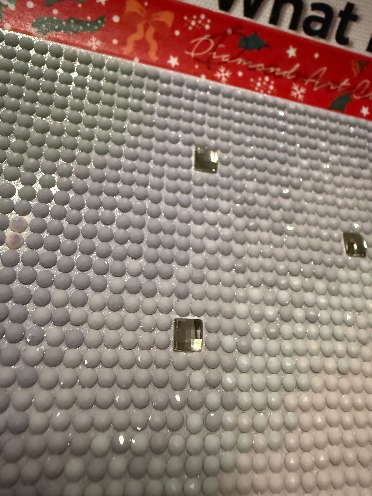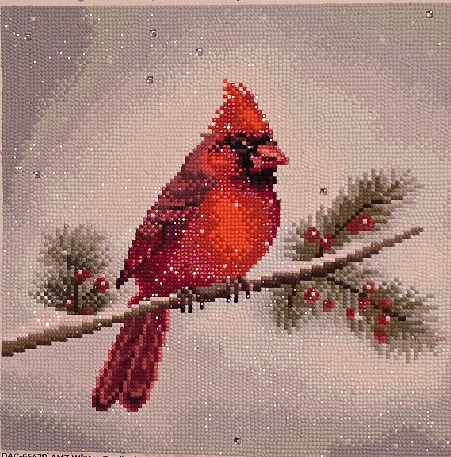 I recently completed a square drill, large size canvas and decided to do this one since it’s small and rounds. It’s very pretty! I didn’t care for the special large drills so I used white AB drills in their place. It does allow some of the number on the canvas to show, but I will cover that with white when I’m done. This one is lovely!