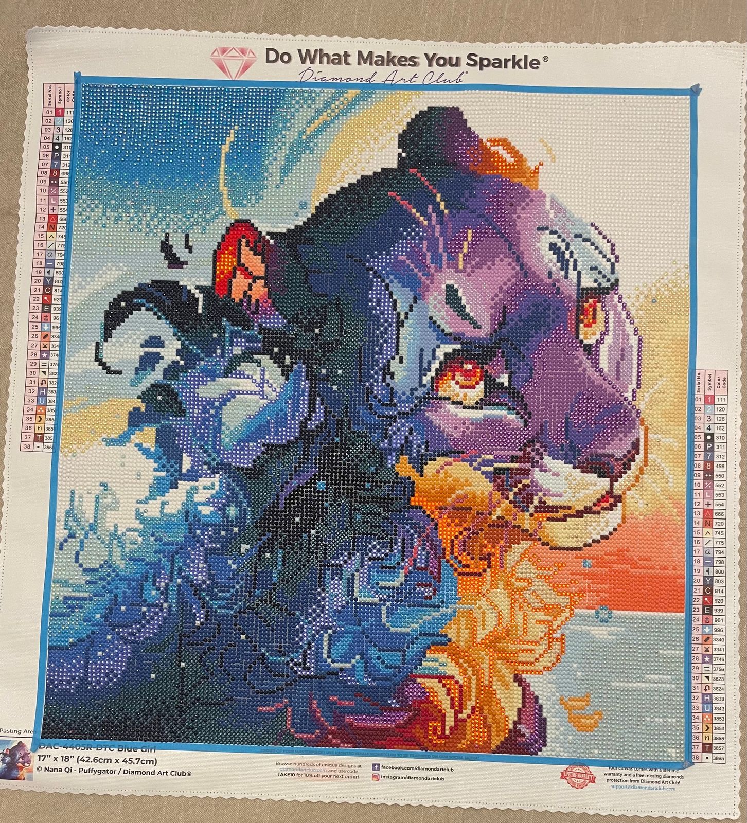 Blue Girl was a nice canvas to do after I finished a large square. There was lots of color blocking so it went very quickly. I love blue so the color palette was right up my alley. DP With Sparklers drills were used. I really enjoyed this one!