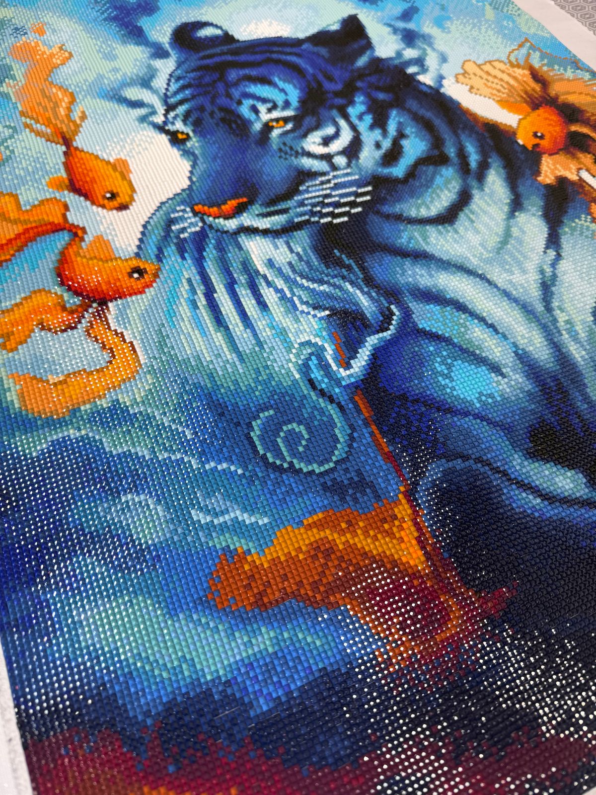My favourite images are animals in particular love the big cats. So this one fell right in my wheelhouse. As it is an older kit (published prior to DAC including AB's in kits) there are no special drills. I really do wish I was more creative then I actually am, Spent a long time procrastinating about how to include some AB's and Fairy dust, but too many doubts about where to include them, so finally bit the bullet and did it anyway. I still very much like the way that it has turned out and would recommend if you like the image and working with blue drills. Also I wanted to mention I am a very slow diamond painter and so whilst it did take me over 80 hours to complete, a normal diamond painter would take far less.