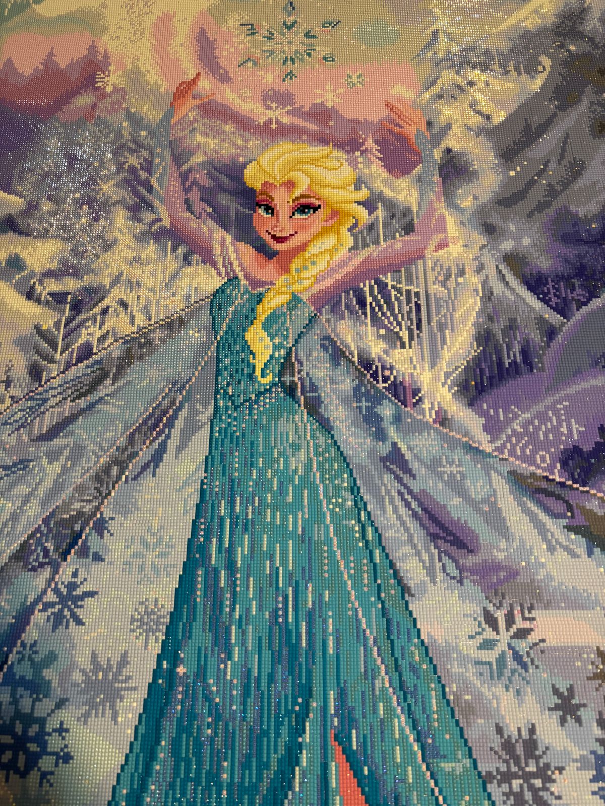 My daughter loves Elsa so I had to do this diamond painting. The painting has a really nice mix of blocking and confetti. It turned out amazing and my daughter loves it.