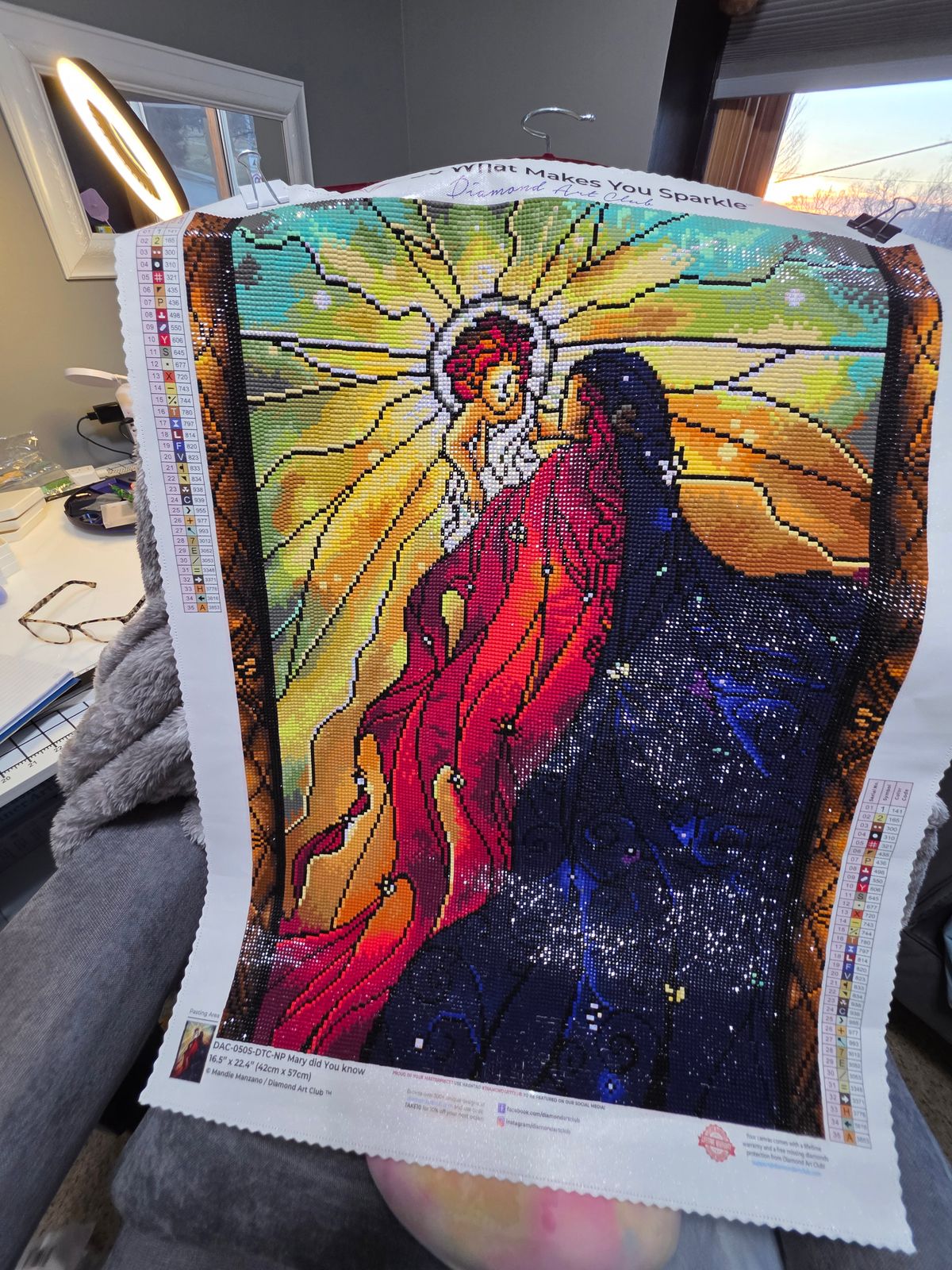 I love this artwork and it turned out beautiful. I did find that the grid was tight in areas, however I have not yet mastered square drills yet. I had more than enough drills, but some of them were trashy. It is unfortunate that recently the website showed this painting as the final edition. I love the stained glass look and the meaning of this art. After getting halfway through, I ordered some more of Mandie Manzano's available work. I feel that she is so talented and creates masterpieces. I hope she will continue creating more Diamond art club pieces!