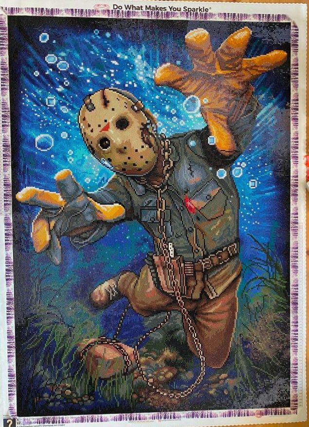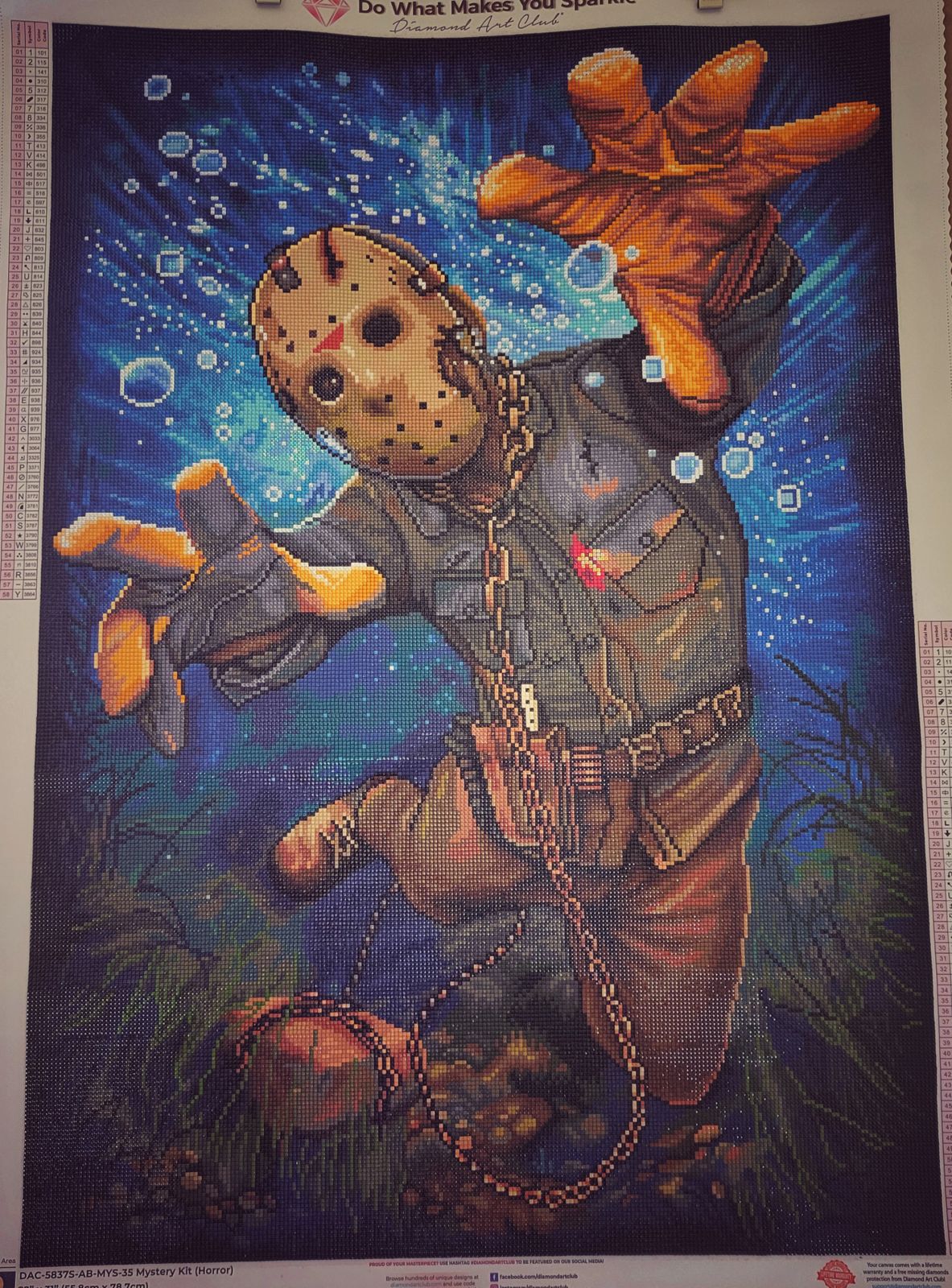 This image is amazing! The confetti was no joke but so worth it! So many blues, I saw shades of blue I never knew existed. The murky waters at the bottom to the clear blue at the surface is just rendered flawlessly. I love Friday the 13th and Jason is my fave villain. I'm so grateful I got this kit in my collection.