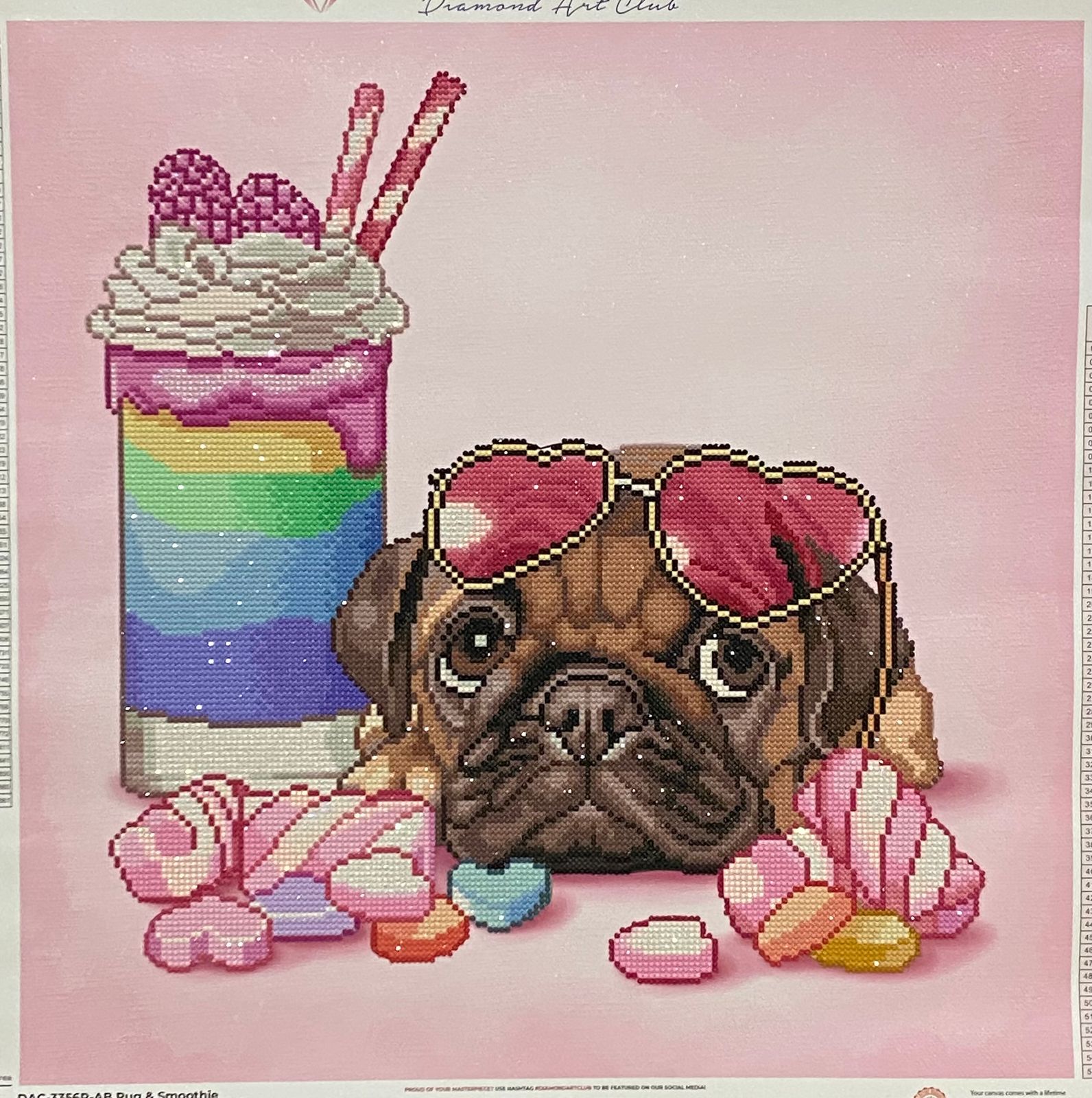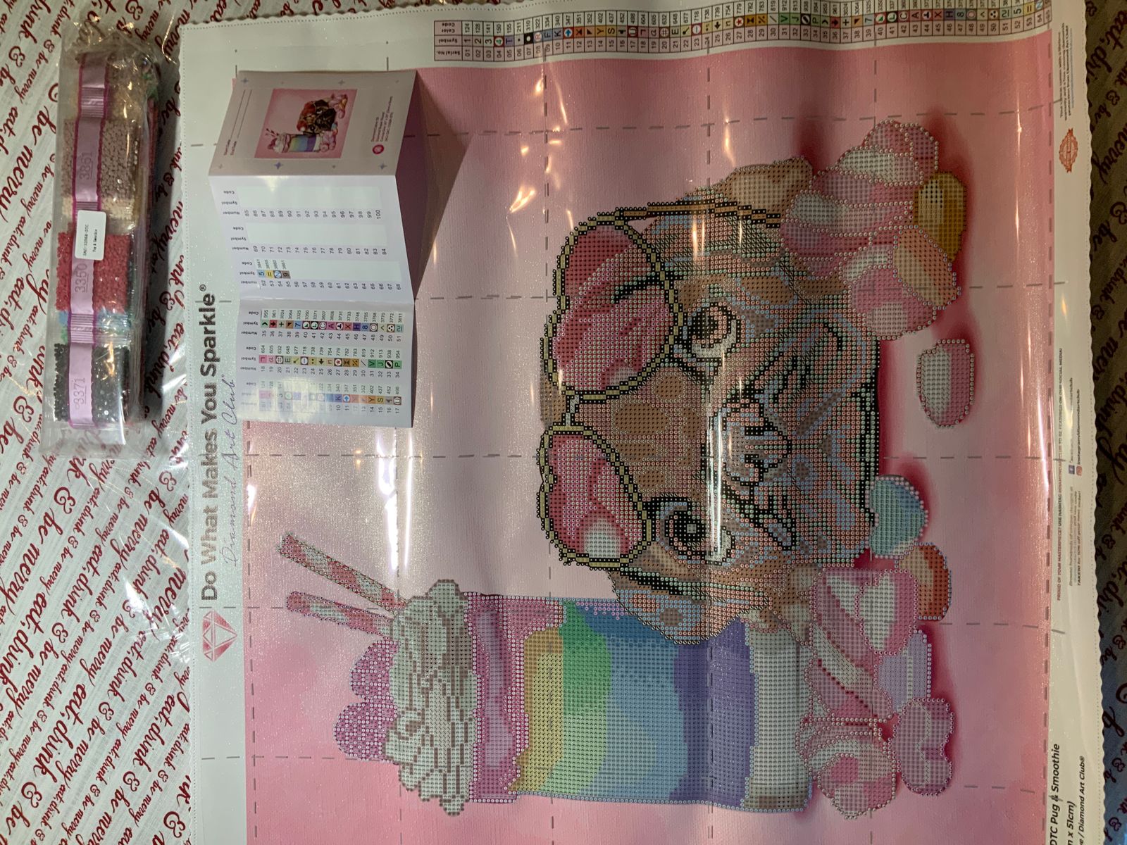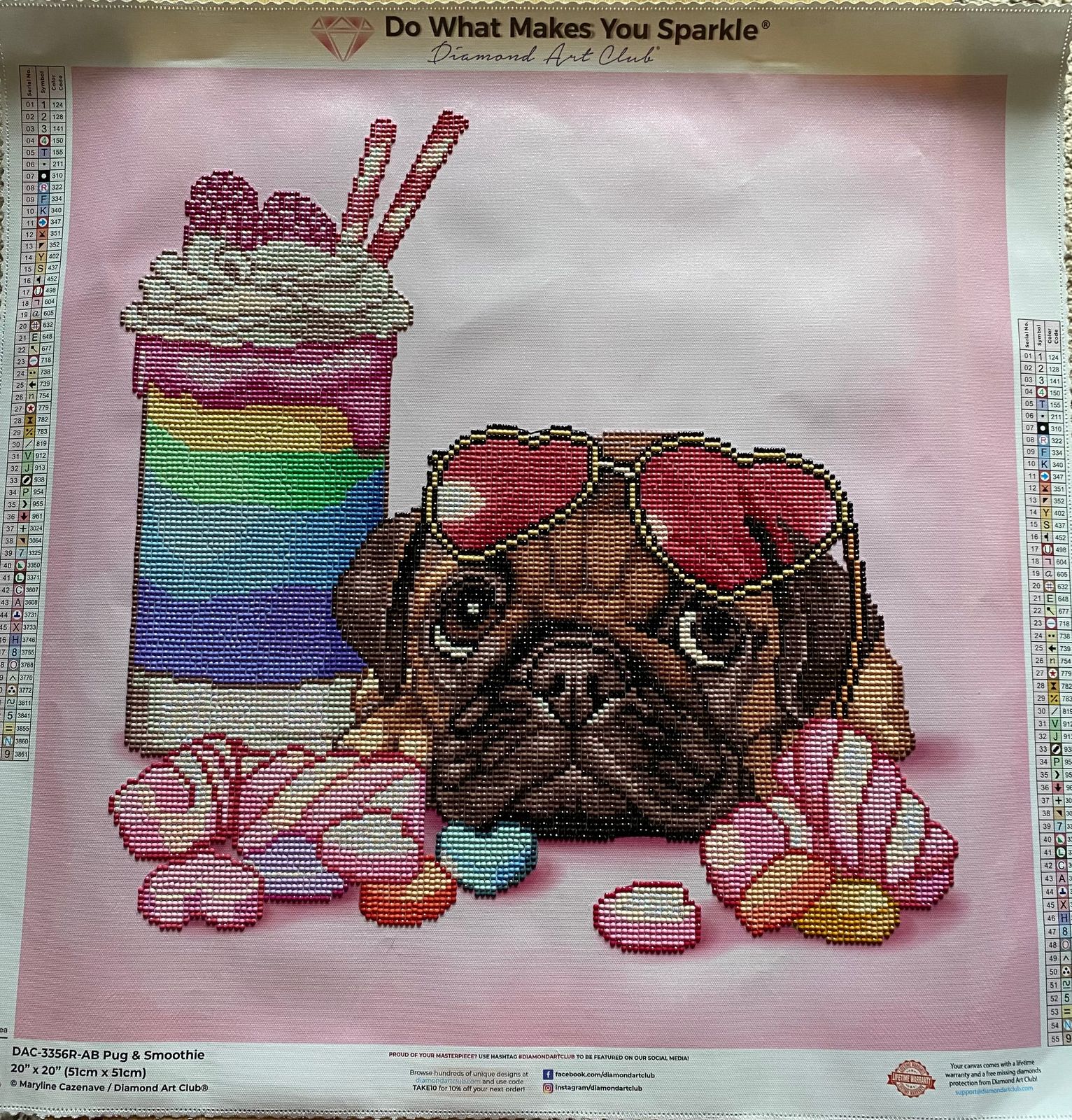 Love this pug. He looks like mine . Round drills 20 x20 pink back ground,drills in middle,nice colors.