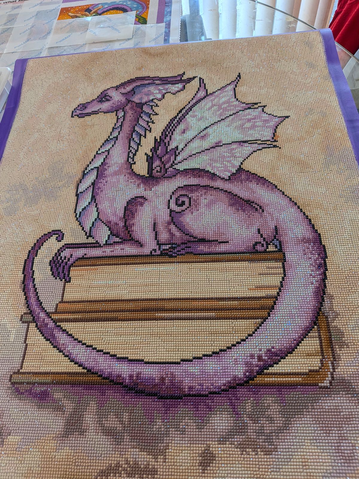 This has been my largest diamond painting so far and it turned out beautifully. The pictures really do not do this painting justice, the various shades of purple and the sparkle of the dragon is amazing.