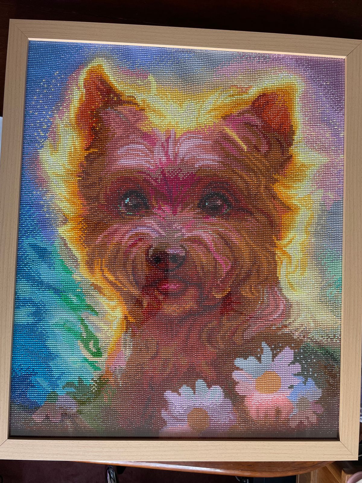 I ordered this art because of the beautiful coloring and was going to give it to my sister because she raised yorkies and hers all have pasted on to heaven .. Loved the white flowers and when I started the art the flowers are multi color and don't look like the picture.