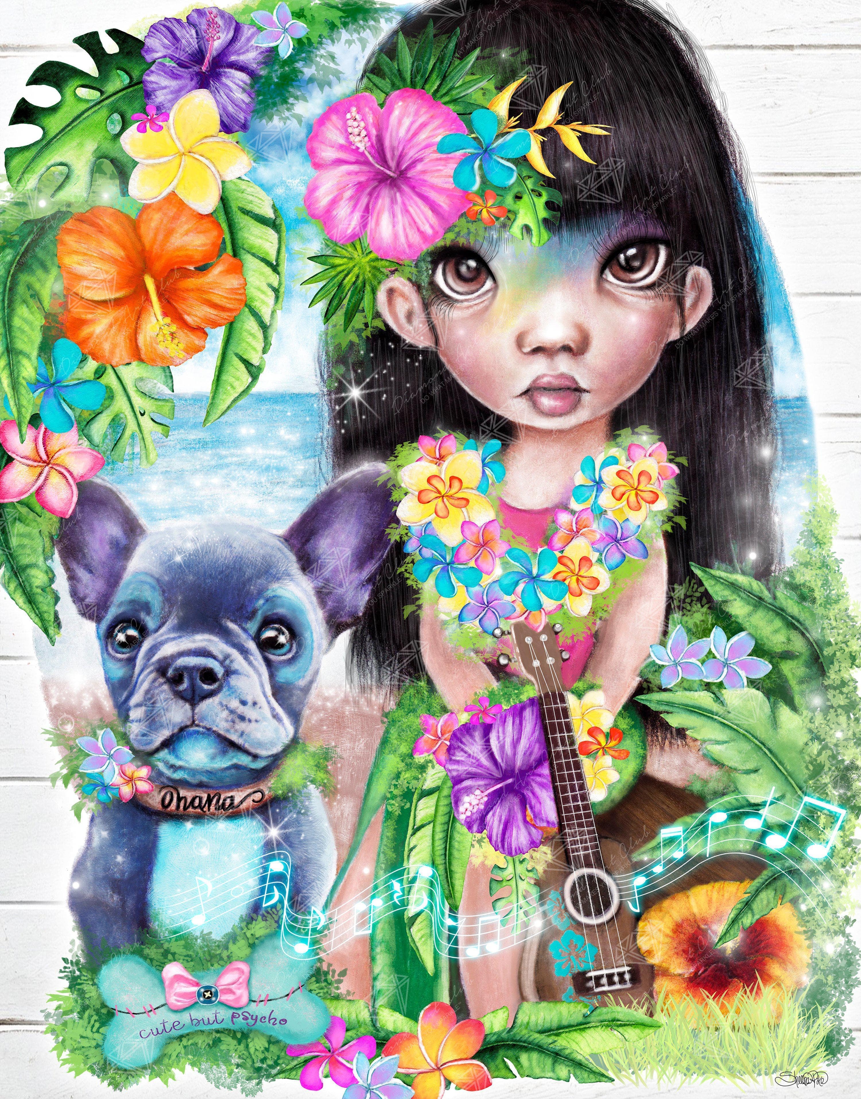 I got this because she reminds me of my little cousin who is a professional hula dancer, plays the Uke and has a French Bull Dog! I had allot of fun working with such beautiful colors, love everything about this painting!