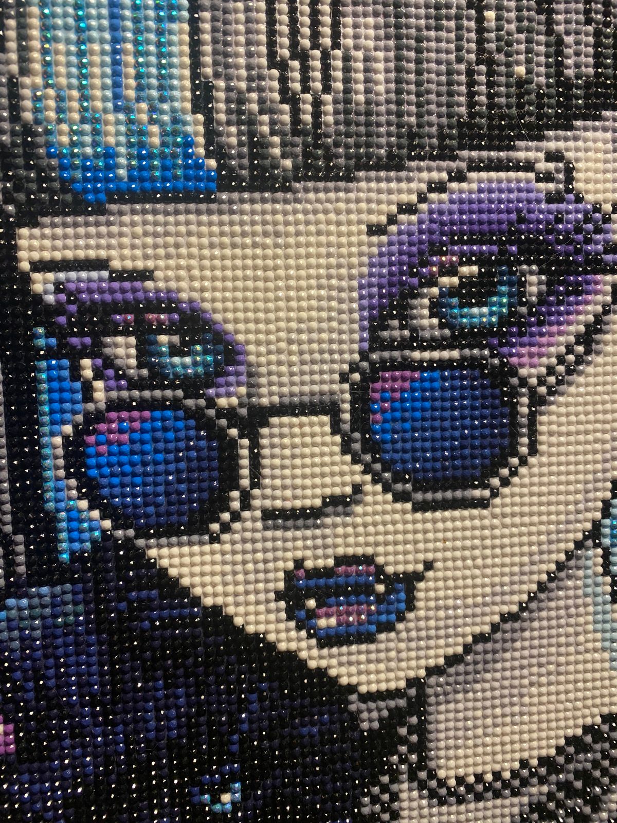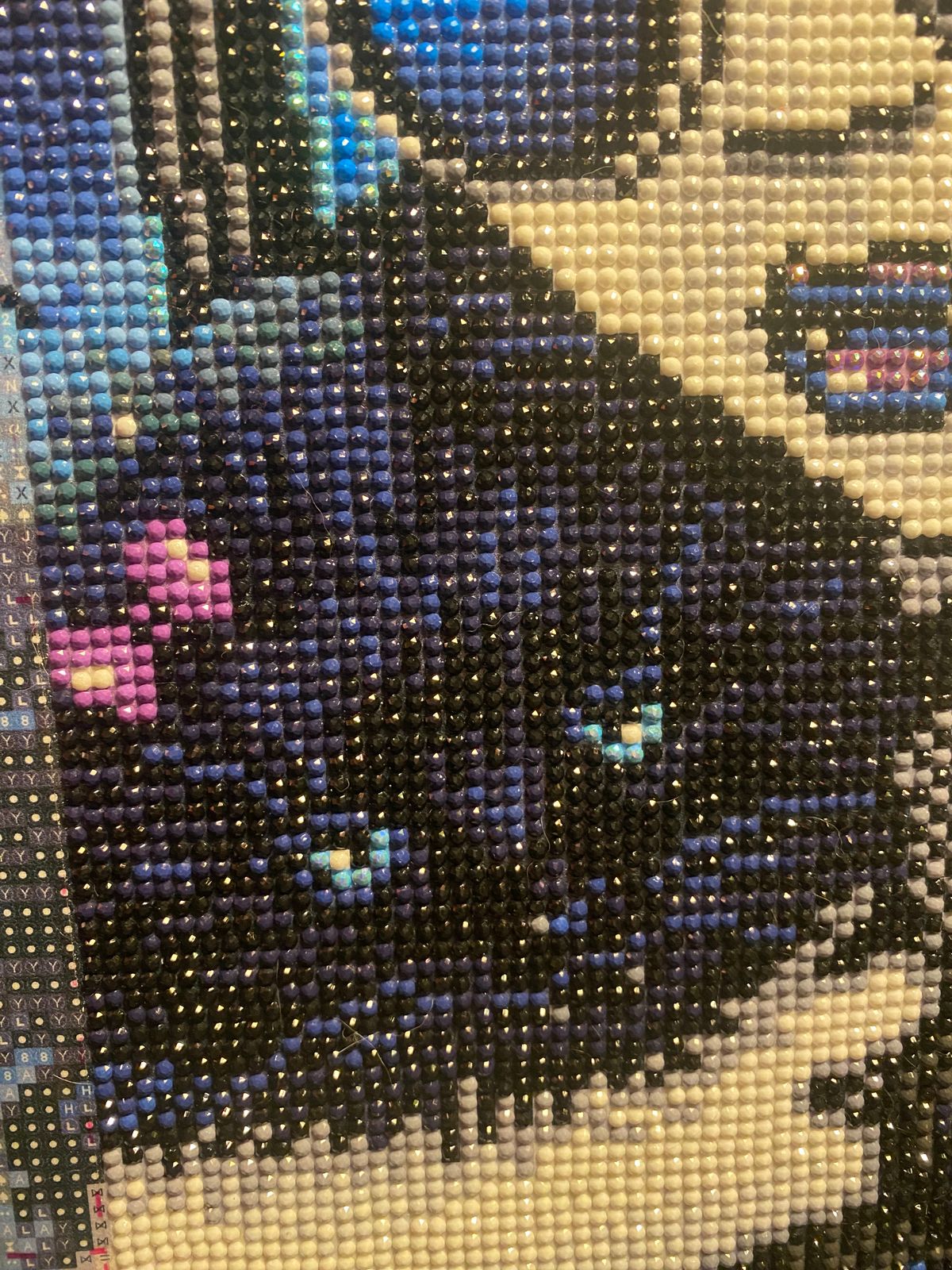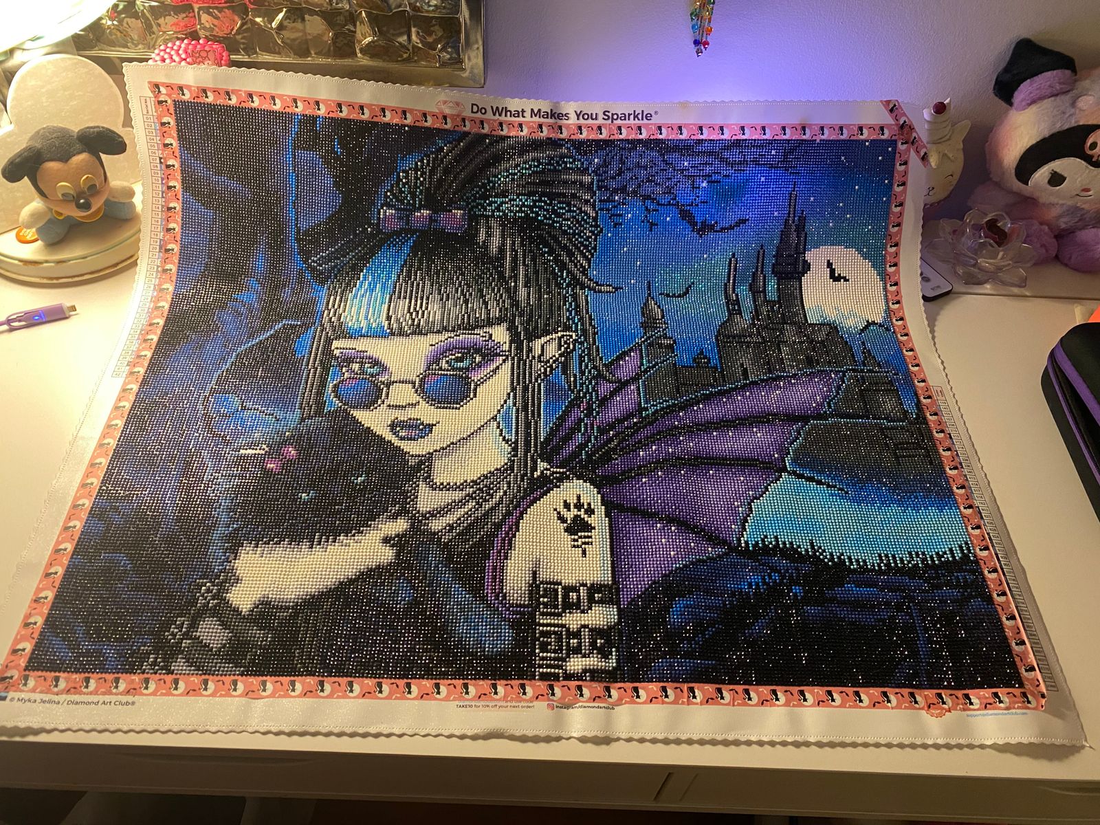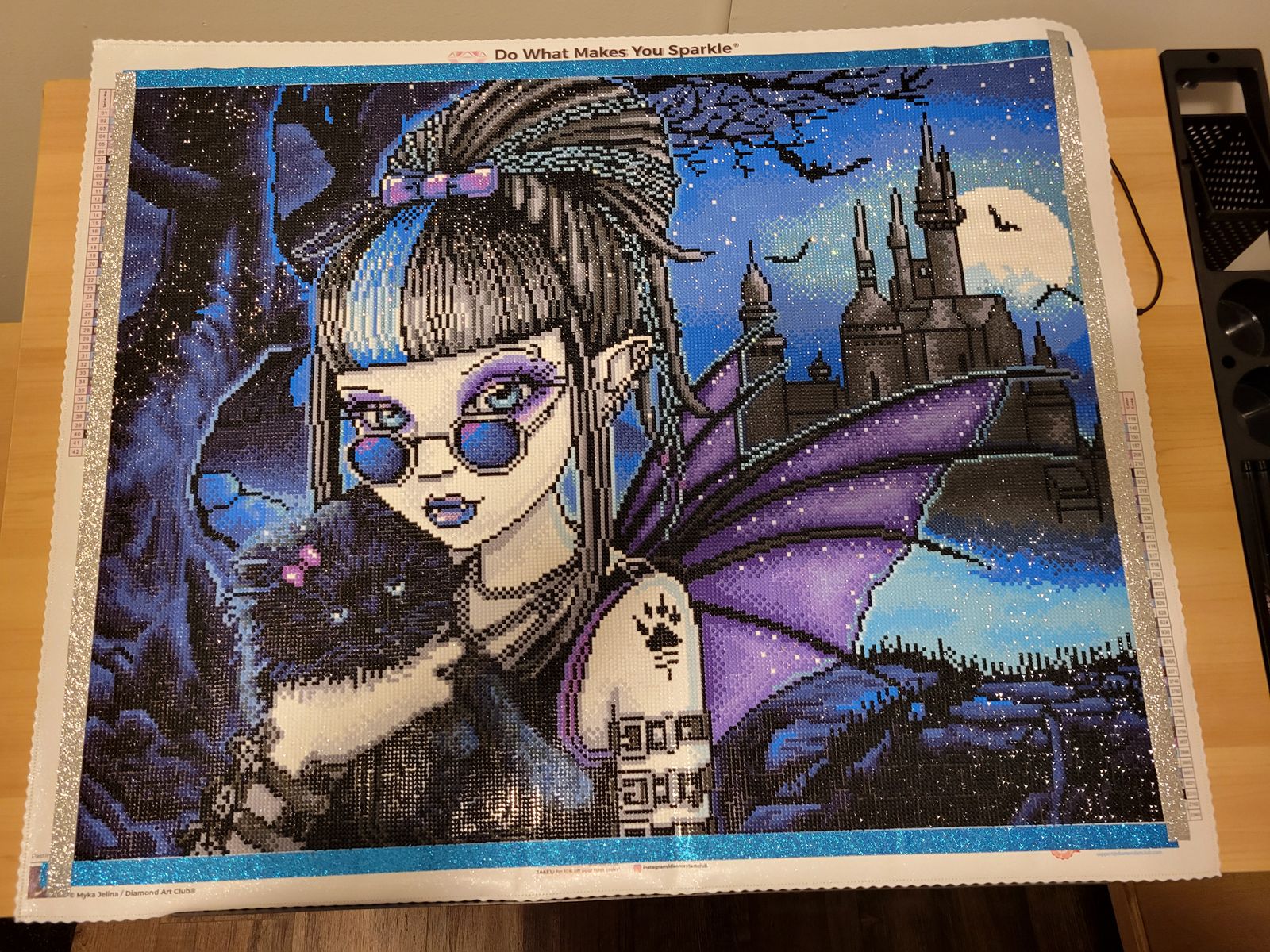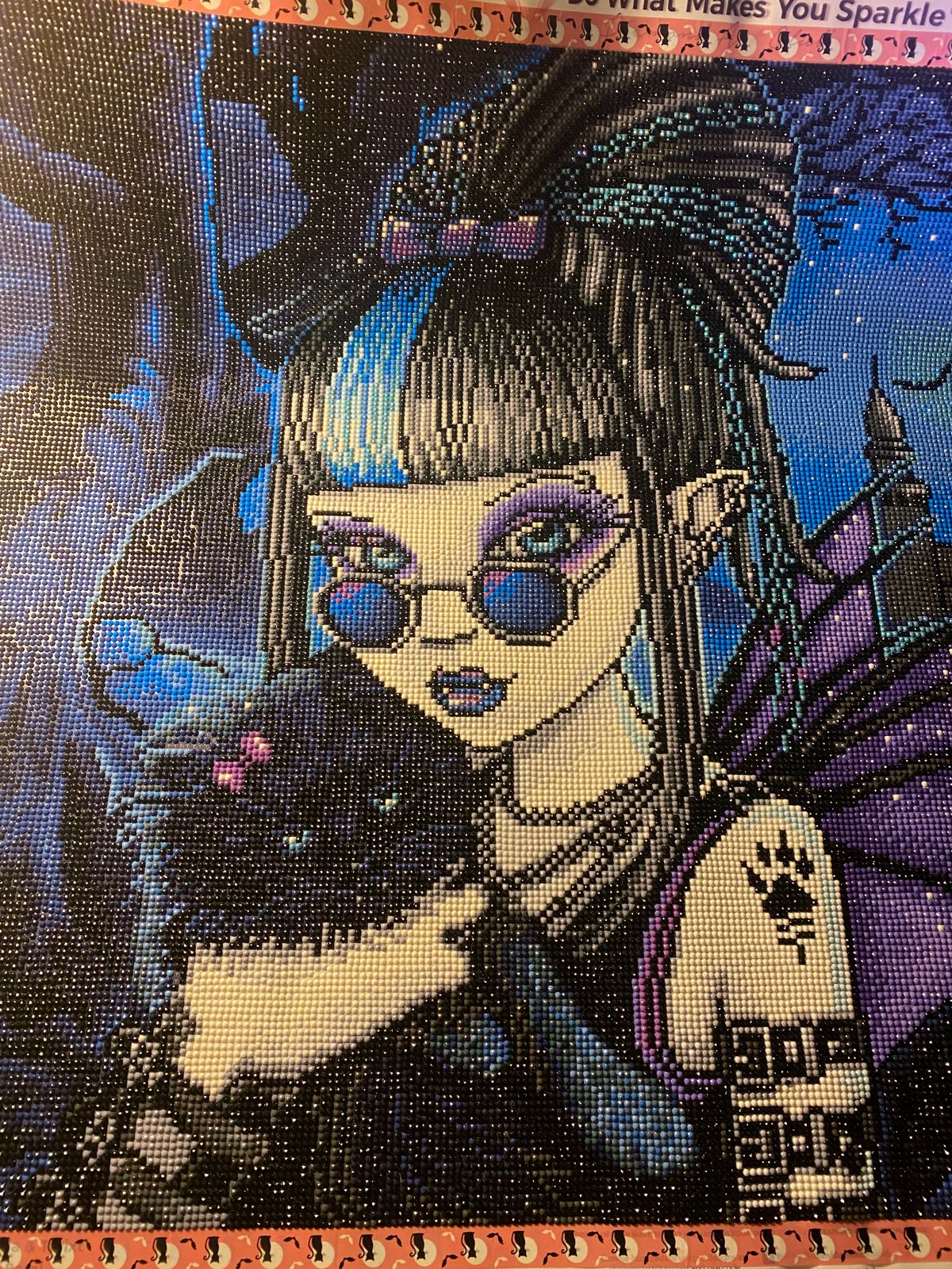 This was my very first full drill diamond painting ever & my first ever DAC kit & the biggest I’ve ever done! It’s SO beautiful, there are so many special drills! Blue AB’s, purple AB’s, baby blue fairy dust & white fairy dust as well as black glow-in-the-dark! The glow is in her paw as well as the lining of the buildings! Fairy dust in the moon, in her hair, in her makeup & AB’s in the outline of her wings. In her wings as well, in the background, in her makeup, lips & in her eyes as well as in the kitties eyes! I started October 10th & finished October 19th. I’m a beginner, but after this I can probably say that I’m a little more advanced. The round drills make it so sparkly! There’s a LOT of colour blocking & some confetti once you get to her face & hair. It is absolutely beautiful! Very happy I got this one! Didn’t have any trouble with it whatsoever!