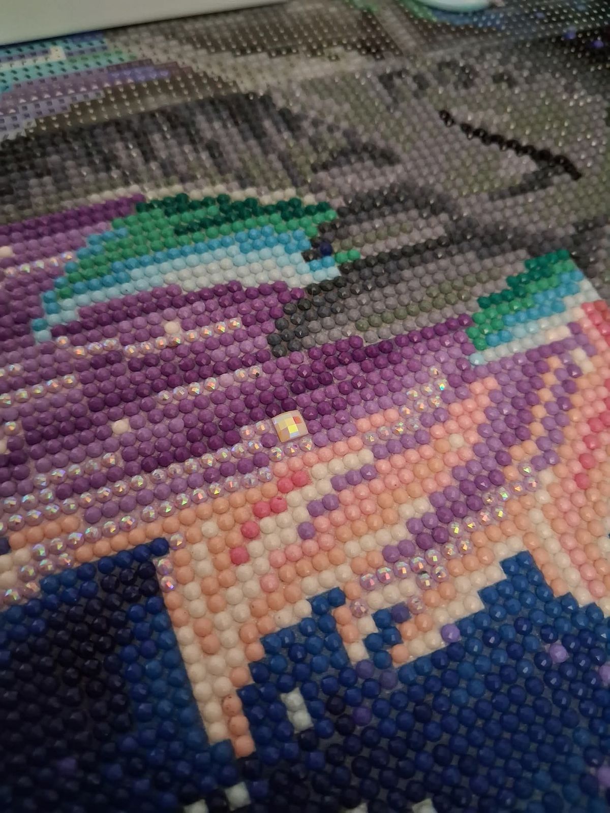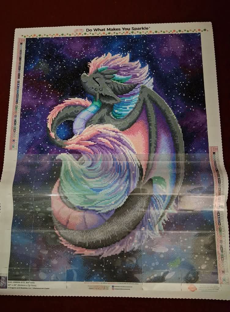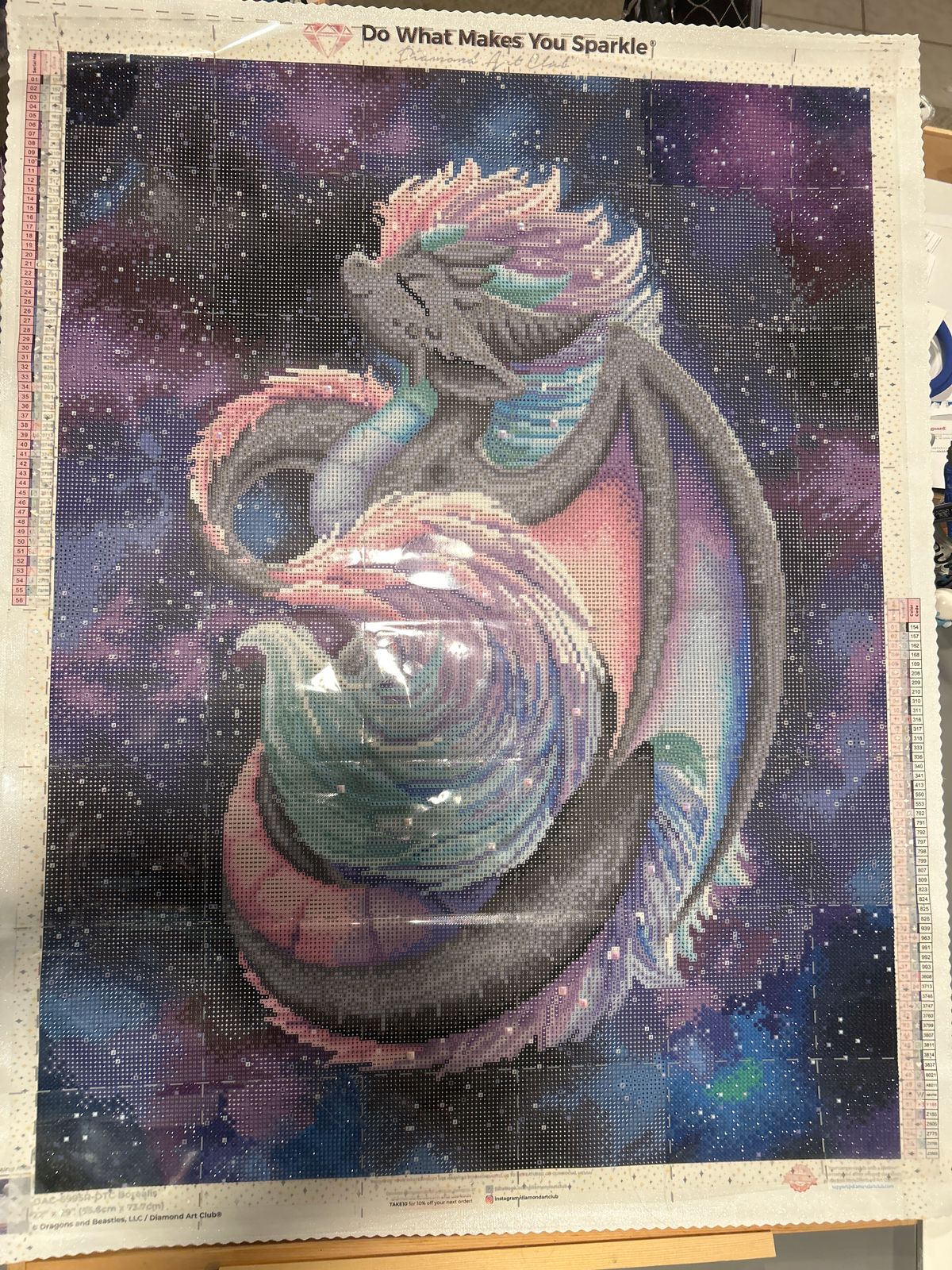 This diamond painting, “Borealis” by Dragons and Beasties from Diamond Art Club, is hands-down one of the most visually striking kits I’ve ever completed. The background is pure magic — the way the colors blend together gives such a rich, dreamy illusion of the night sky. The transition between purples, blues, and soft pinks is seamless and adds so much depth to the piece.