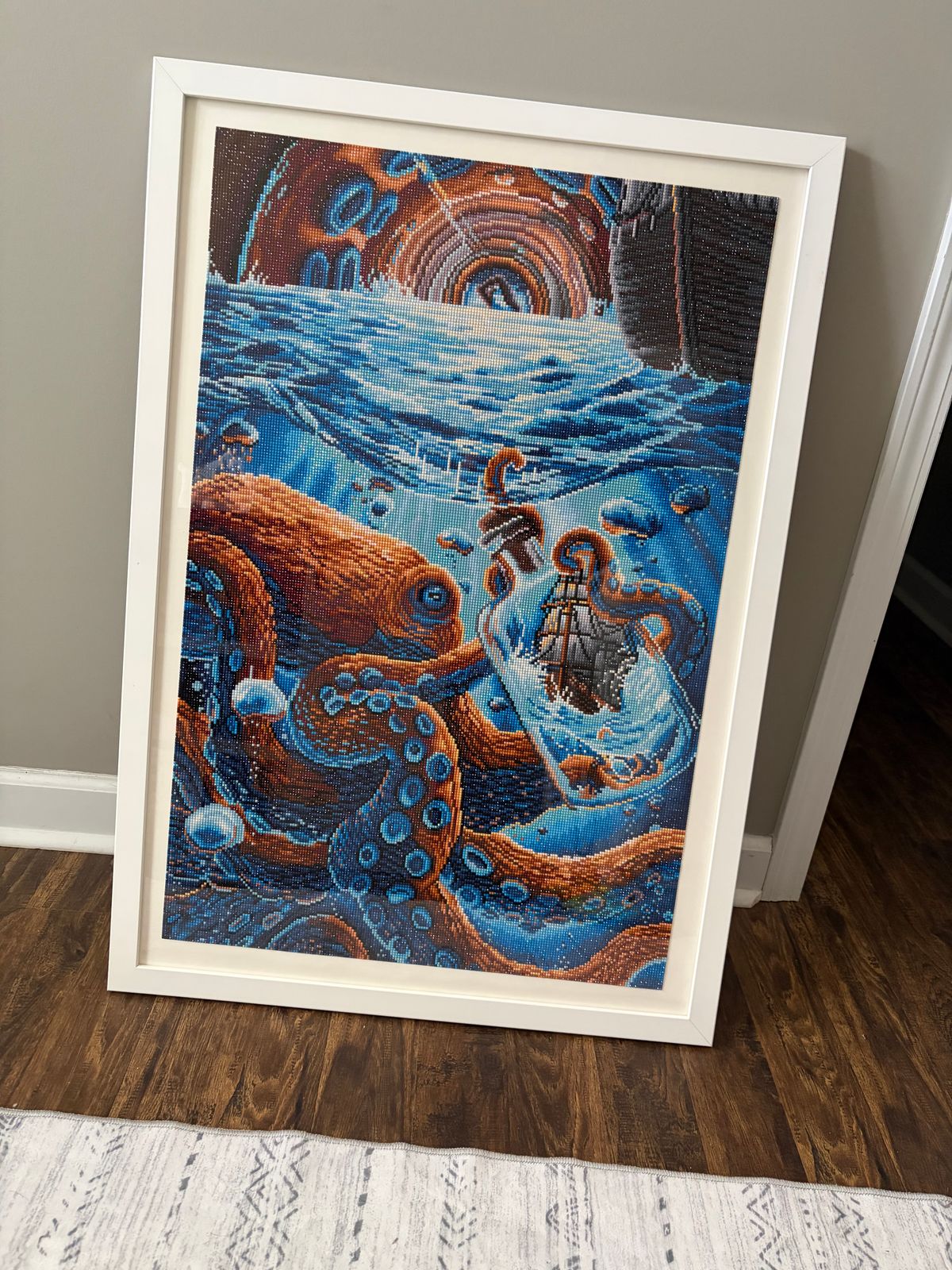 Ich habe das Bild gestartet und war bereits nach dem Setzen der ersten Steine total begeistert. Das Bild ist wunderschön, leuchtende Farben und die Steine sind wie immer in absolut bester Qualität. Nach nur wenigen Wochen (ich glaube es waren zwei) war das Bild fertig gestellt und ich erfreue mich auch heute noch an diesem wunderbaren Motiv. Natürlich habe ich von der Künstlerin auch die anderen beiden Kraken-Bilder und ich freu mich schon heute darauf diese demnächst anfangen zu können :-)