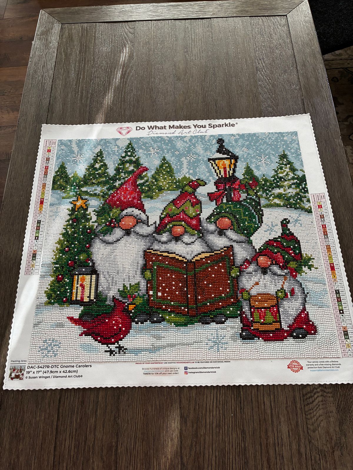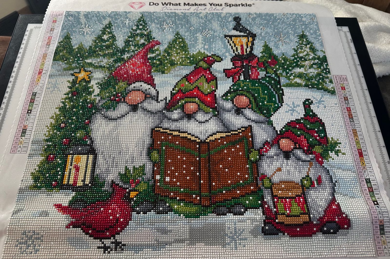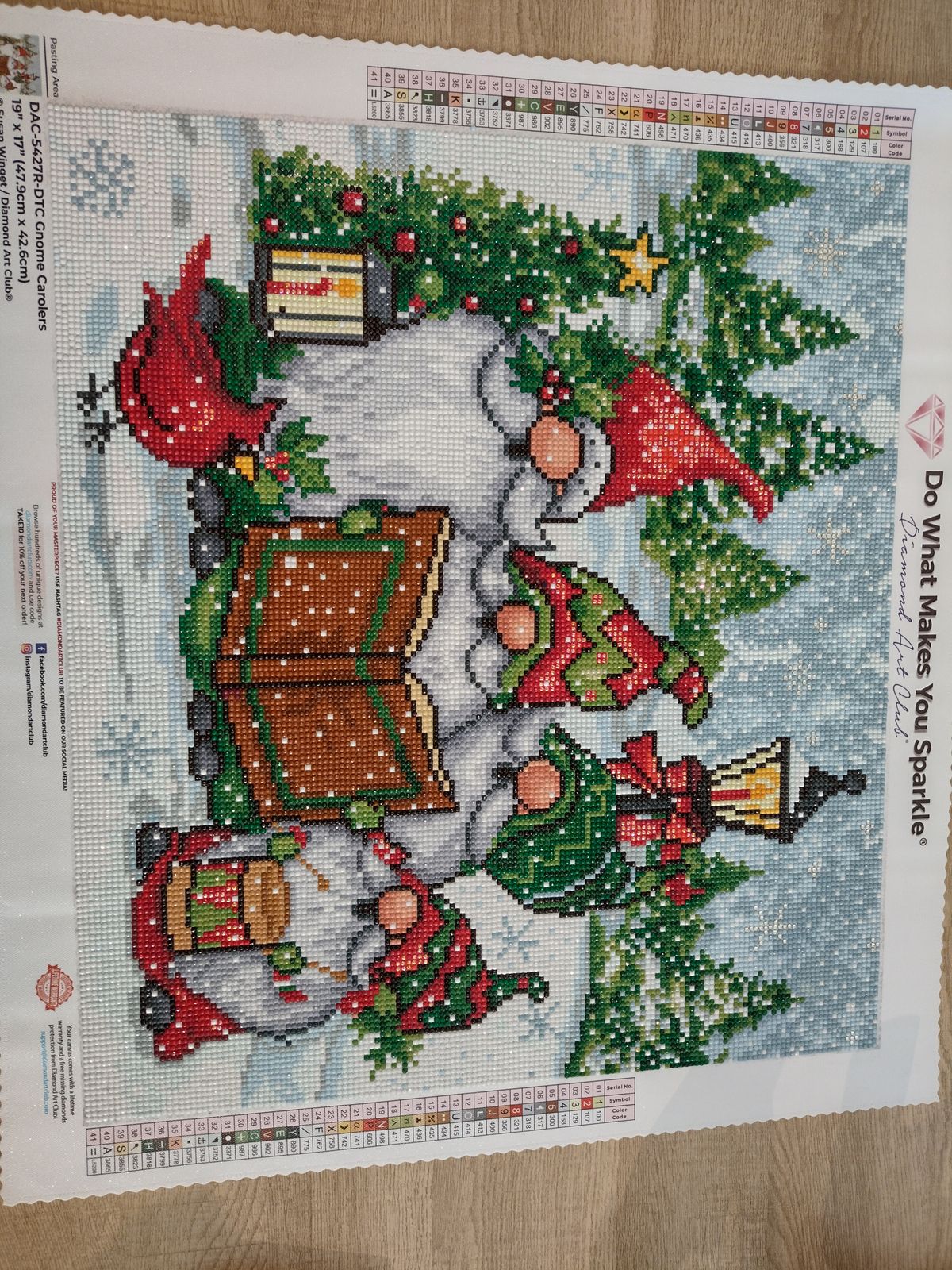 The quality of the Diamond Art Club kit was outstanding as always — clear symbols, perfectly sticky canvas, and sparkling drills that catch the light beautifully. The colors are rich and vibrant, especially the reds and greens, which make the whole piece pop.