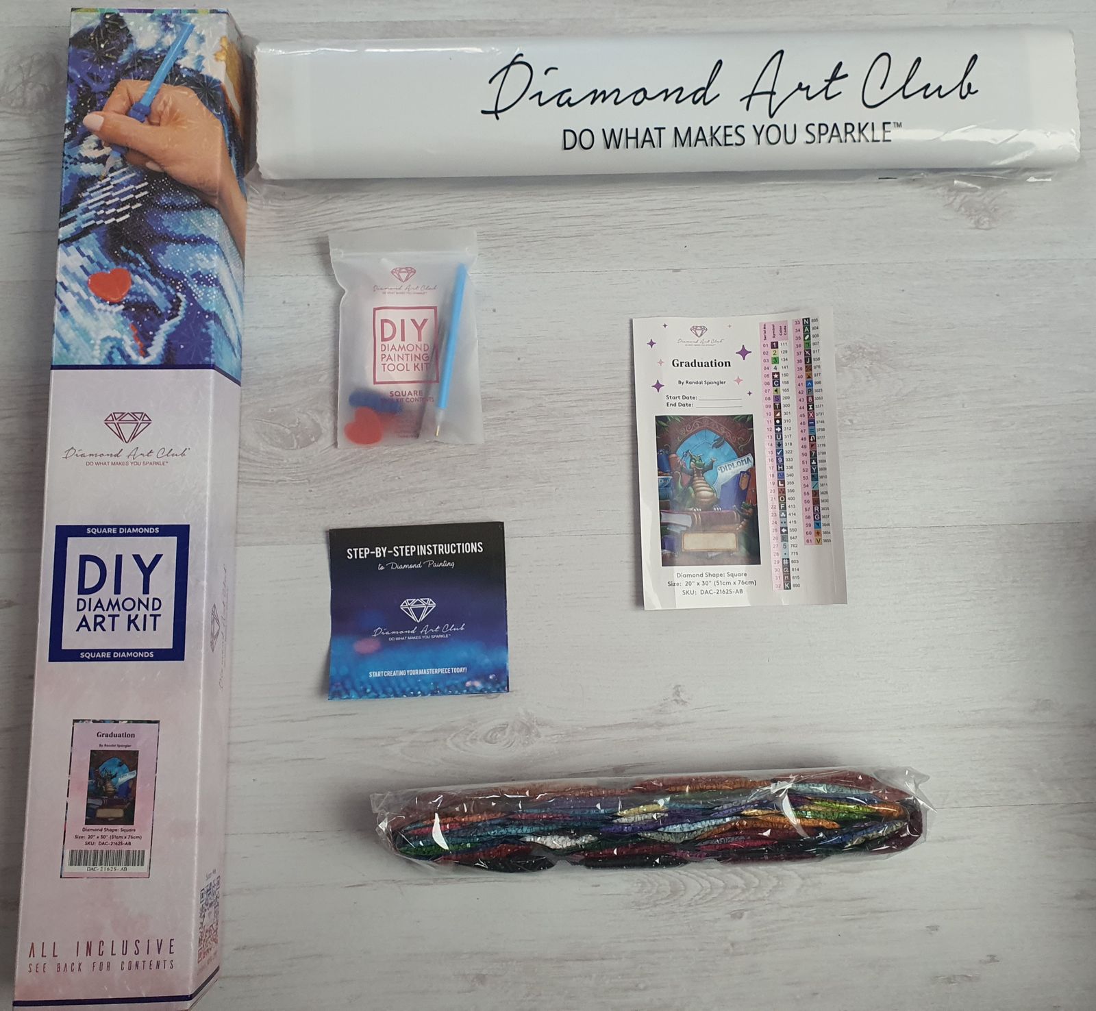 Canvas x 1, Diamonds, Tray x 1, Applicator + Grip x 1, Wax x 2, Tweezers x 1
